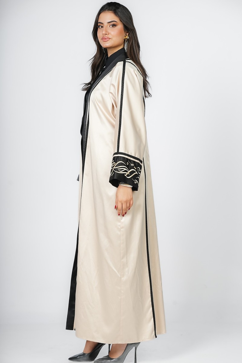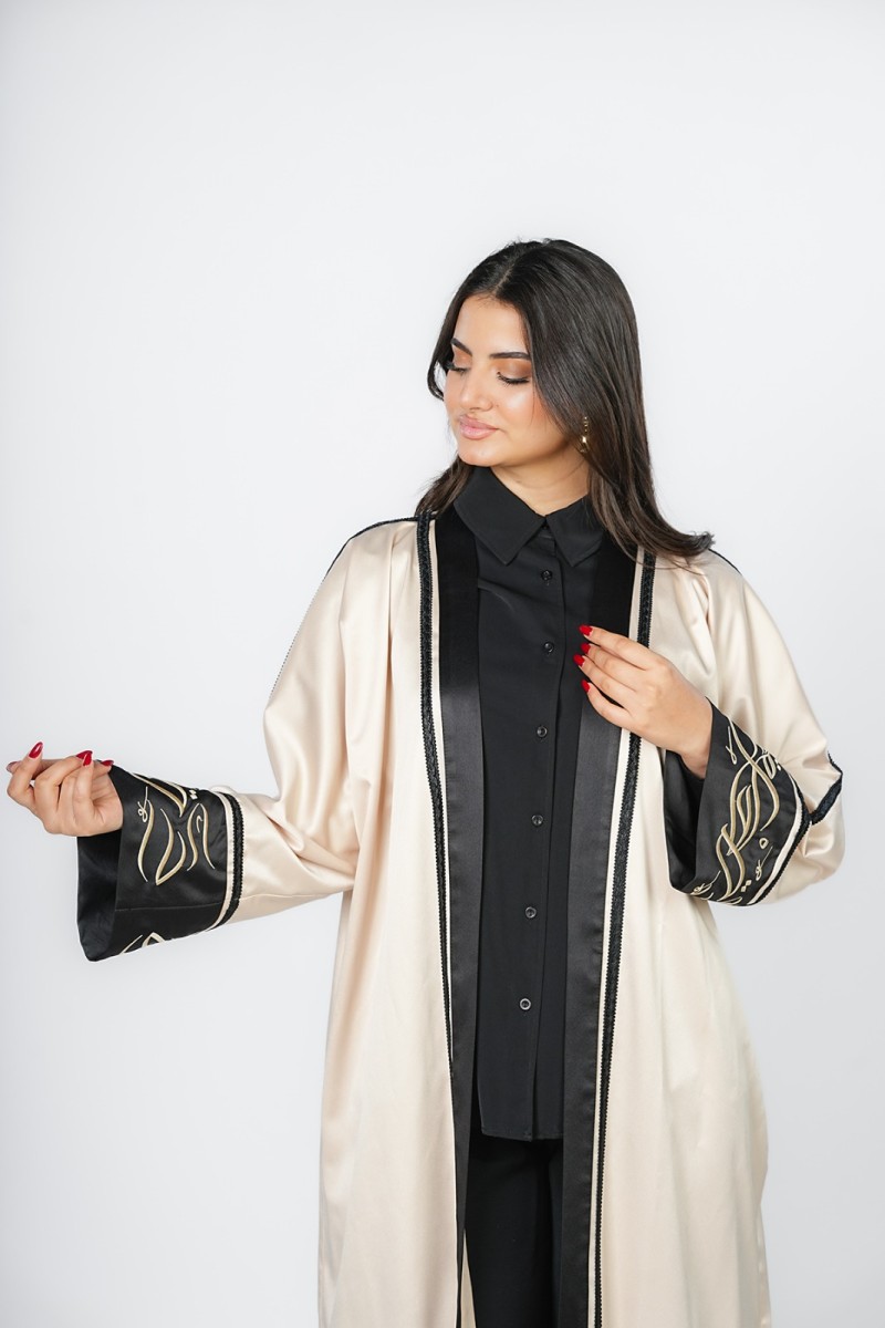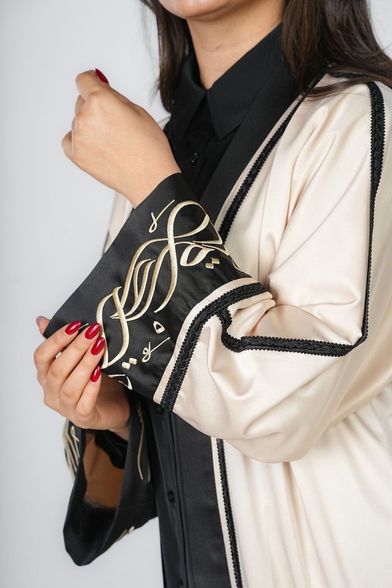 Abaya élégante avec de beaux motifs en calligraphie arabe, parfaite pour les occasions spéciales ou pour un look traditionnel et moderne à la fois. Confortable et stylée, elle apporte une touche unique et raffinée à votre tenue.