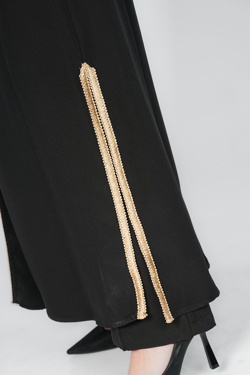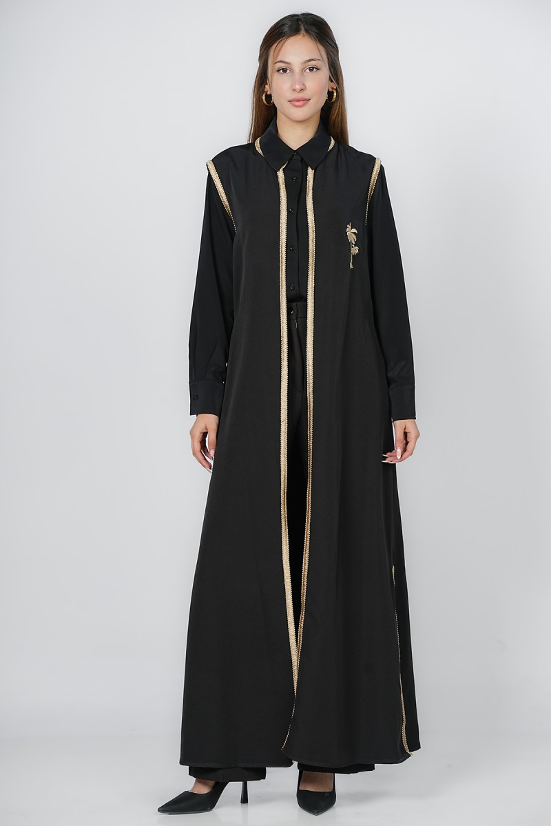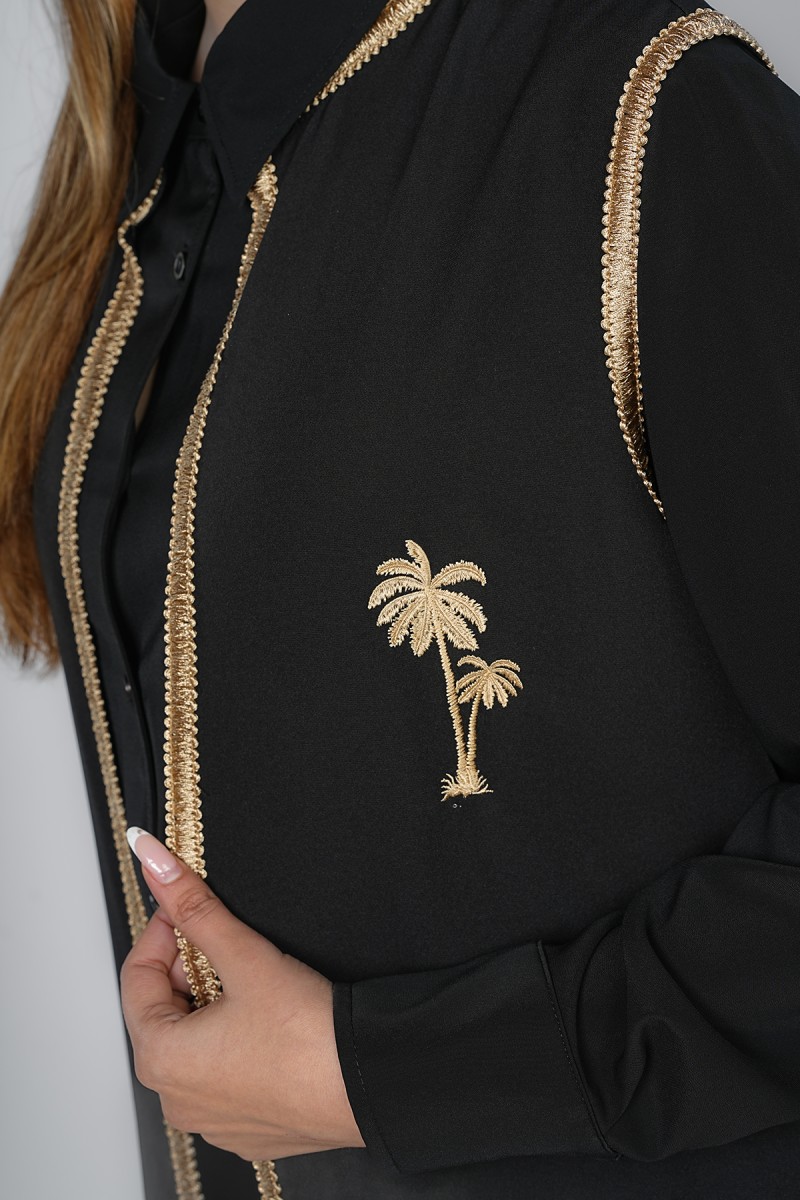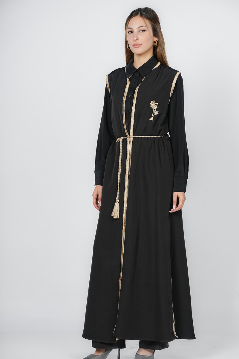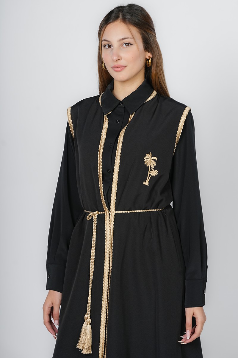 Sublimez votre allure avec ce kimono long sophistiqué. Marqué par une ceinture cordelette à pompons et une broderie palmier dorée, il offre une silhouette élancée et prestigieuse, idéale pour vos événements et cérémonies.