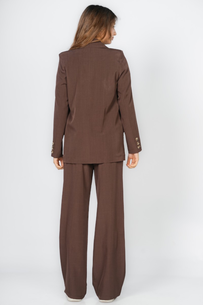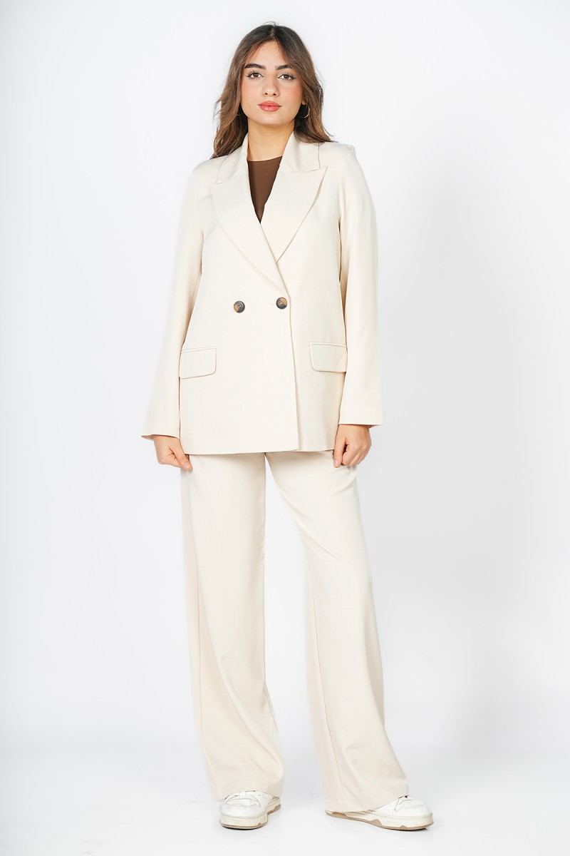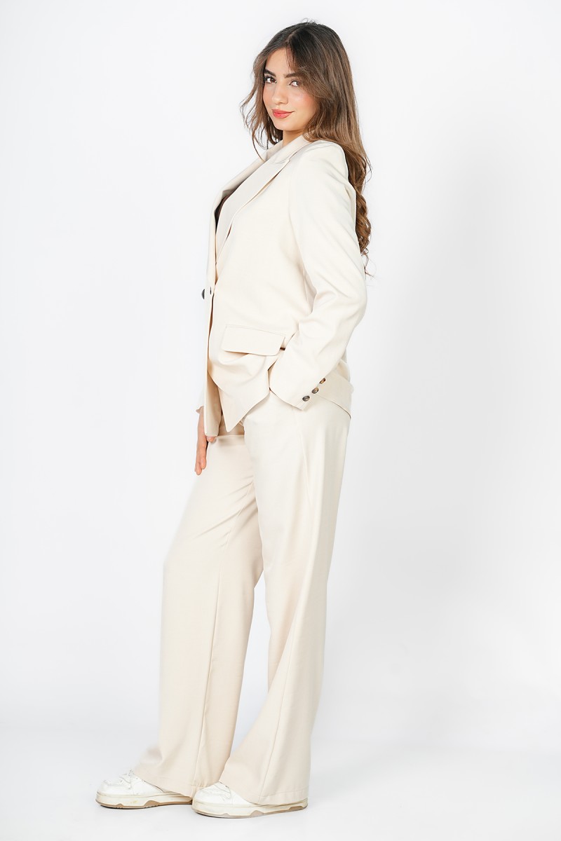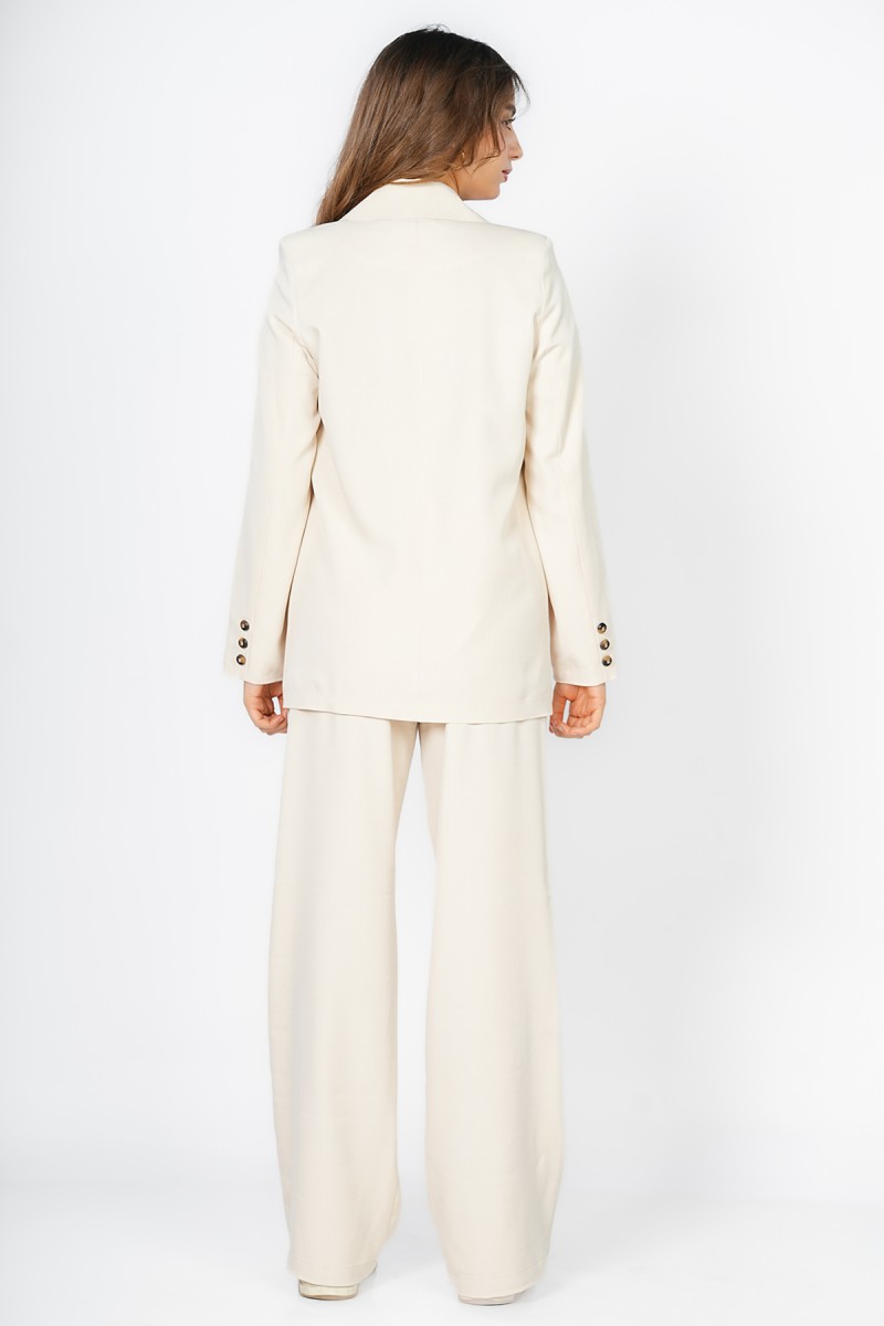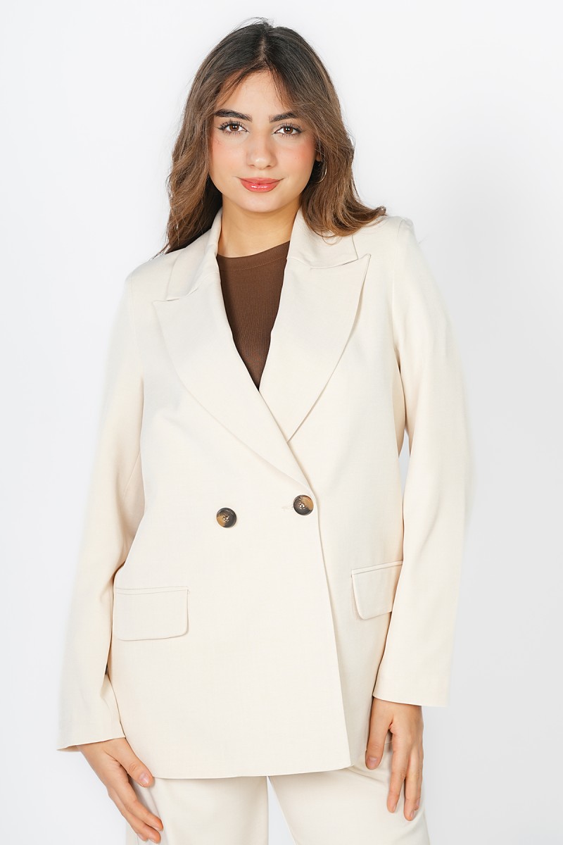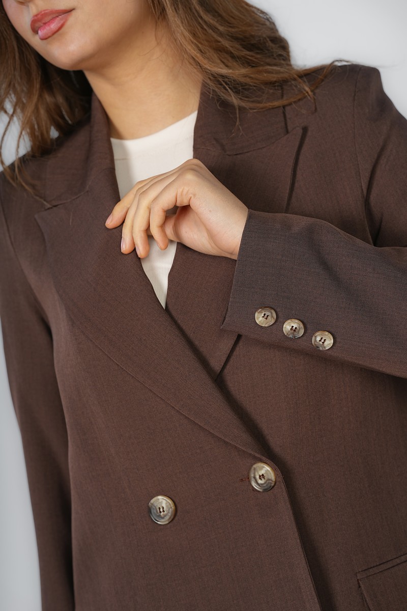 Blazer Carla chez Kastelo, col à revers élégant, fermeture croisée à deux boutons, deux poches et manches longues avec trois boutons aux poignets. Tissu crêpe léger, confortable et facile à assortir pour un look moderne et élégant