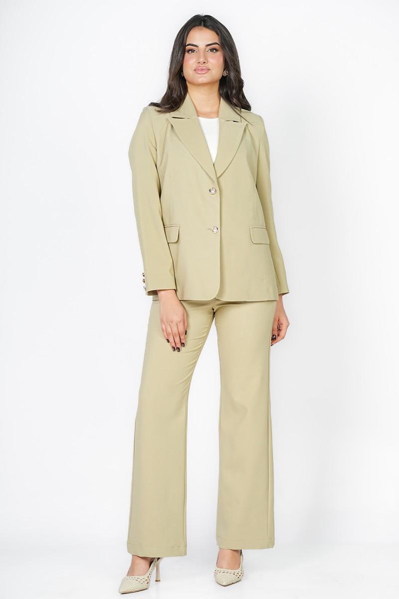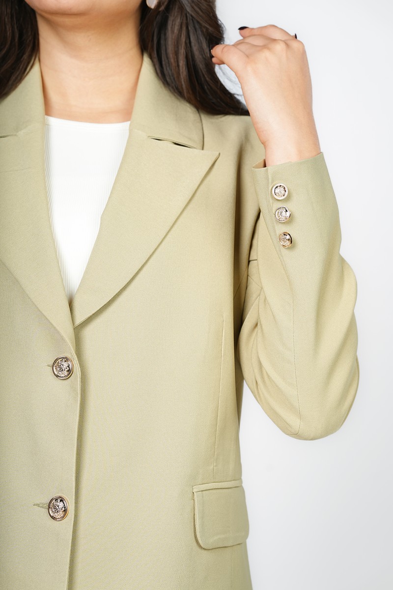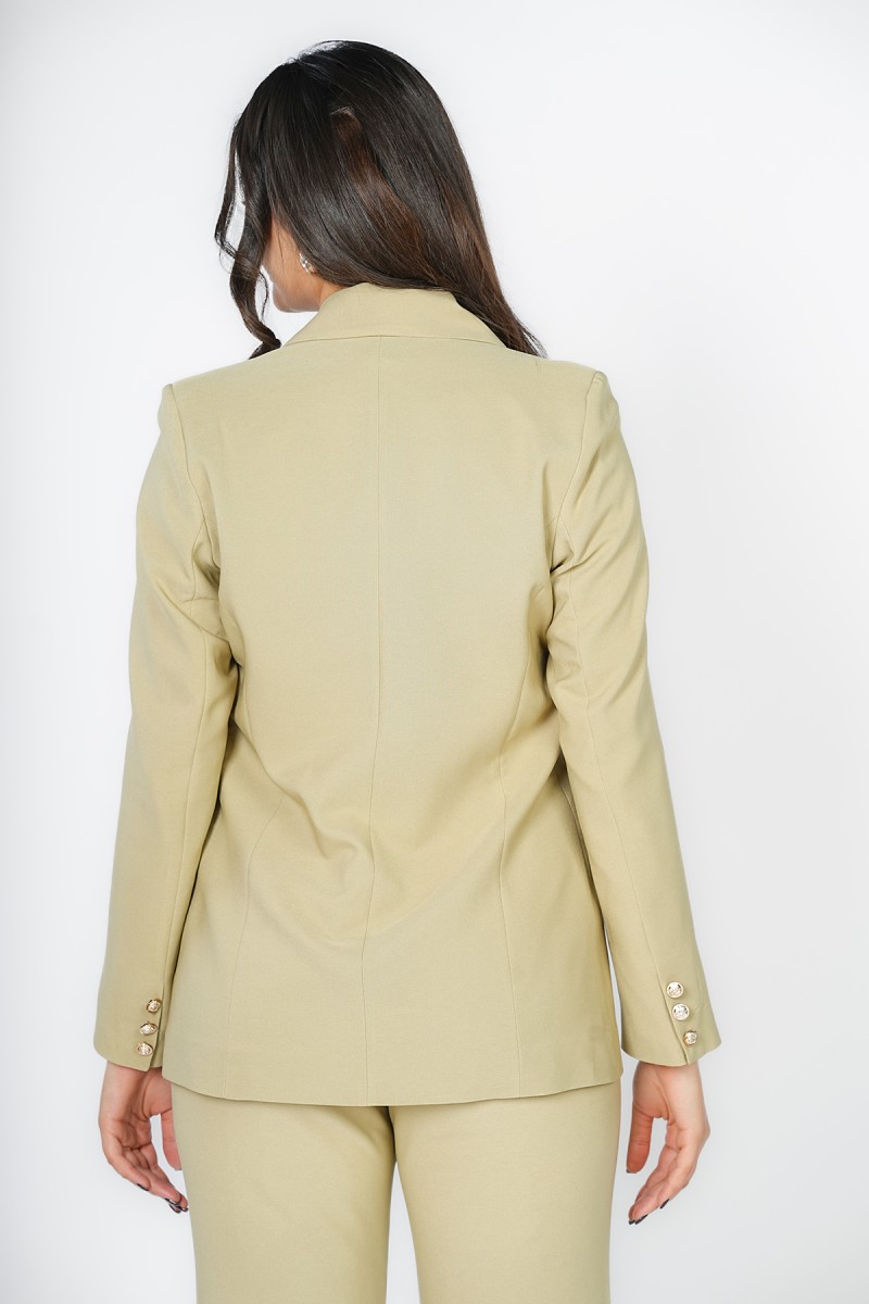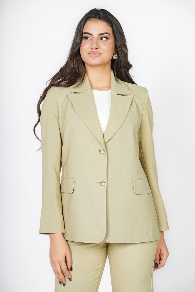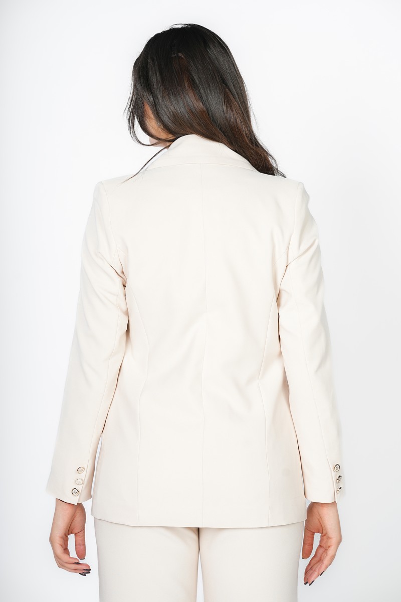 Blazer Trend Collection Été chez Kastelo, col tailleur avec fermeture au milieu, manches longues et deux poches. Tissu crêpe léger, élégant et facile à assortir pour un look moderne au quotidien.