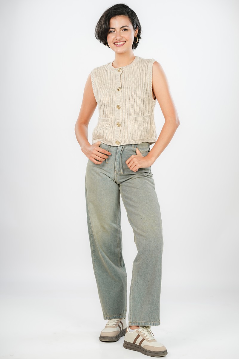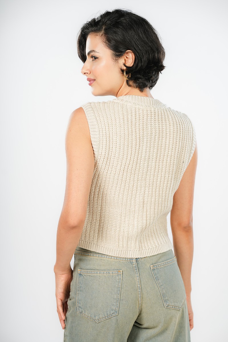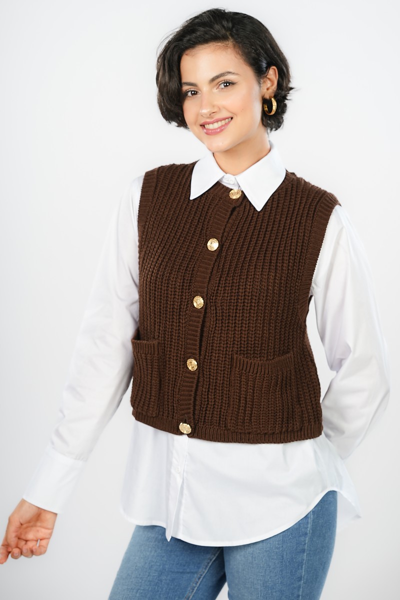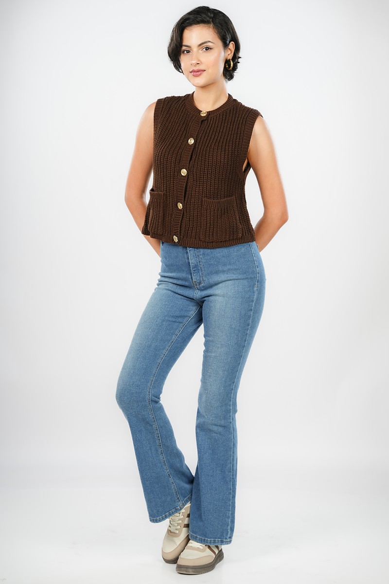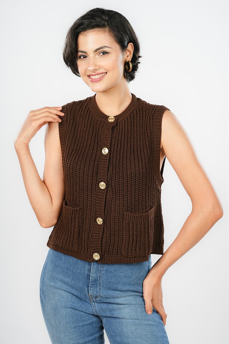 Cardigan sans manches en maille côtelée, coupe moderne avec boutons dorés et poches frontales. Doux, confortable et parfait pour un look chic et tendance.
