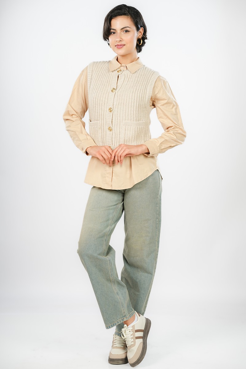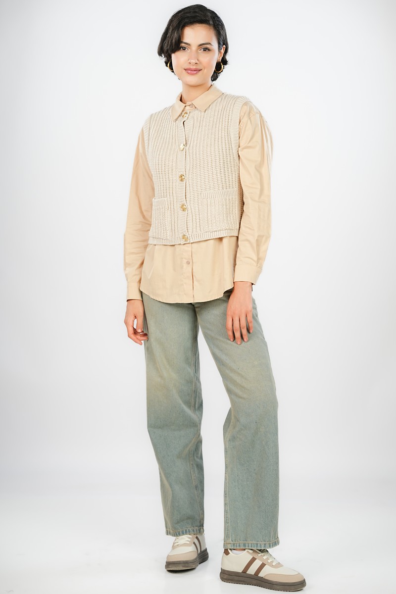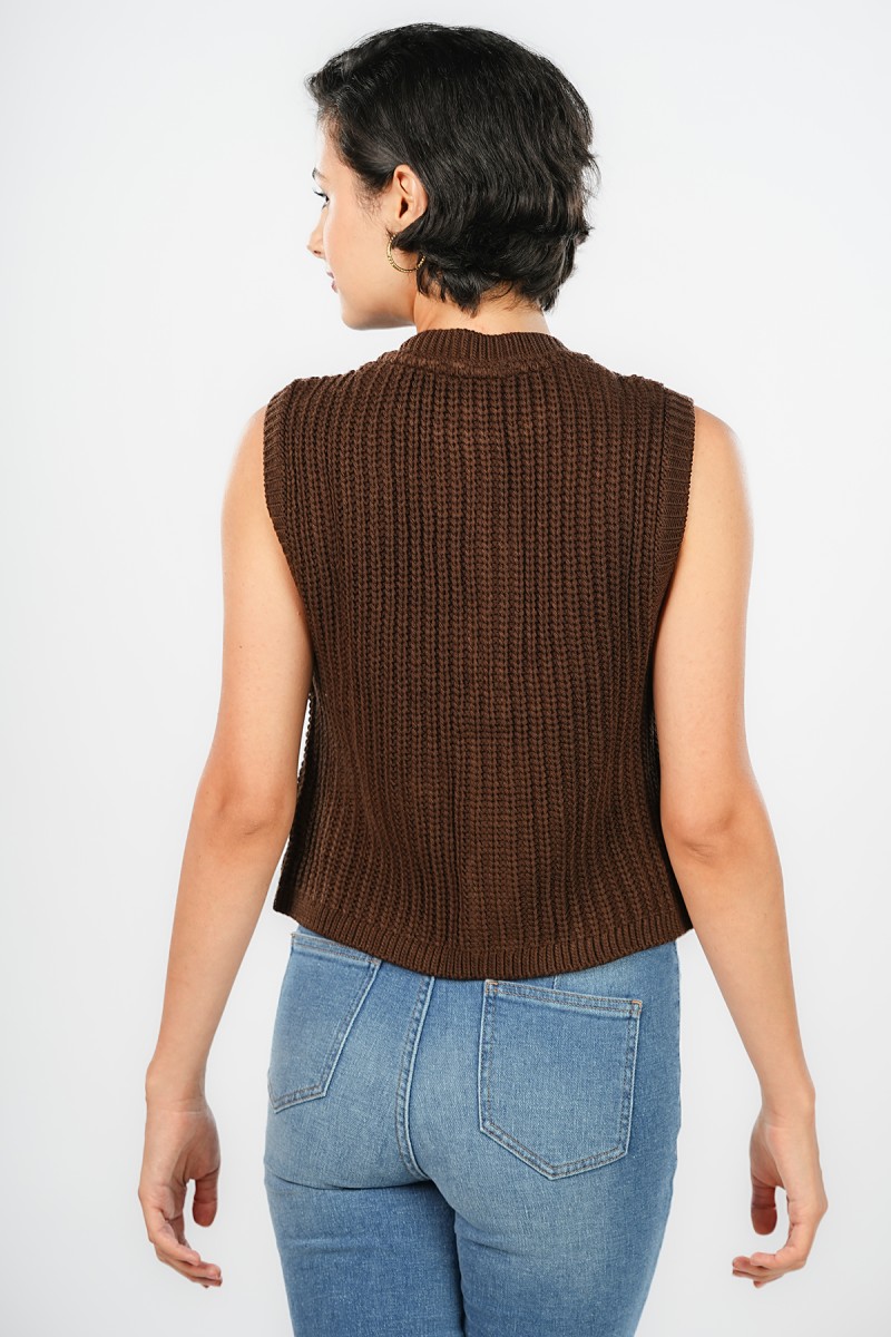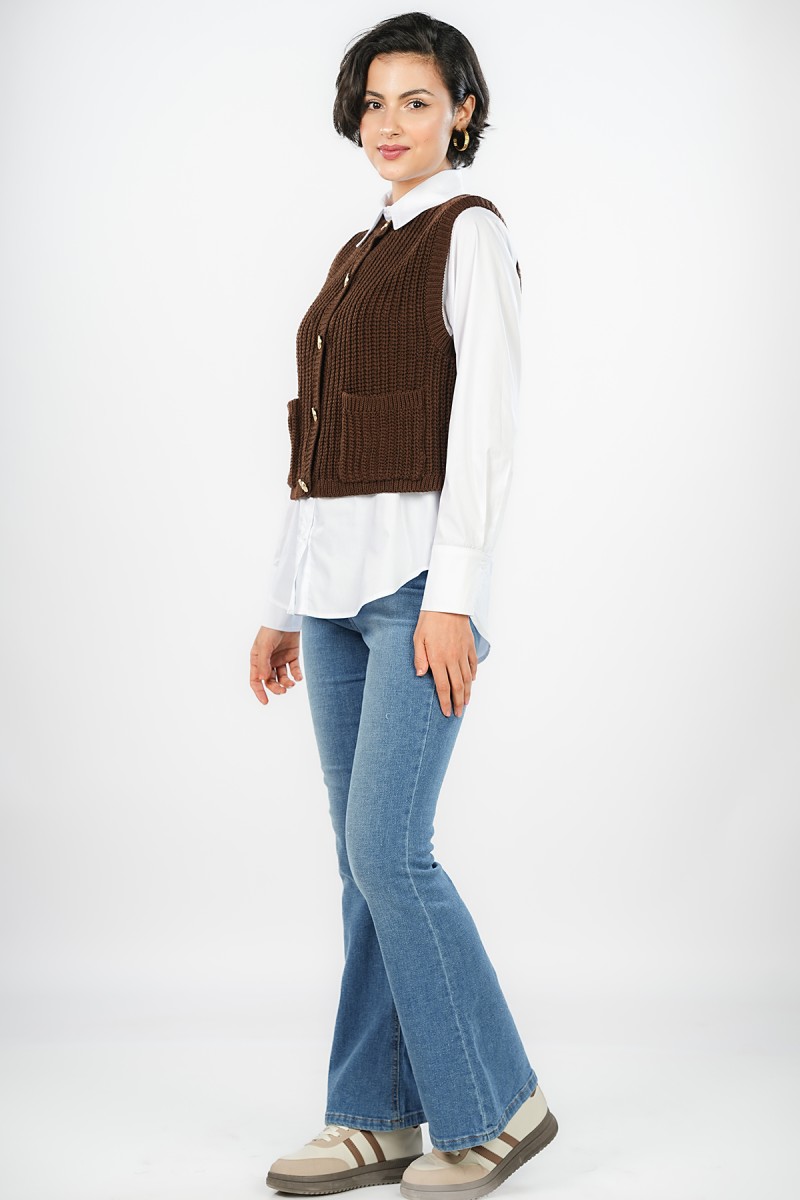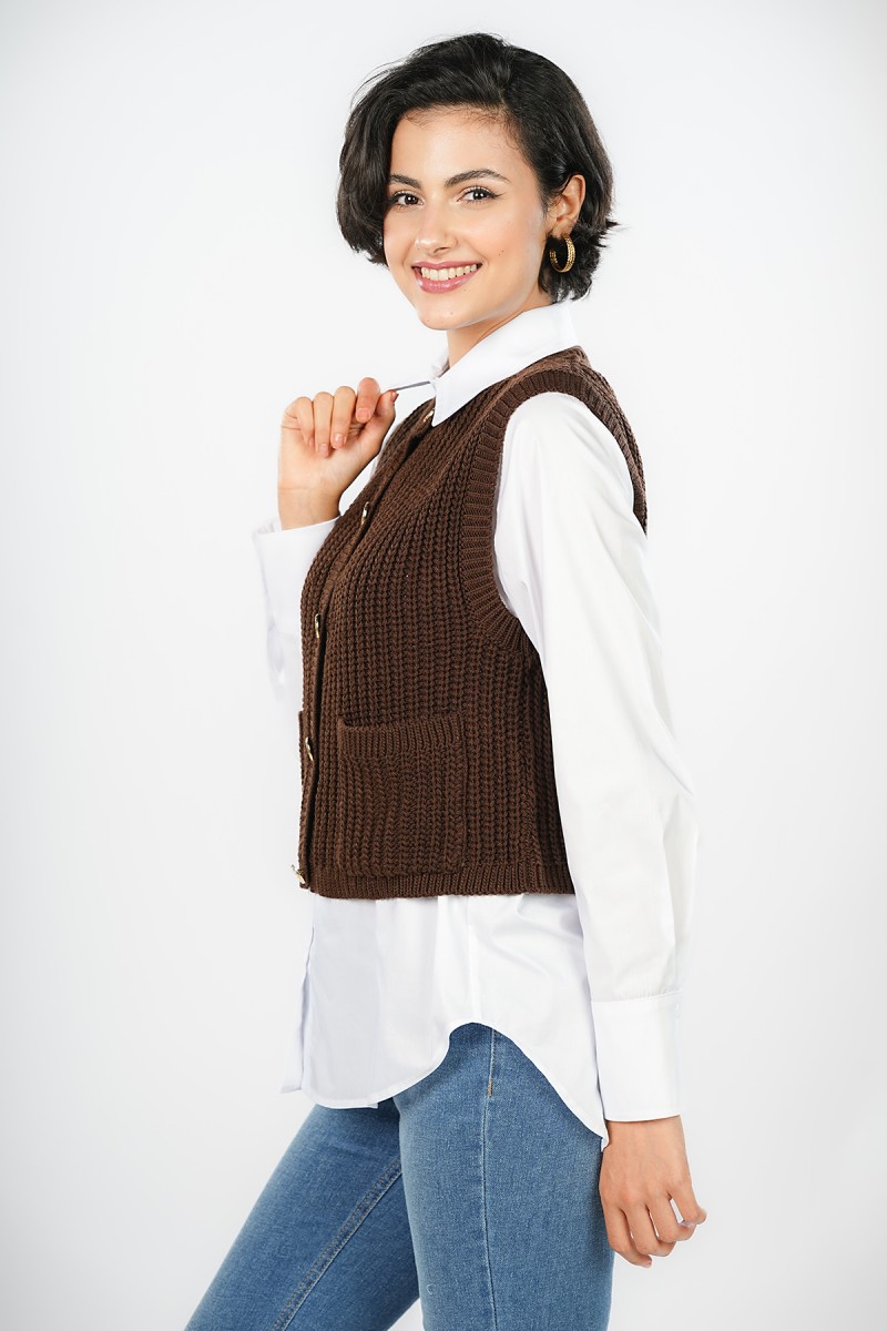 Cardigan sans manches en maille côtelée, coupe moderne avec boutons dorés et poches frontales. Doux, confortable et parfait pour un look chic et tendance.