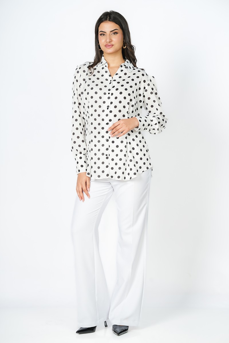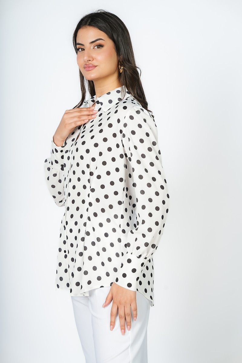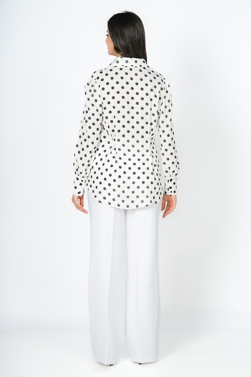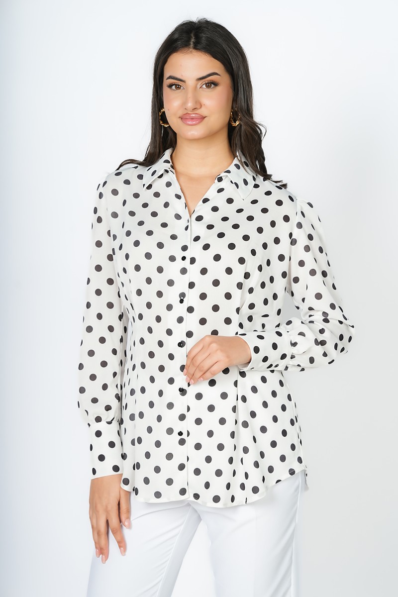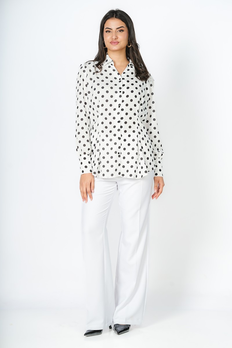 Chemise à pois coupe regular, avec pinces devant et au dos pour un ajustement à la taille, col à revers en V et fermeture boutonnée sur le devant