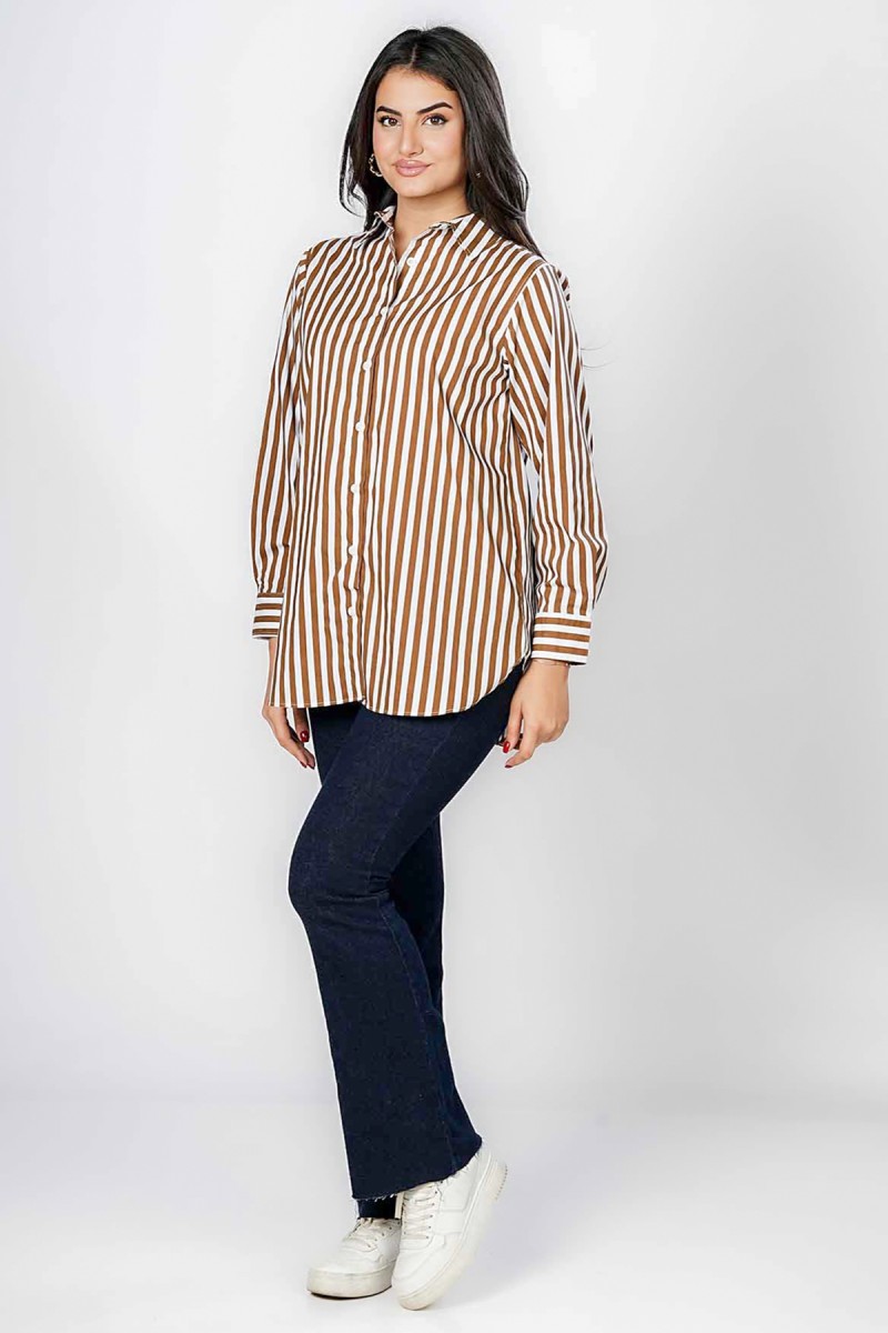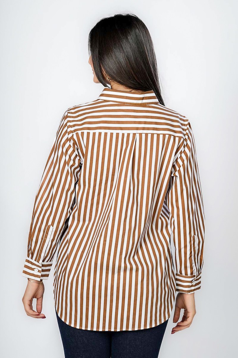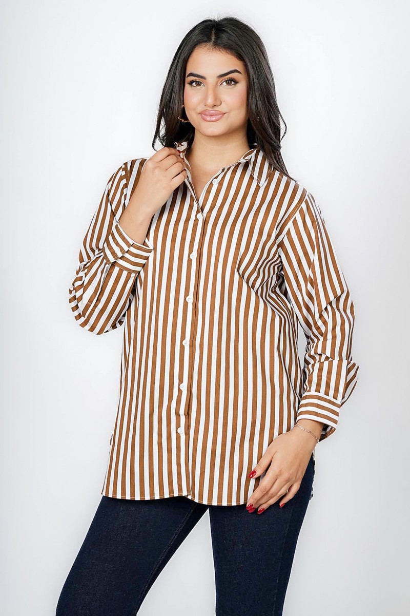 Ceci est une chemise à rayures manches longues avec un col chemisier classique et une patte de boutonnage verticale simple. Le tissu est fluide et lisse, et la coupe est droite et décontractée