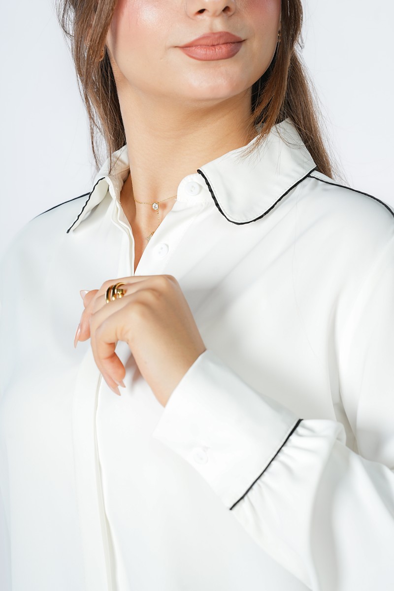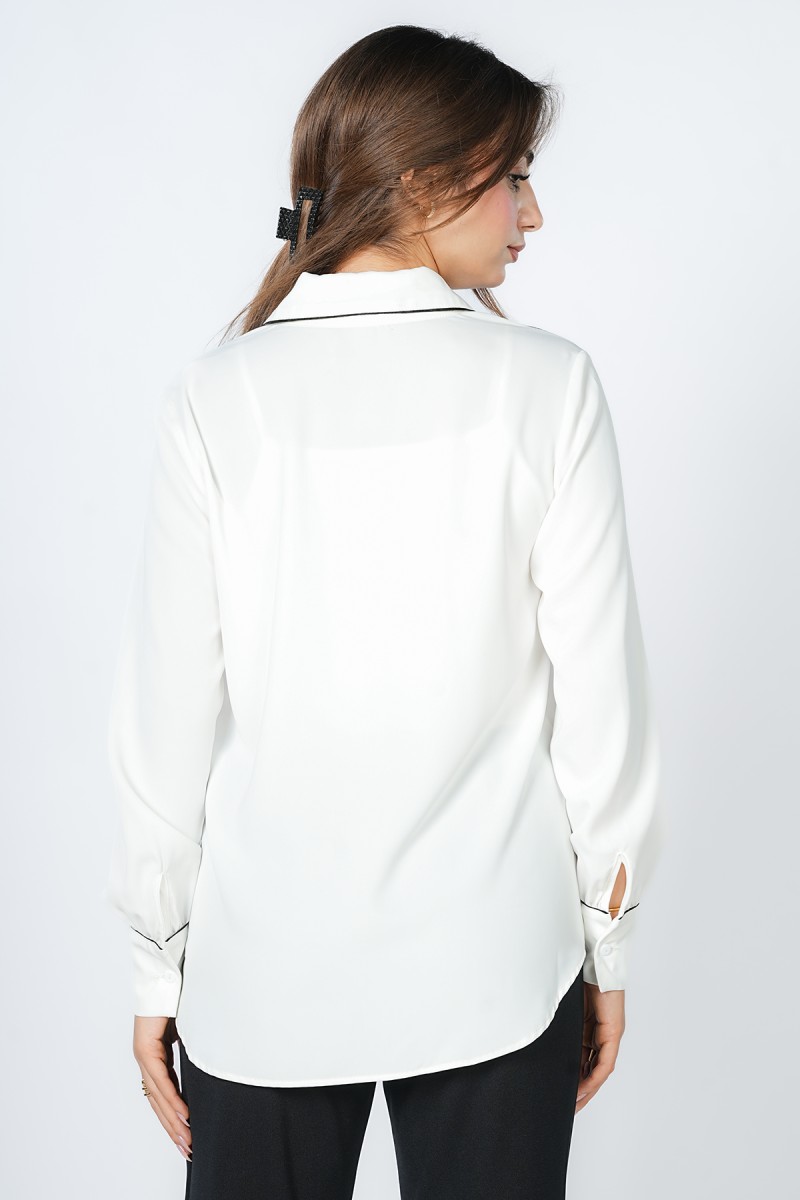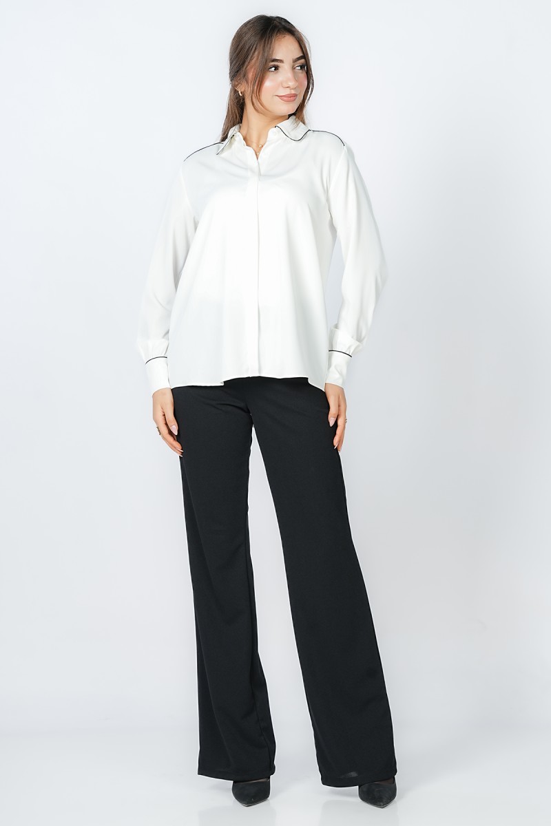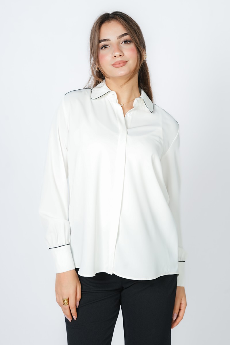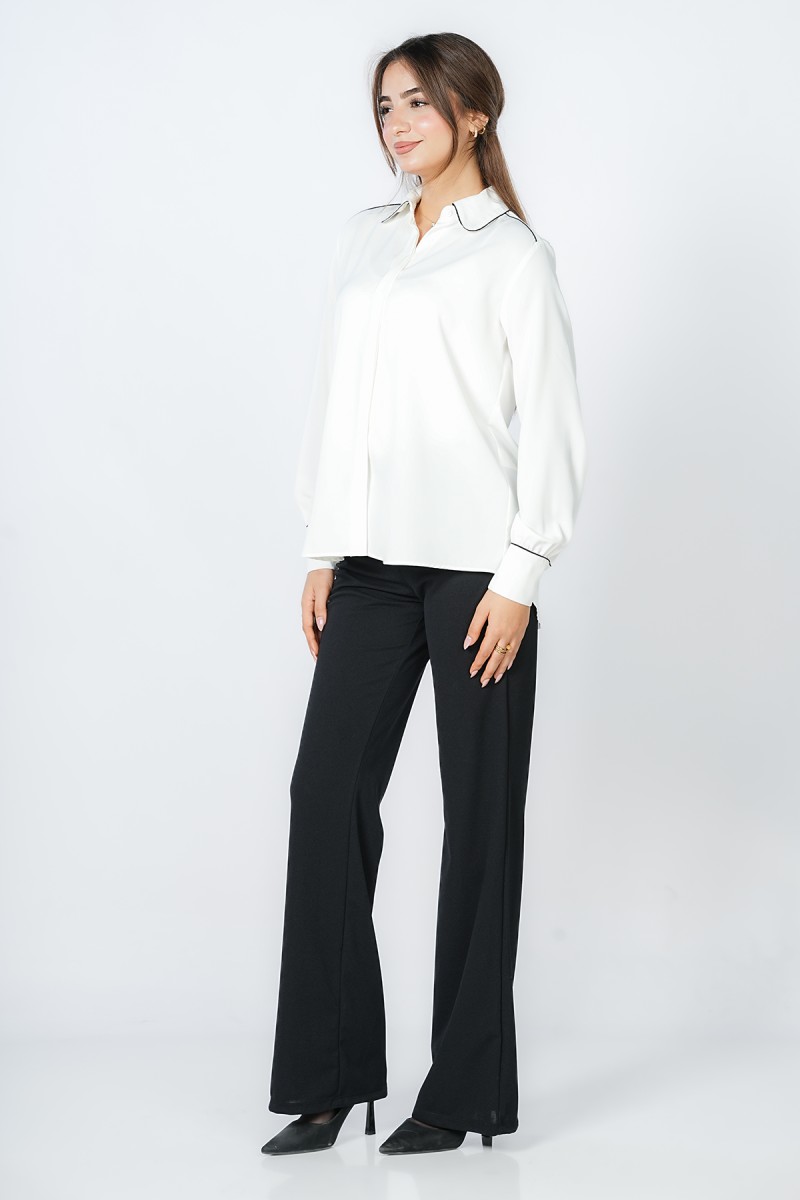 Apportez une touche de sophistication moderne à votre vestiaire avec ce chemisier fluide aux finitions remarquables. Conçu pour la femme élégante, ce haut combine une coupe classique avec des détails de design contemporains.