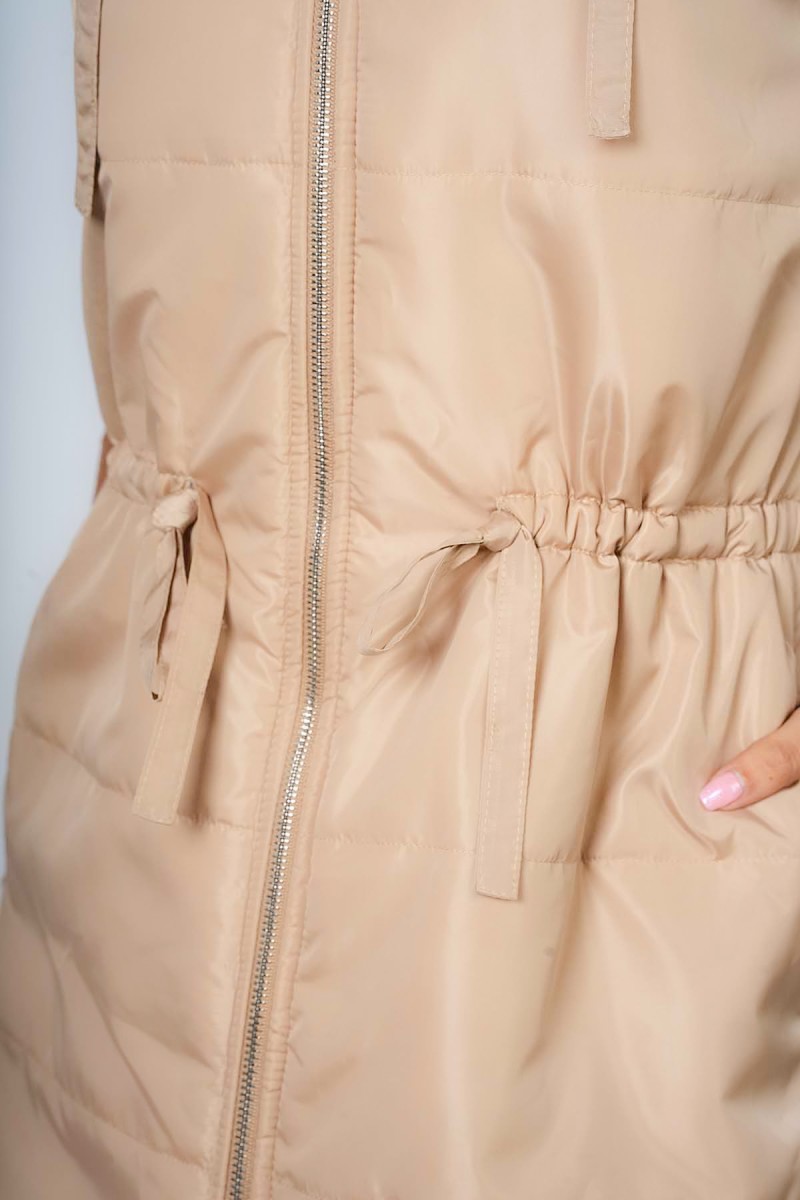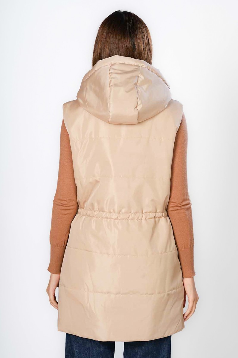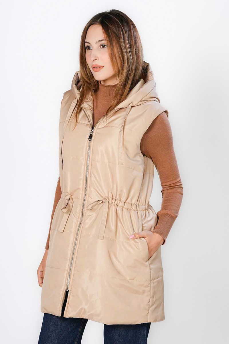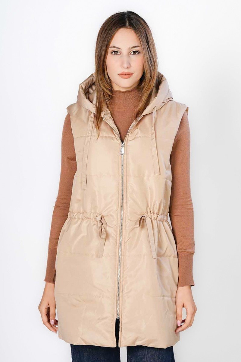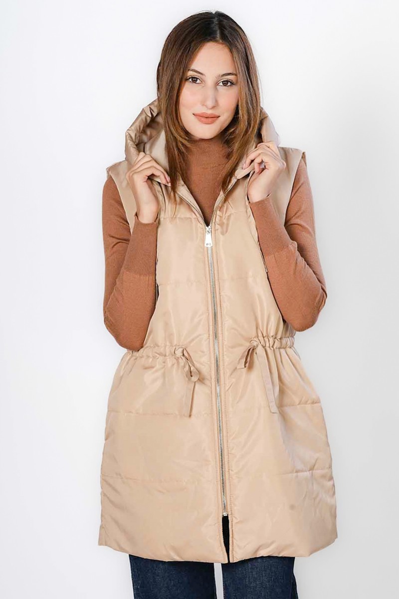 Ceci est une doudoune sans manches matelassé de coupe longue. Elle est dotée d'une capuche et d'une fermeture éclair intégrale sur le devant. Un cordon de serrage réglable est placé à la taille pour cintrer la silhouette. Elle possède également des poches plaquées sur le devant