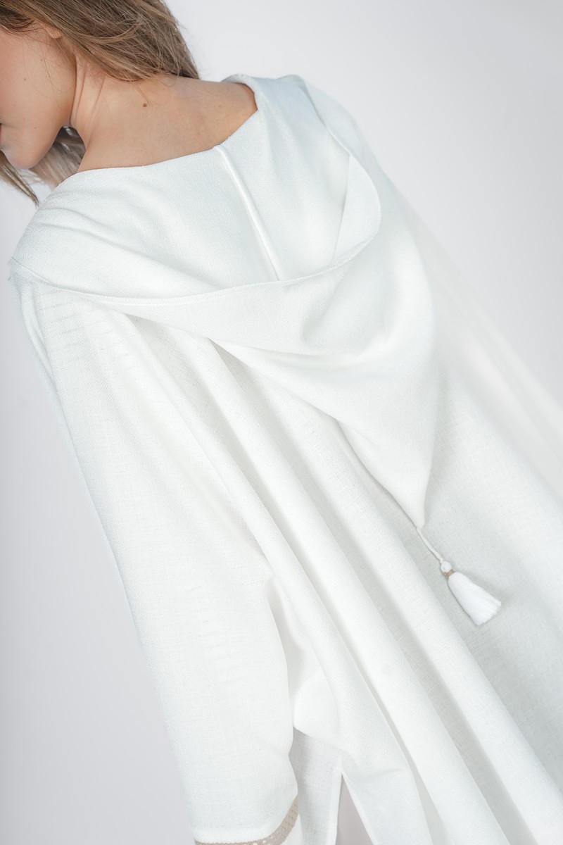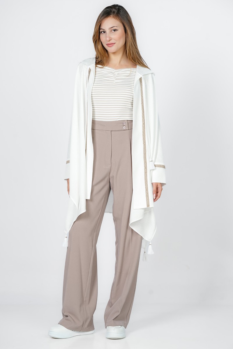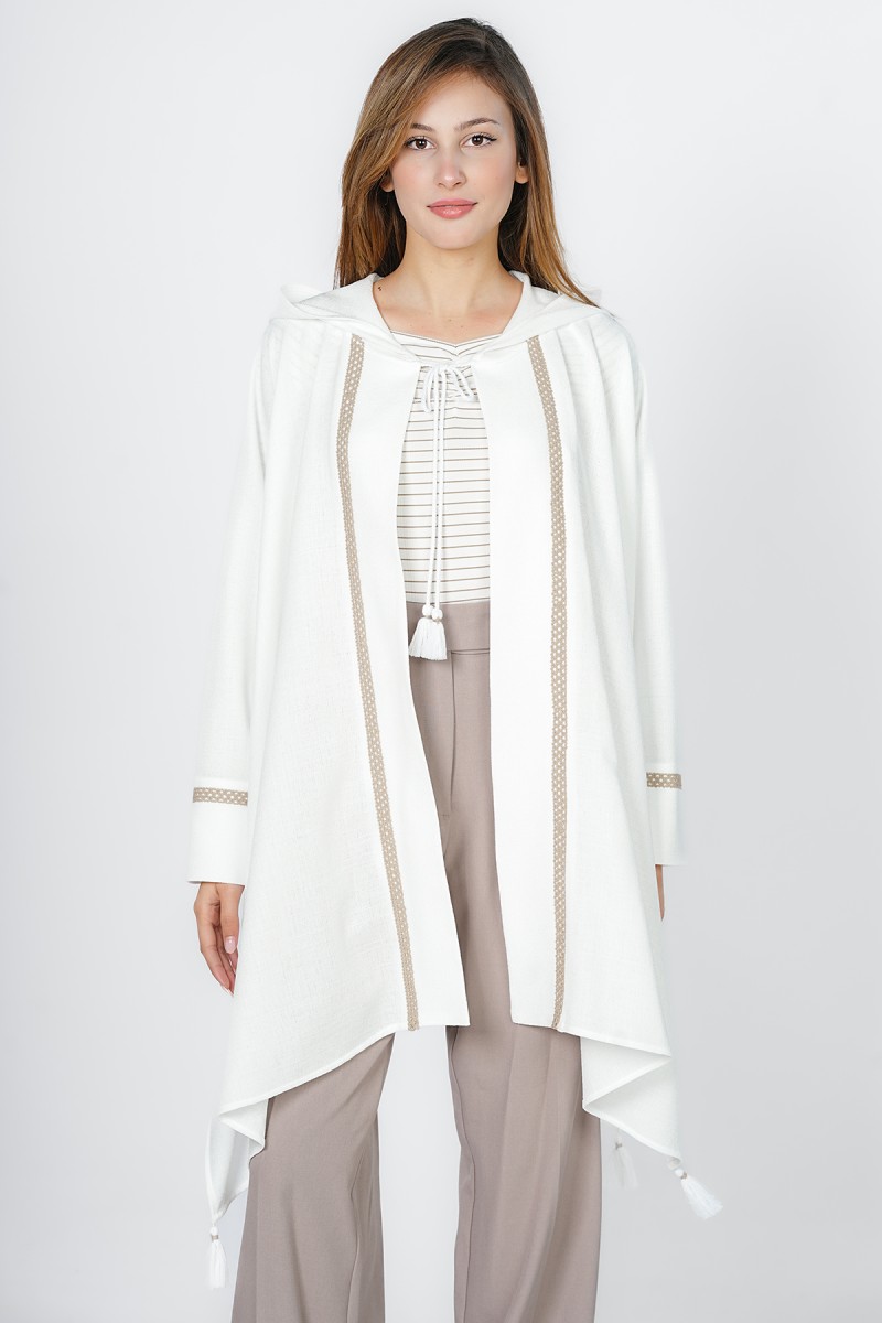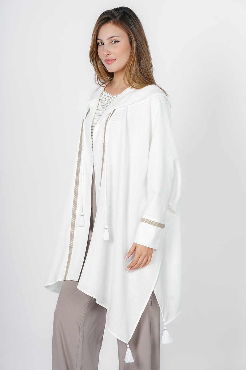 Adoptez un style bohème et raffiné avec ce kimono court à capuche. Orné de galons tressés délicats et de pompons soyeux, ce haut fluide est la pièce de superposition idéale pour vos tenues de mi-saison ou vos soirées d'été.