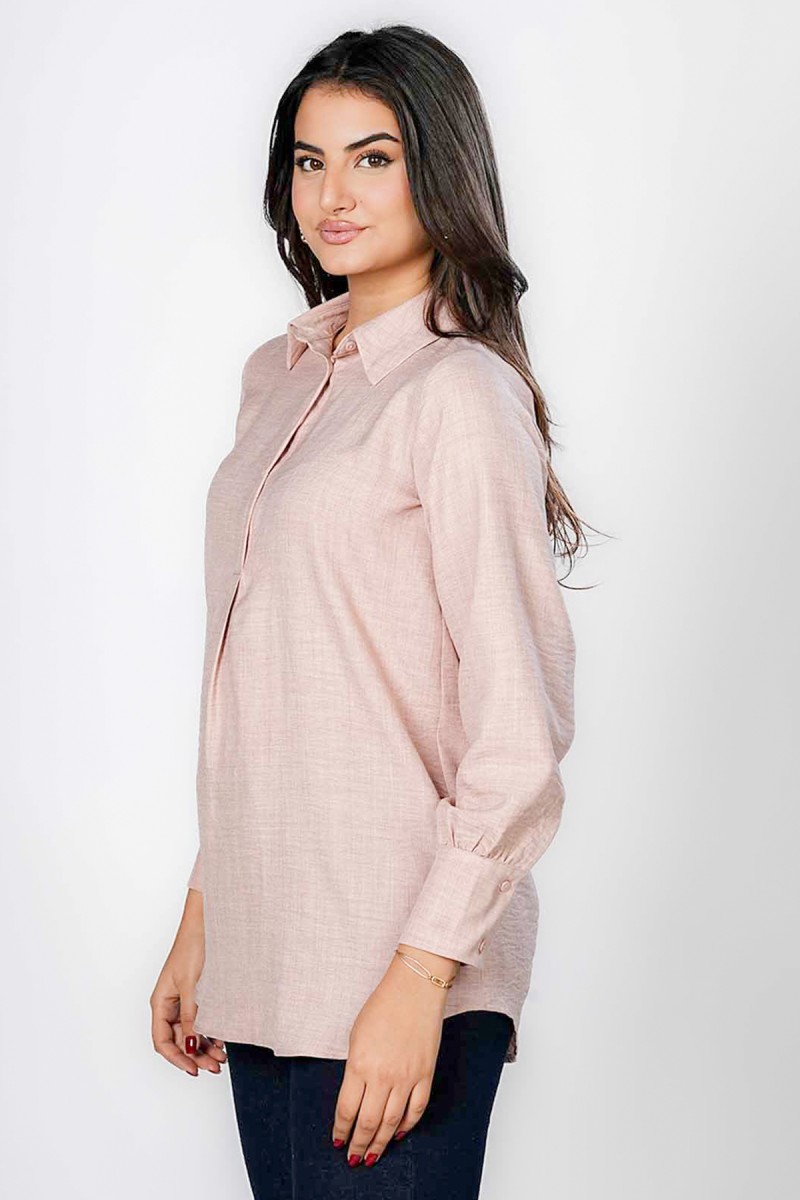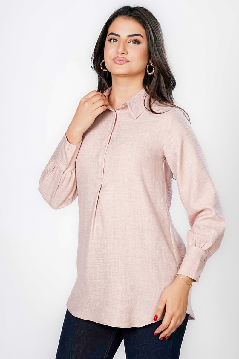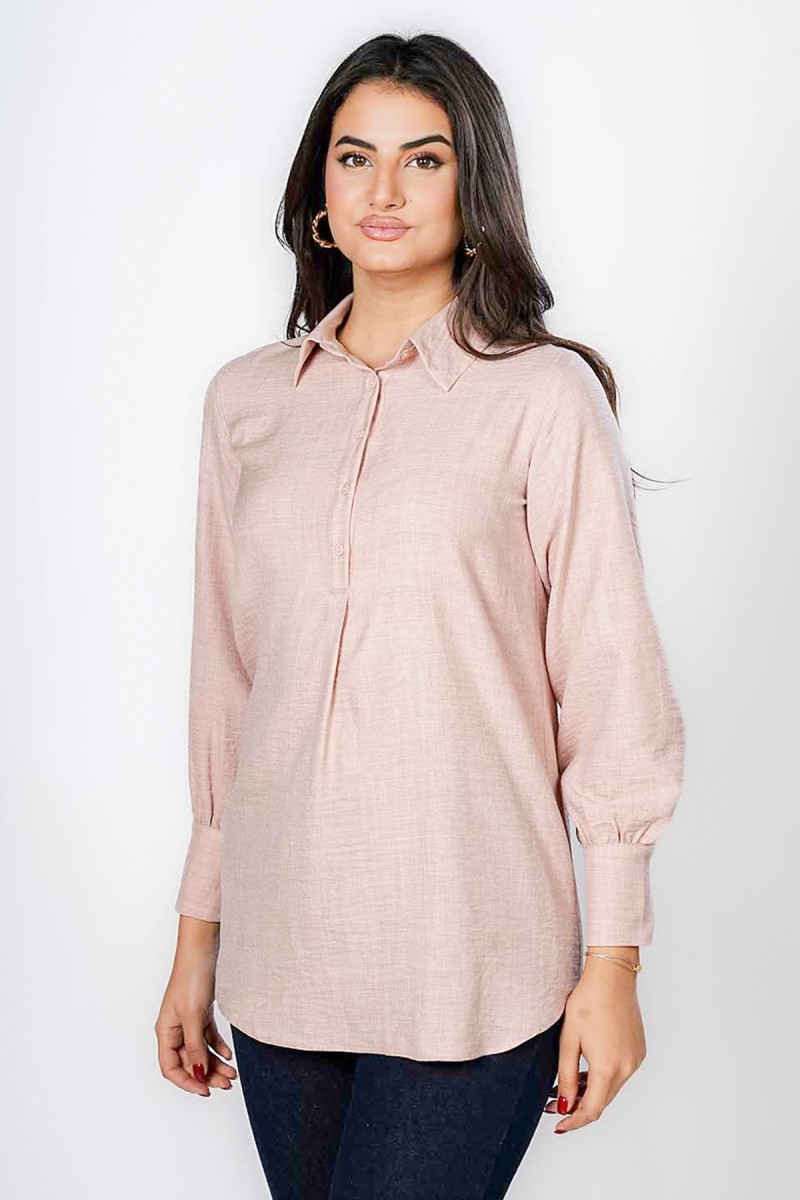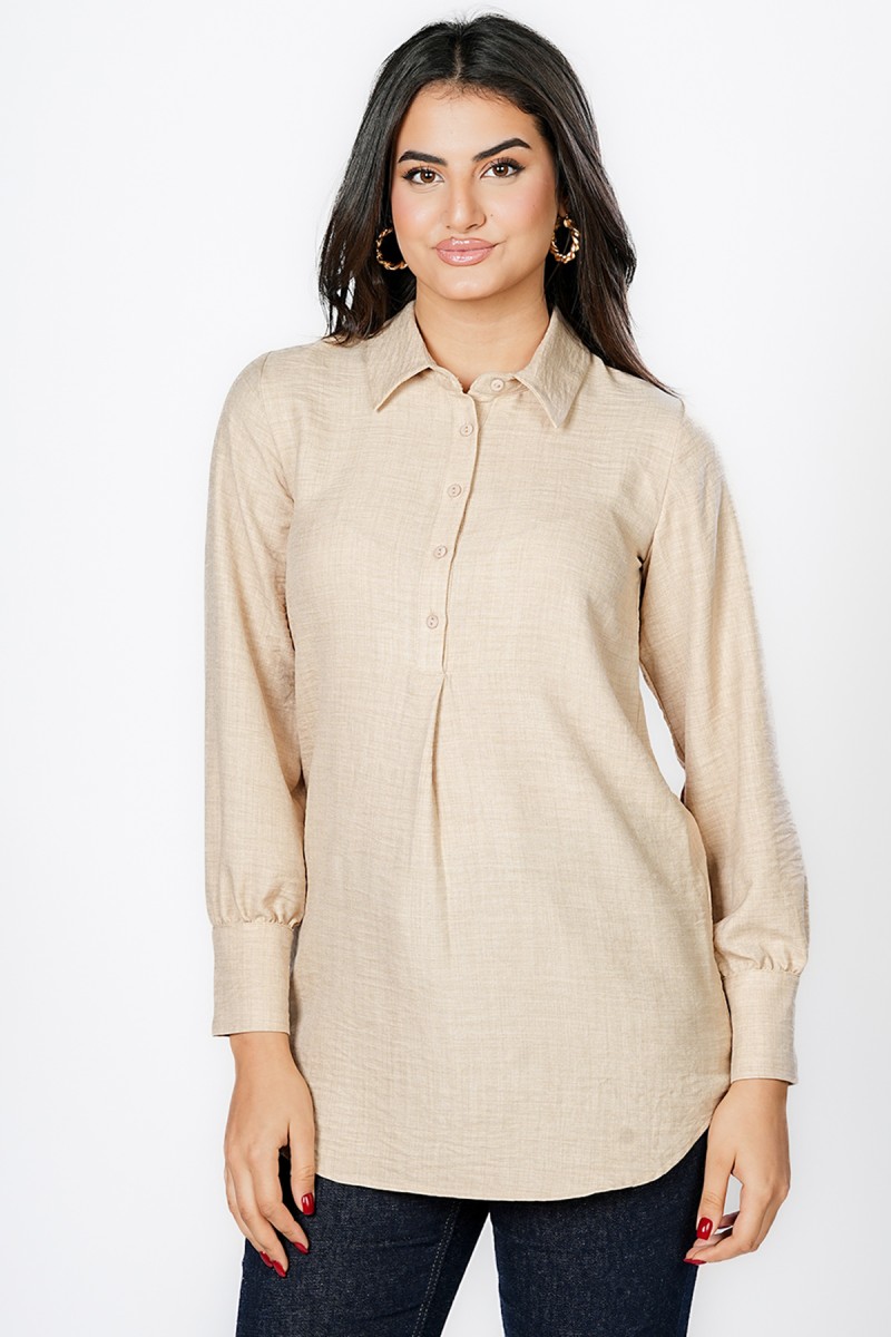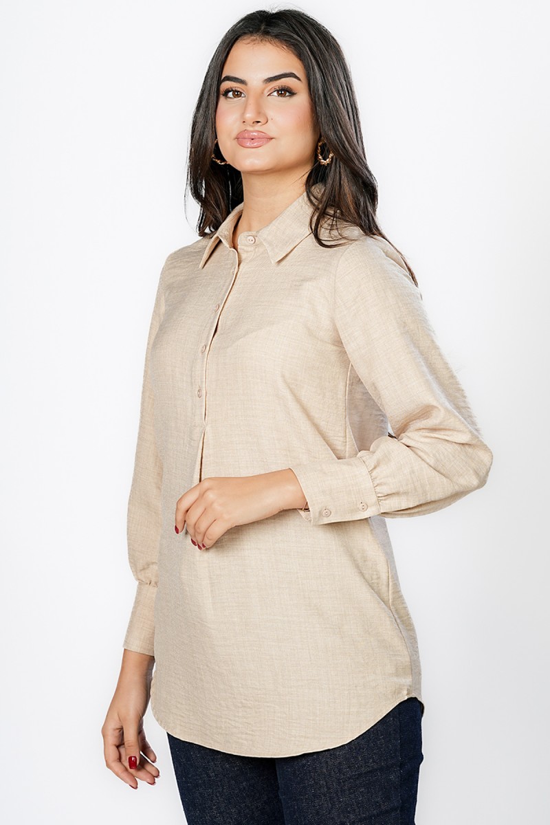 Ceci est une liquette à manches longues avec une coupe longue et ample. Elle présente un col chemisier classique et une patte de boutonnage courte à l'avant, typique d'un style tunisien. La matière semble avoir une texture visible, et les poignets sont resserrés et froncés.