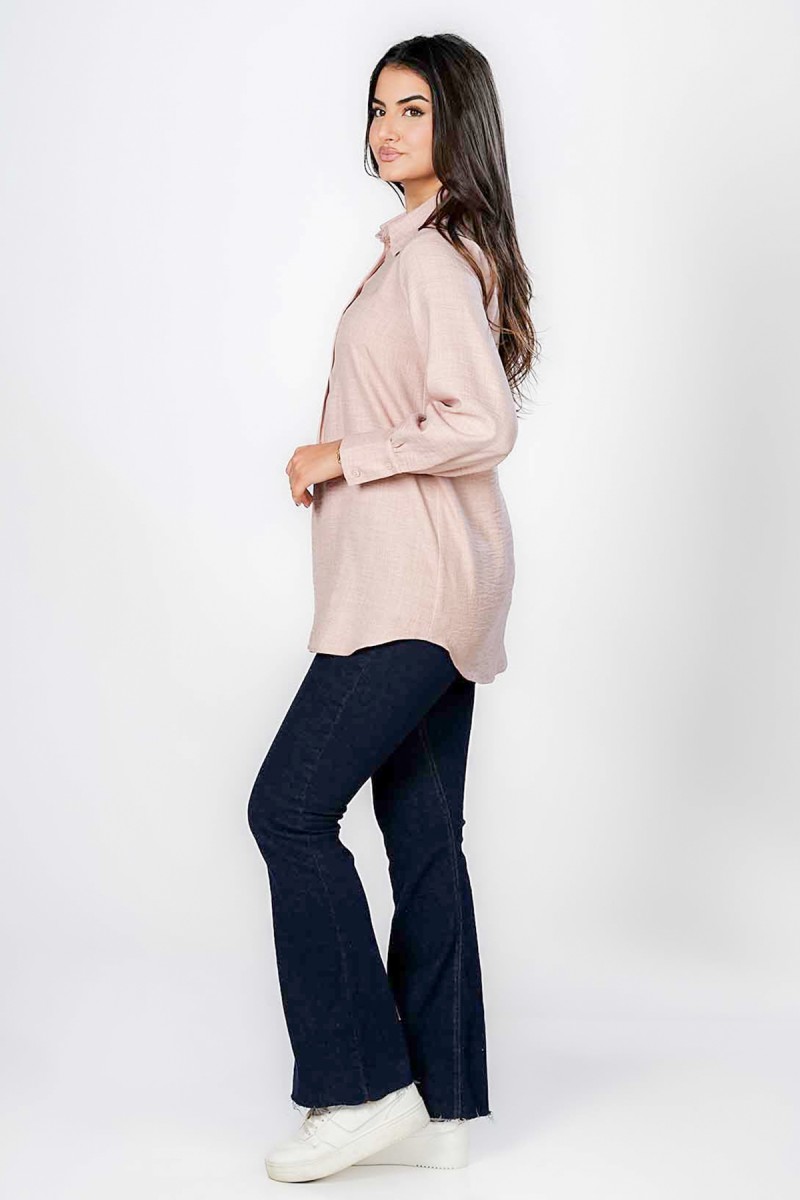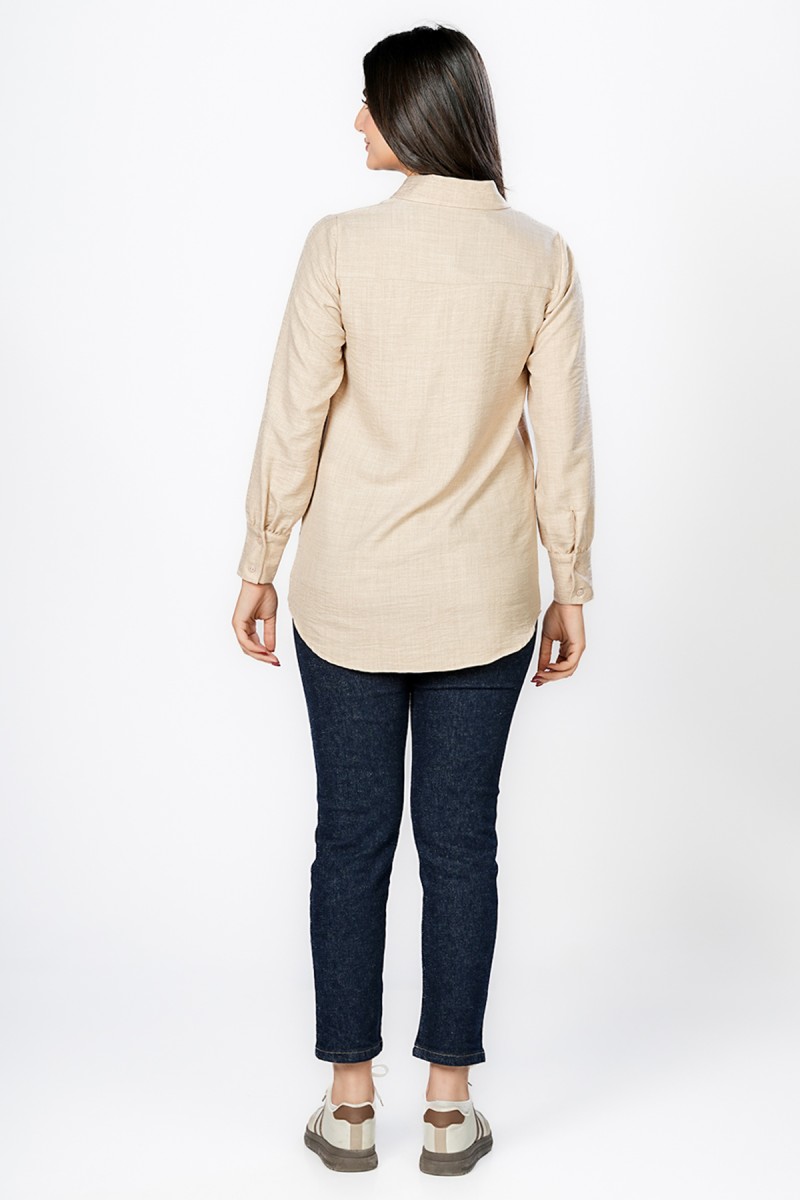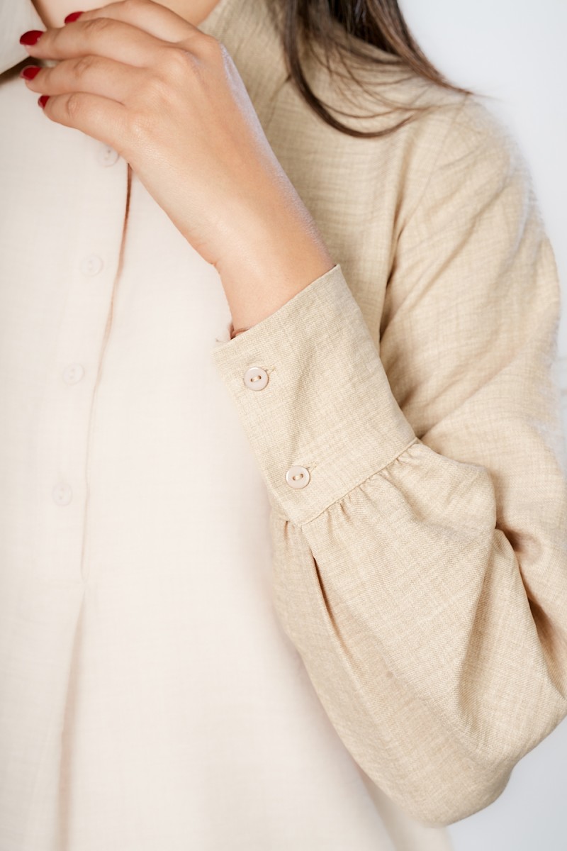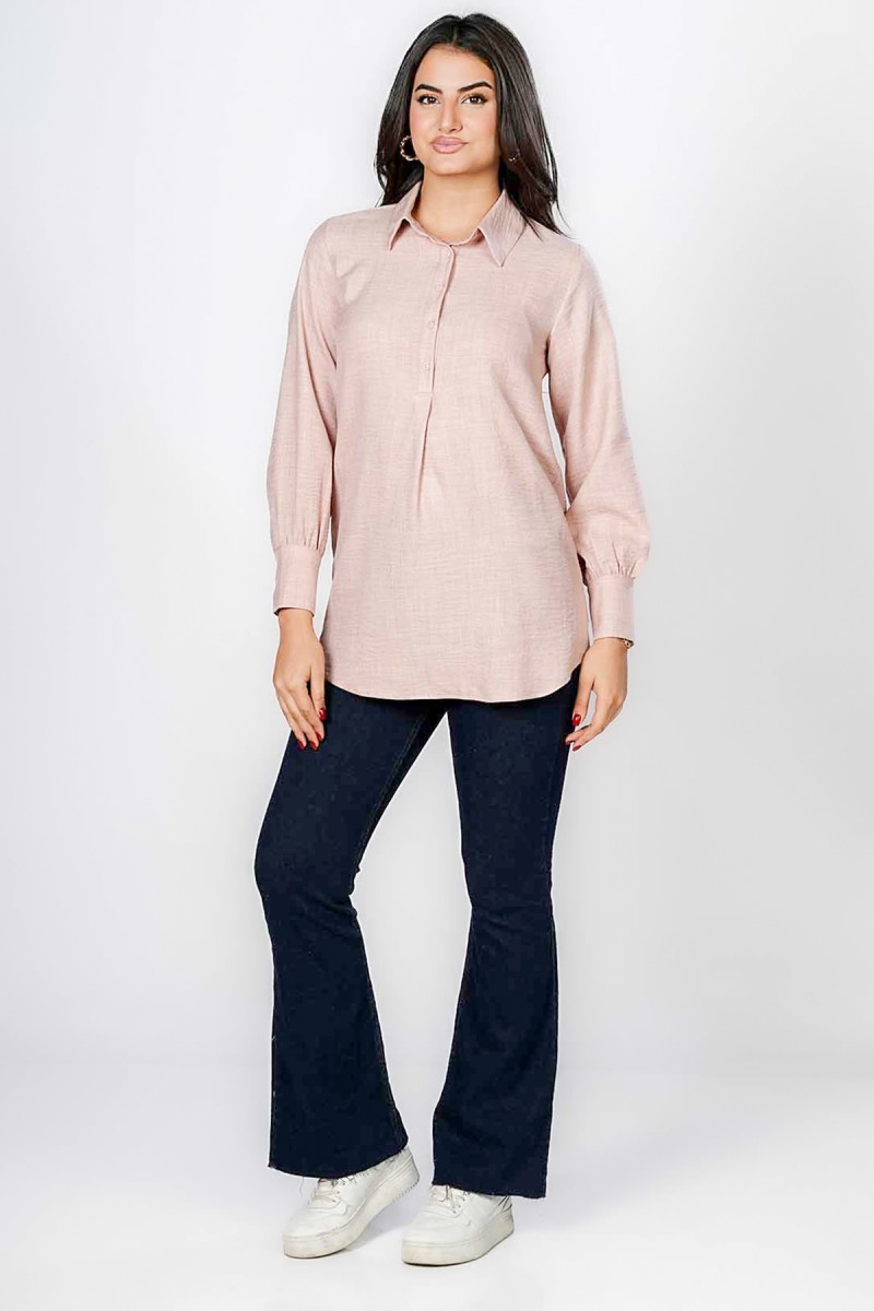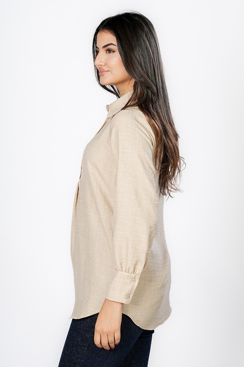Ceci est une liquette à manches longues avec une coupe longue et ample. Elle présente un col chemisier classique et une patte de boutonnage courte à l'avant, typique d'un style tunisien. La matière semble avoir une texture visible, et les poignets sont resserrés et froncés.