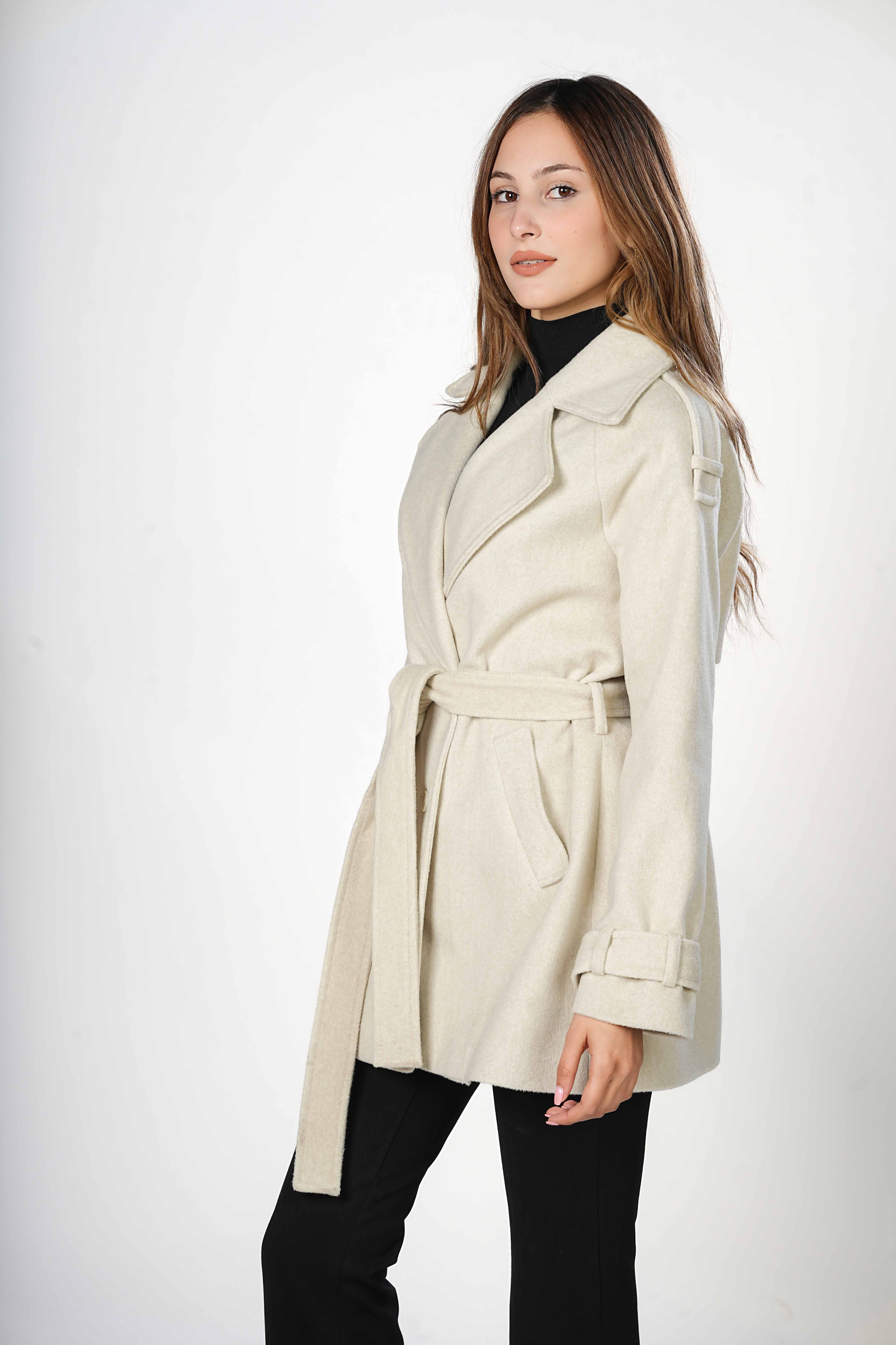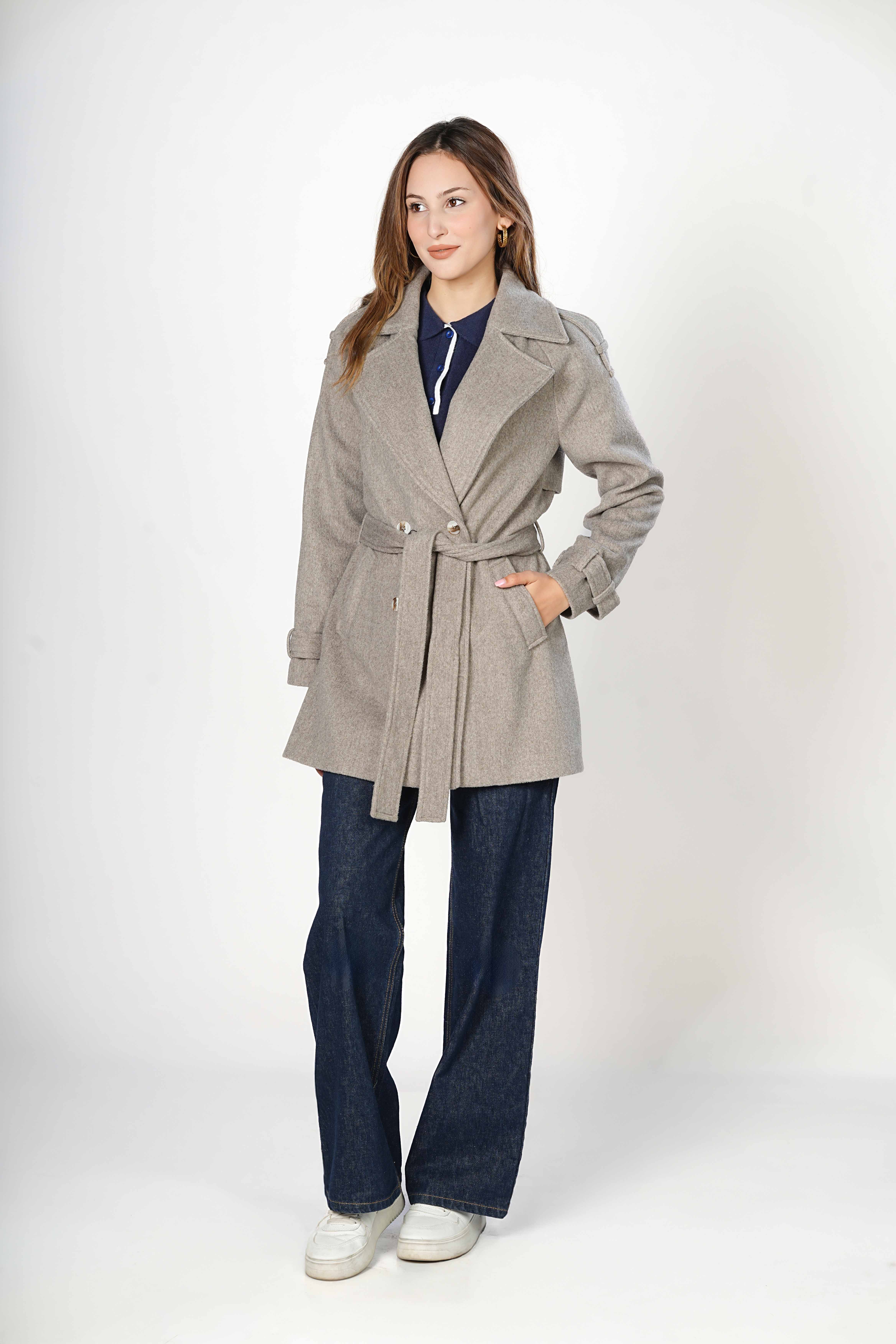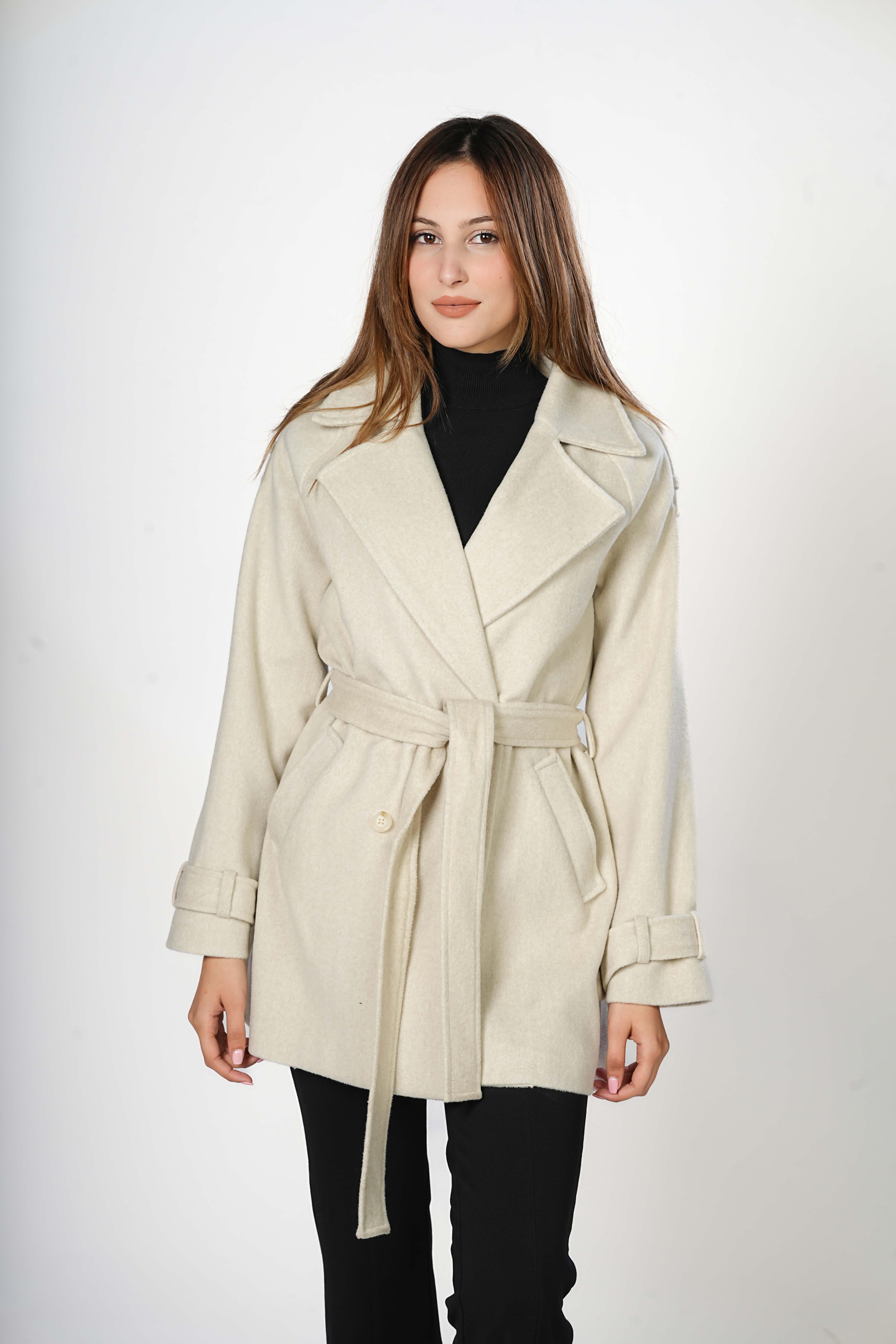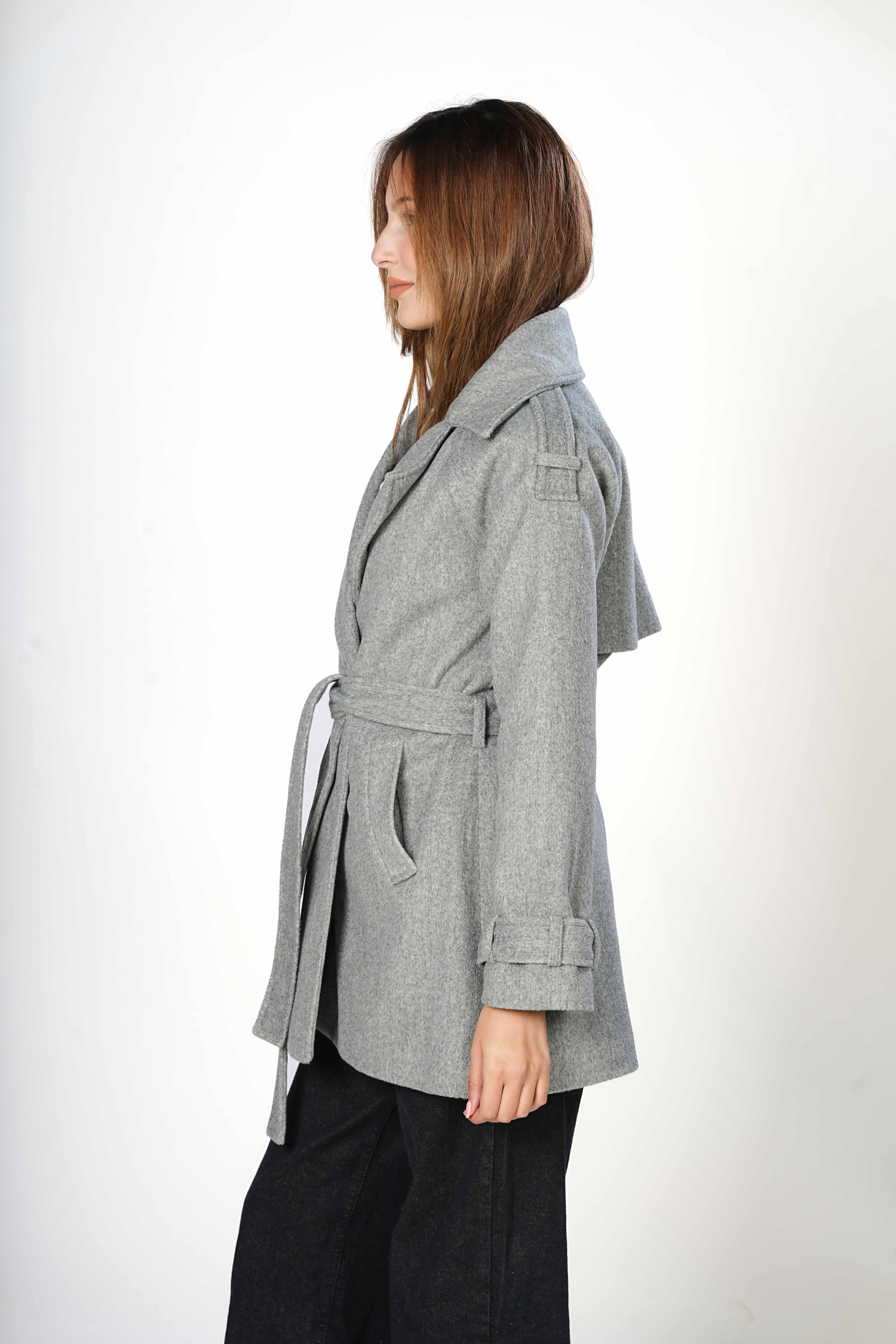 Ce manteau court se distingue par son tissu drapé. Doté d'un col à revers prononcé et d'une ceinture à nouer à la taille, il offre une silhouette moderne et chic. Parfait pour la mi-saison ou les superpositions hivernales