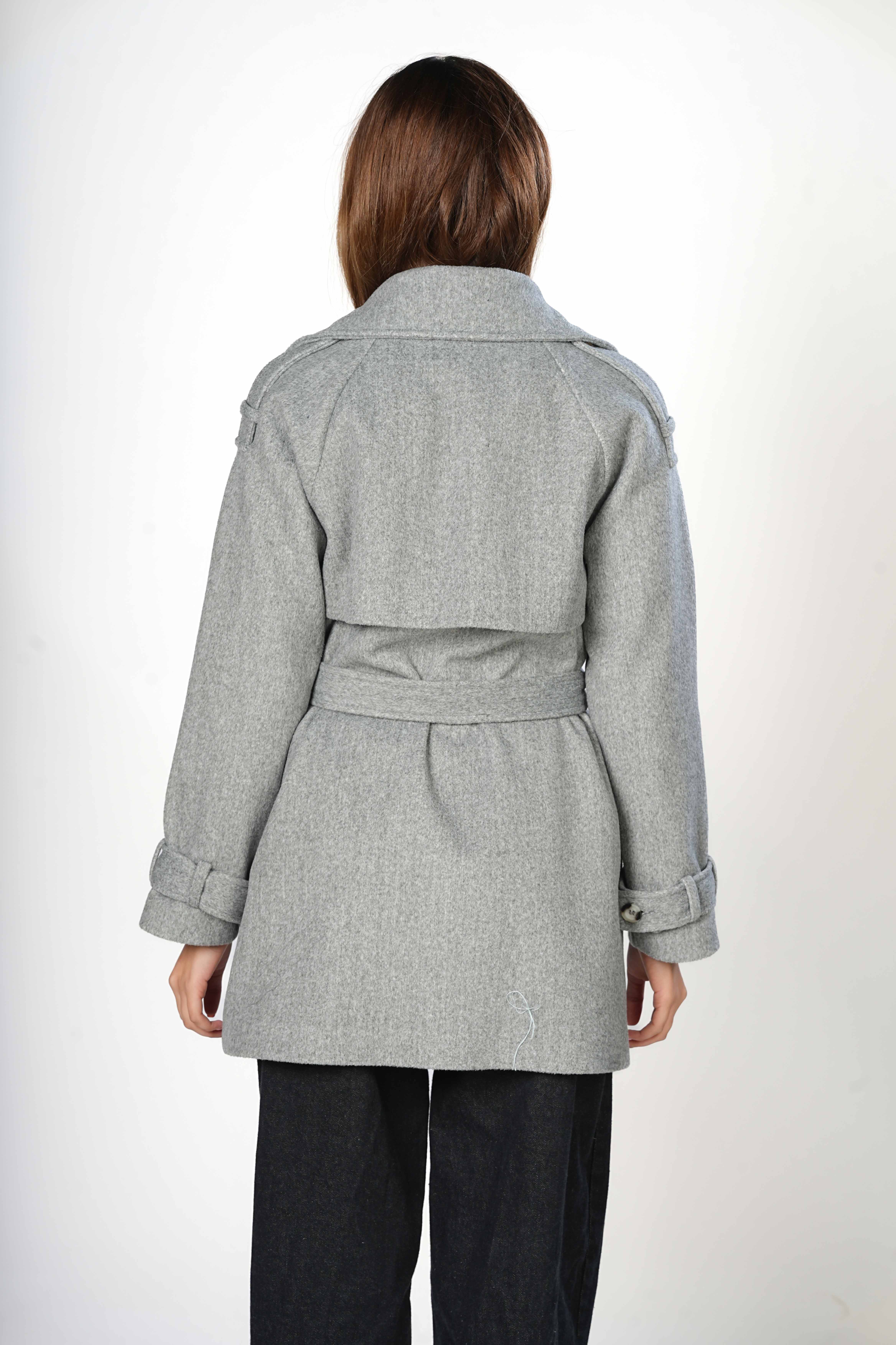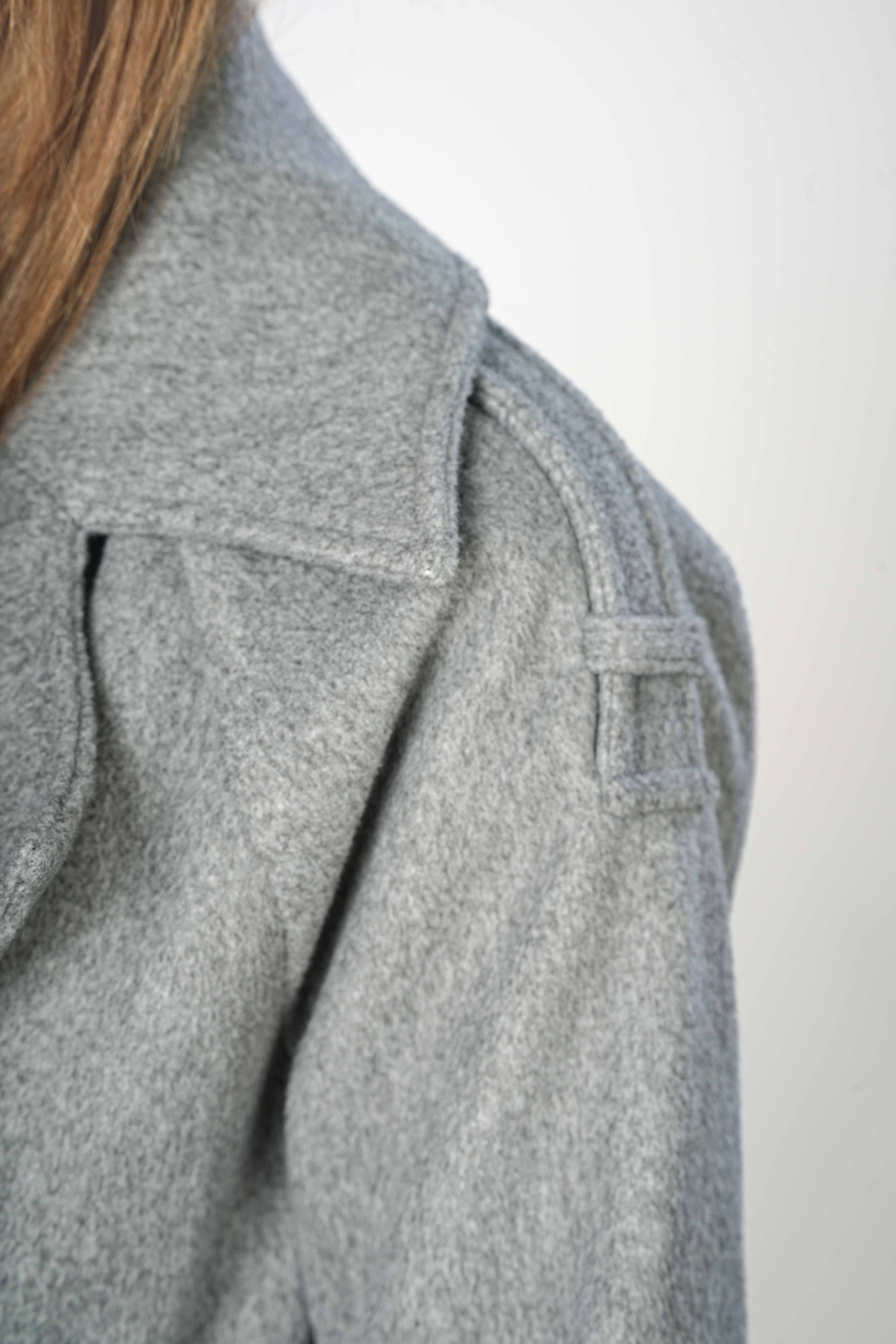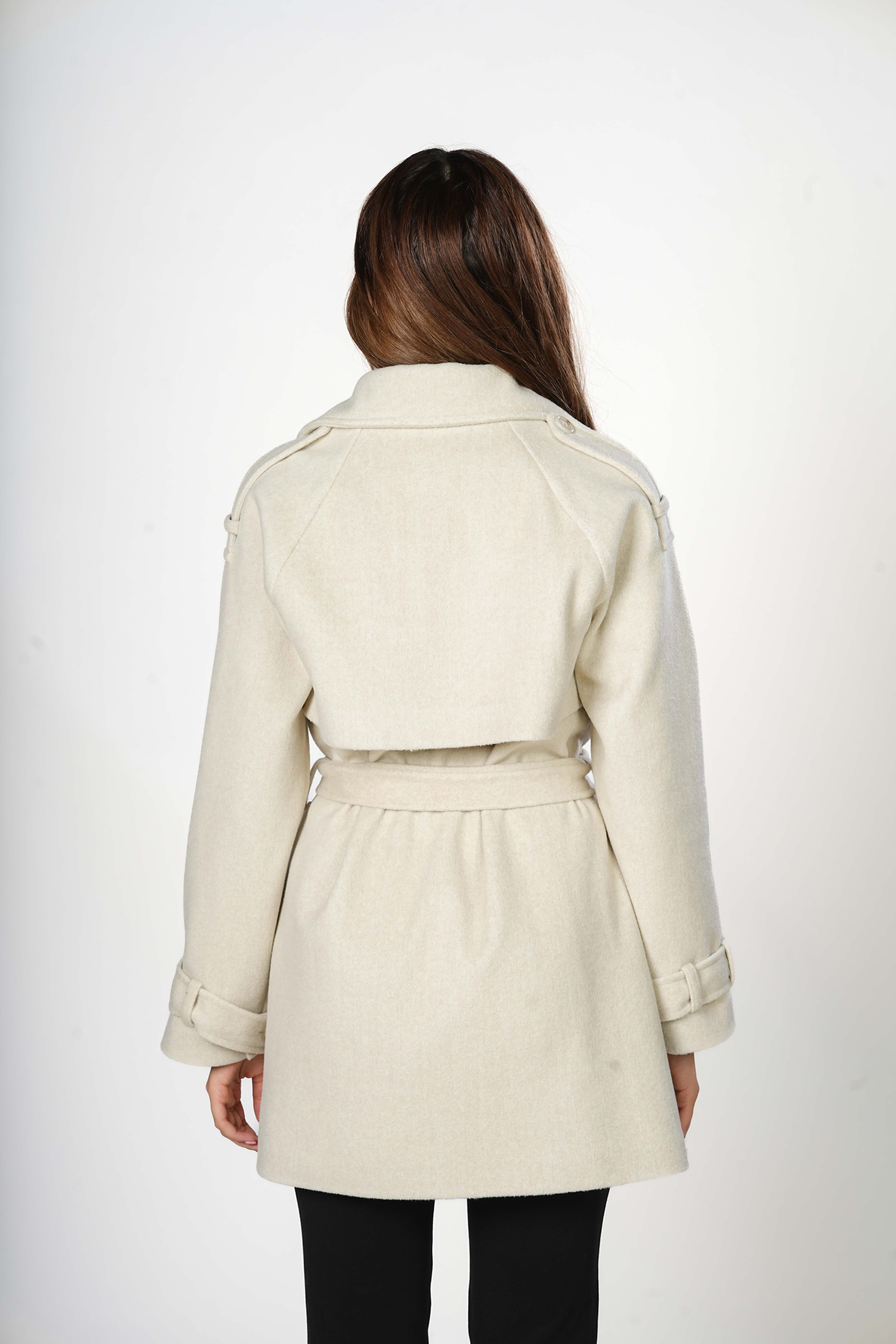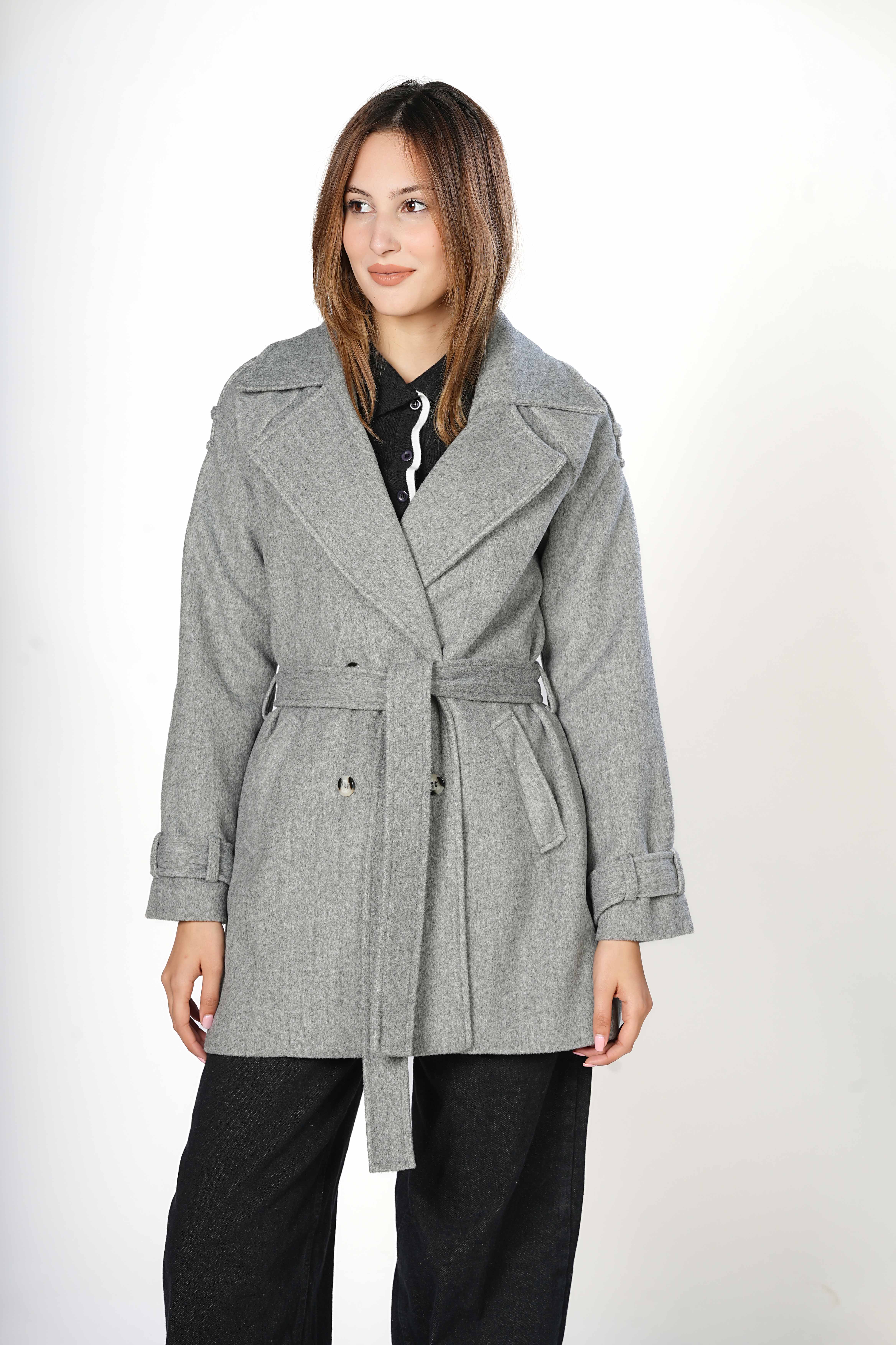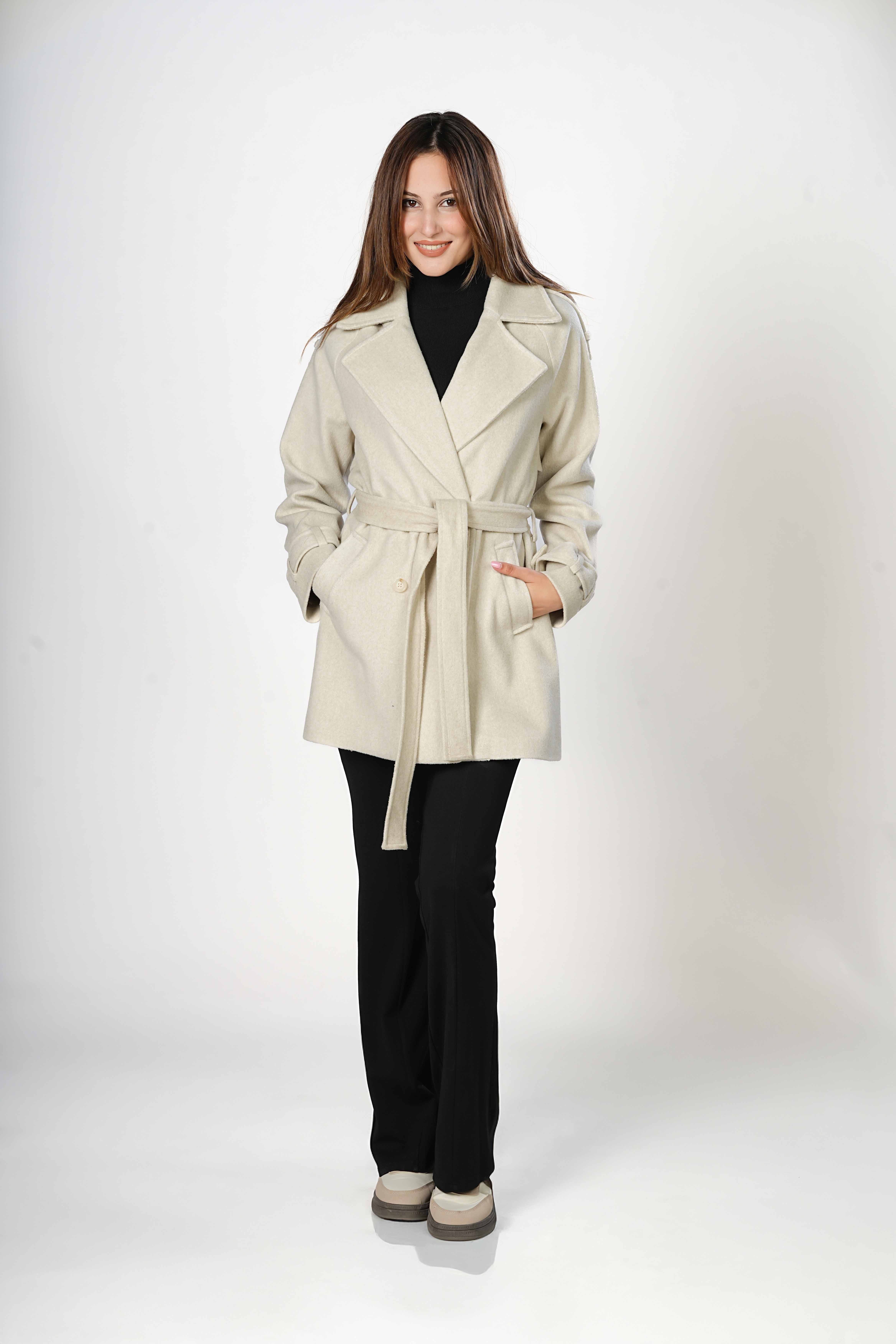 Ce manteau court se distingue par son tissu drapé. Doté d'un col à revers prononcé et d'une ceinture à nouer à la taille, il offre une silhouette moderne et chic. Parfait pour la mi-saison ou les superpositions hivernales