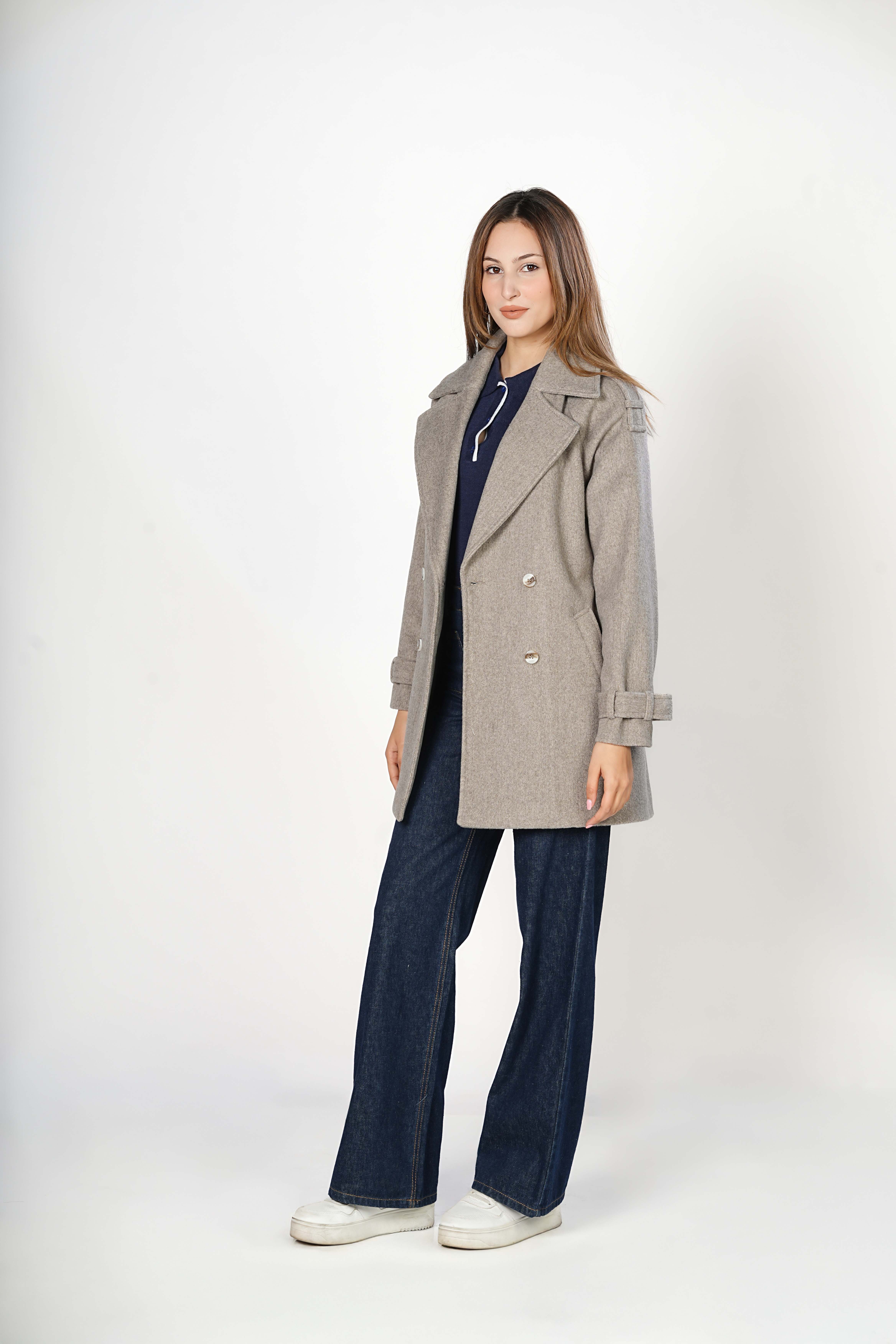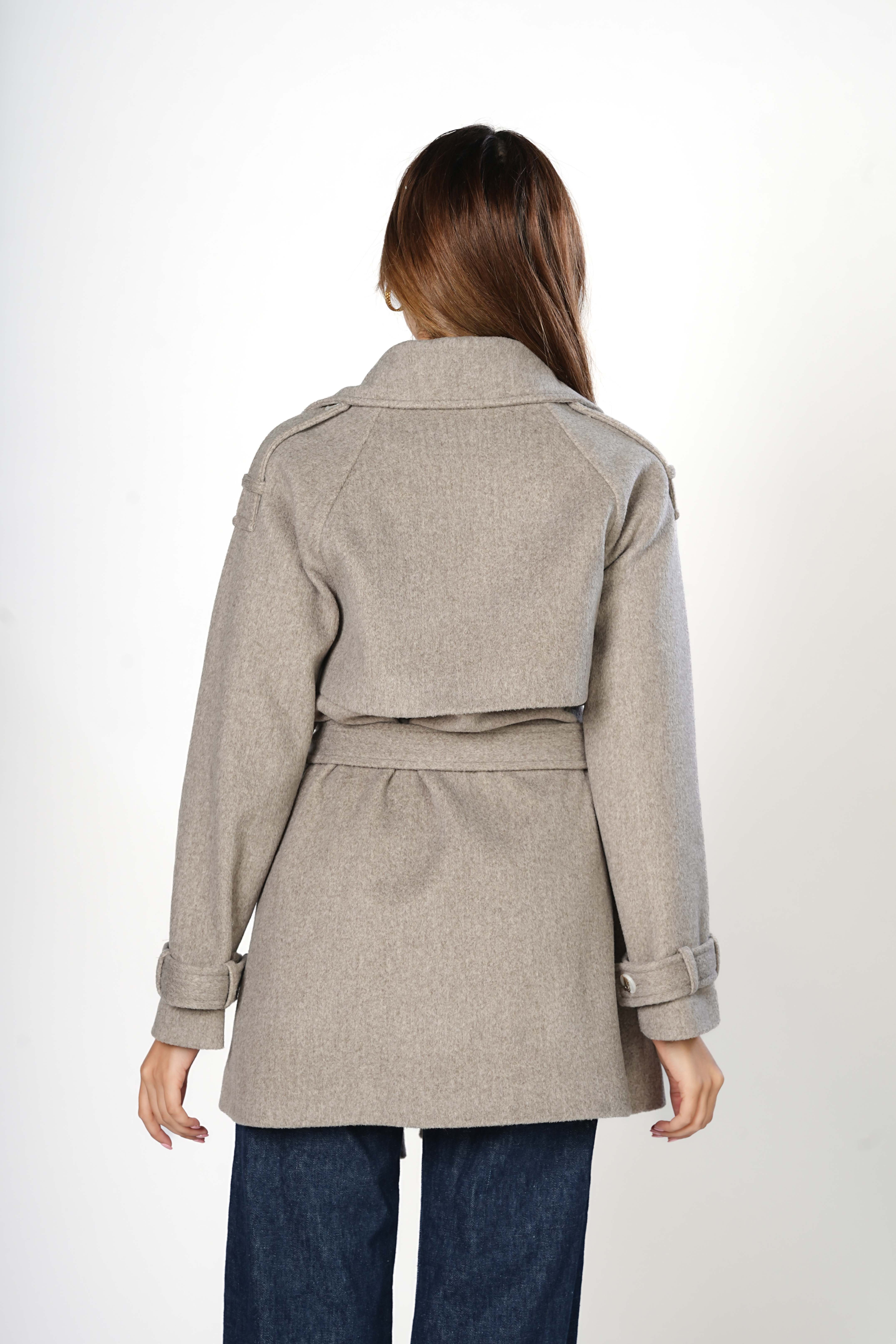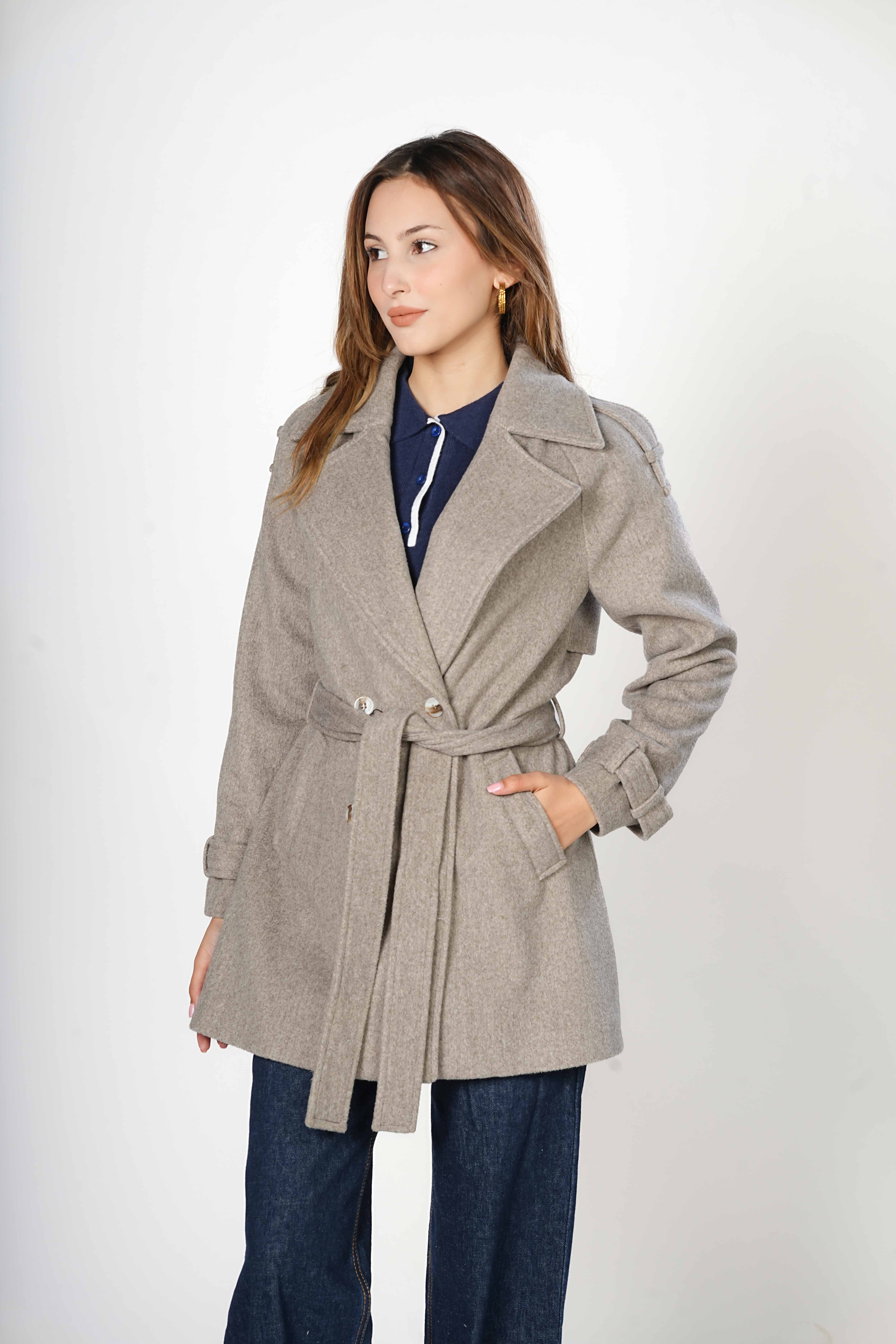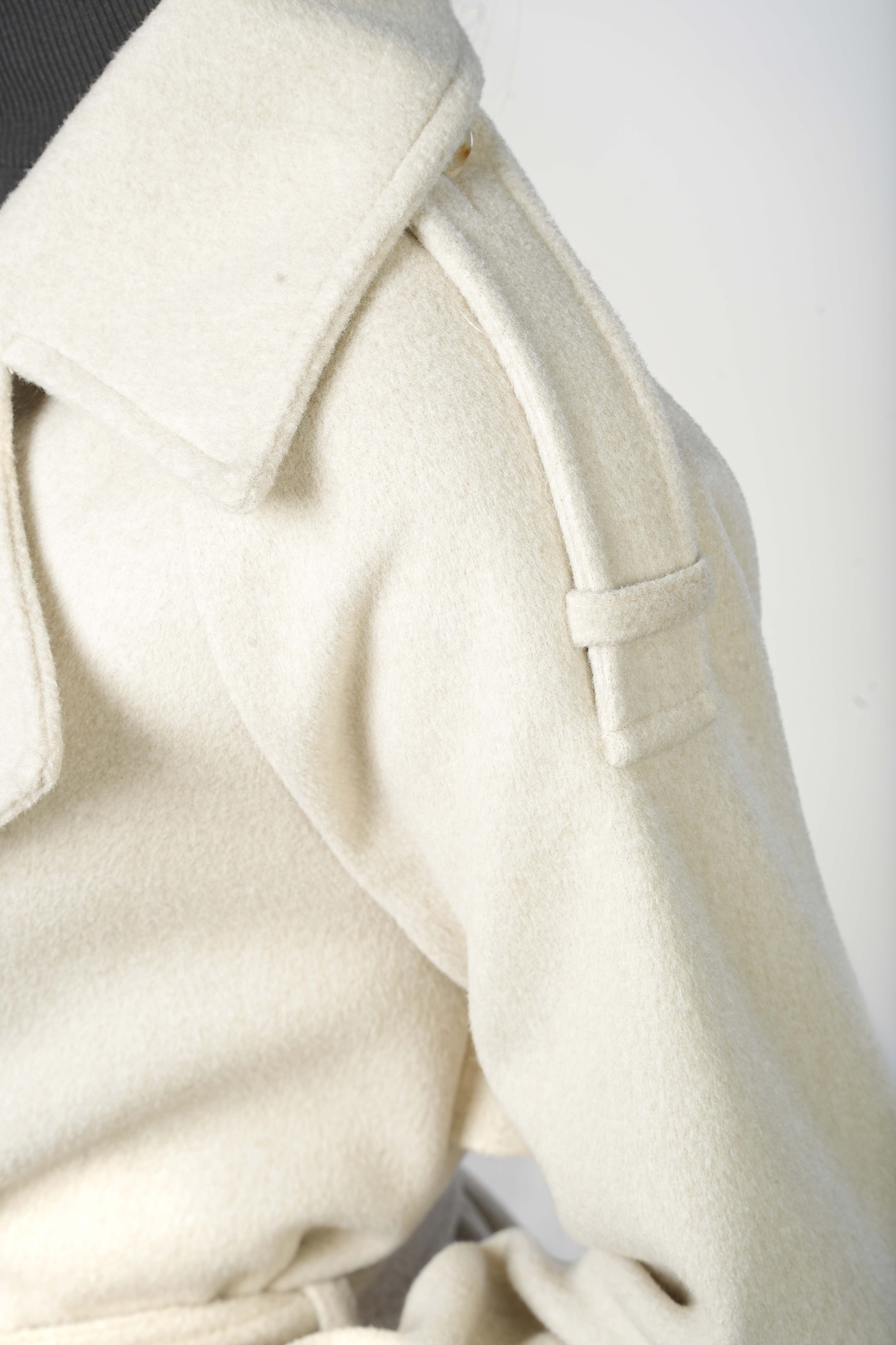 Ce manteau court se distingue par son tissu drapé. Doté d'un col à revers prononcé et d'une ceinture à nouer à la taille, il offre une silhouette moderne et chic. Parfait pour la mi-saison ou les superpositions hivernales