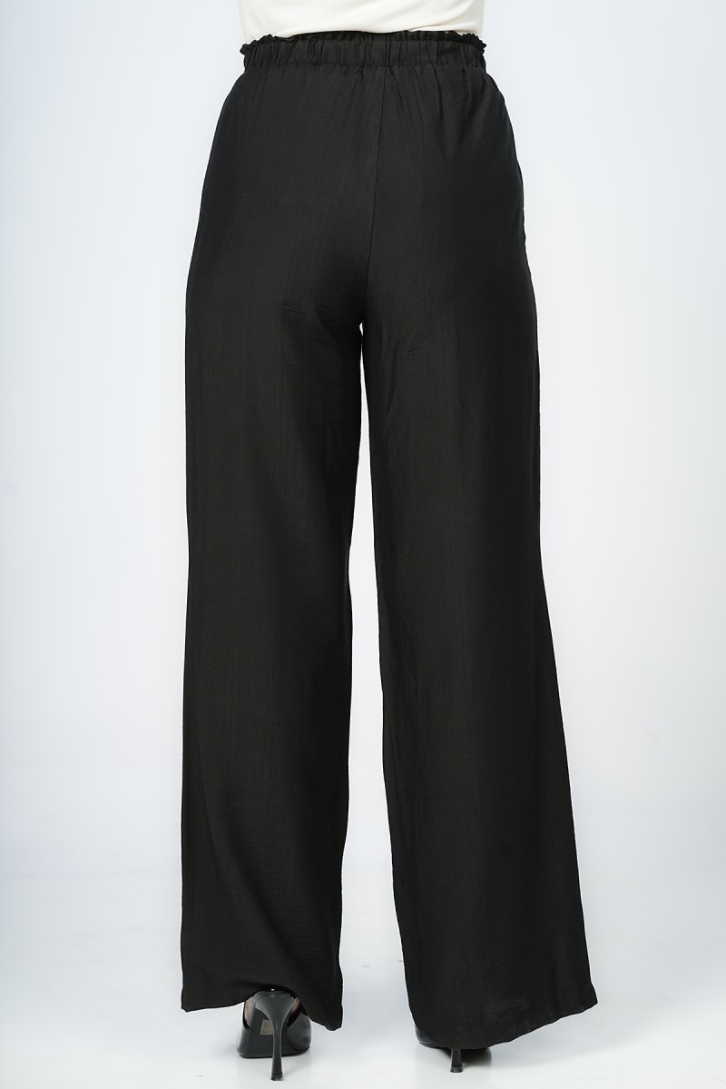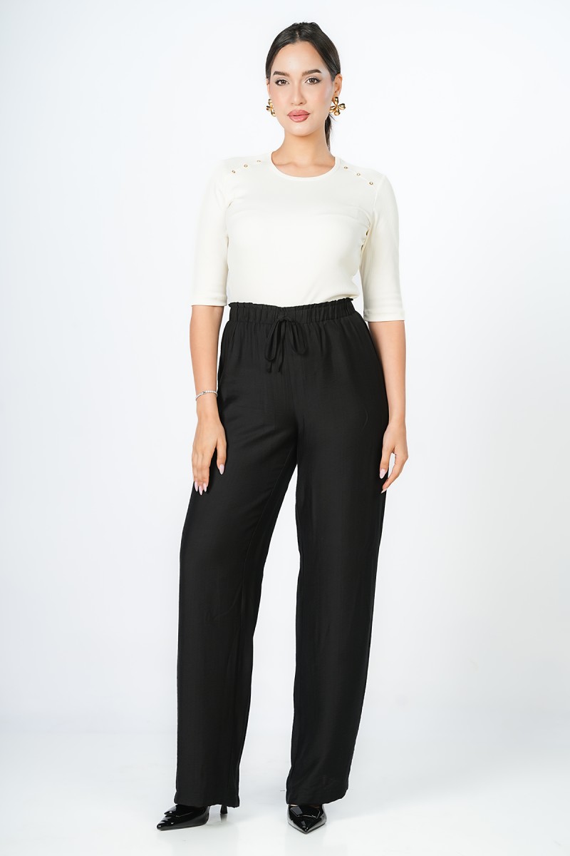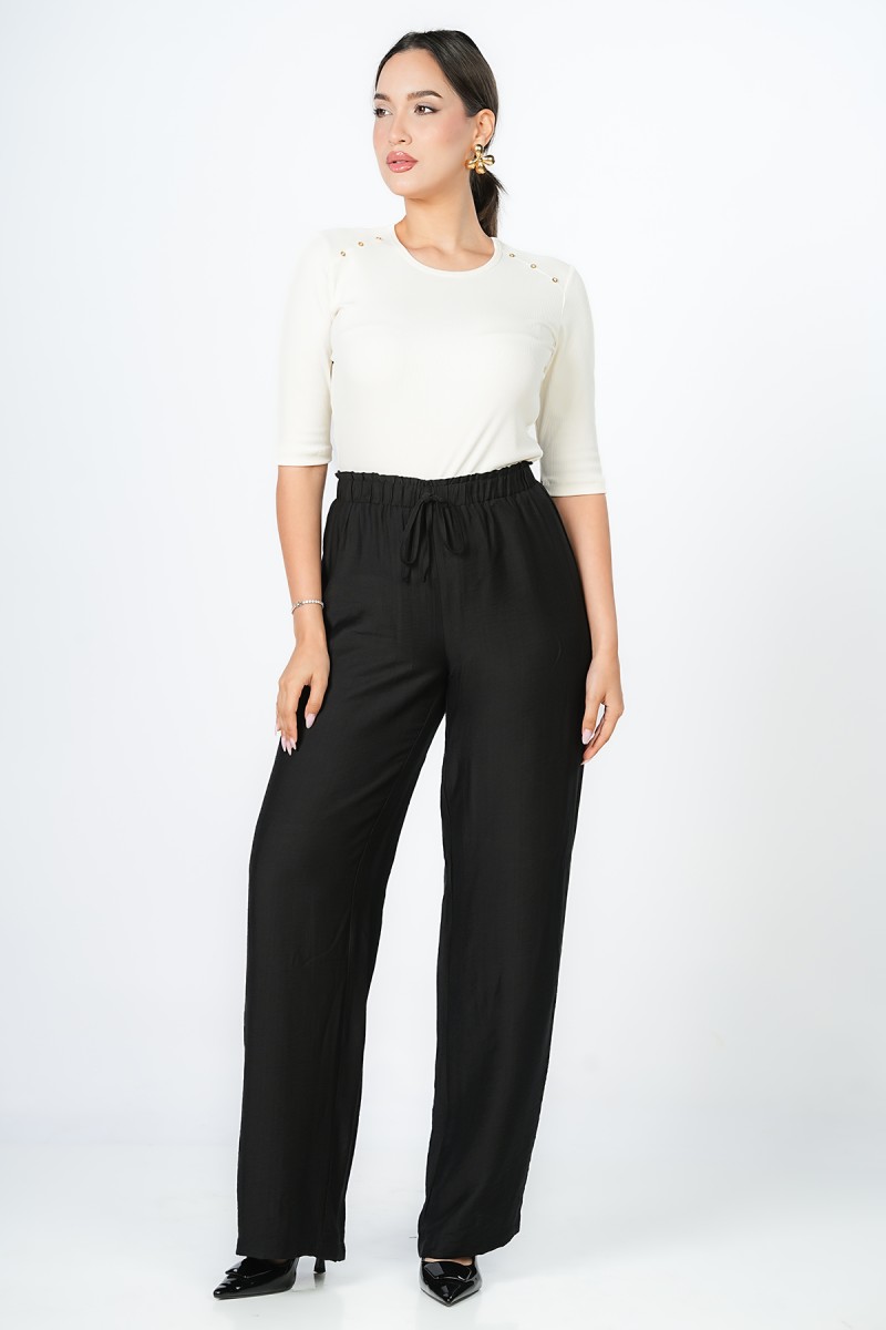 Pantalon Wide-leg à ceinture élastique sans fermeture offrant une silhouette fluide et épurée pour une allure Contemporary Minimalist, un essentiel Modern Tailoring qui allie confort absolu et élégance sophistiquée.