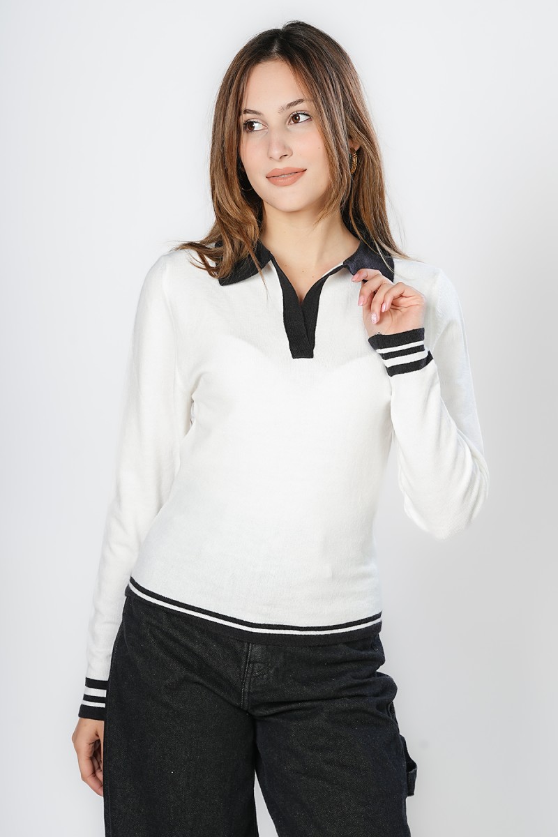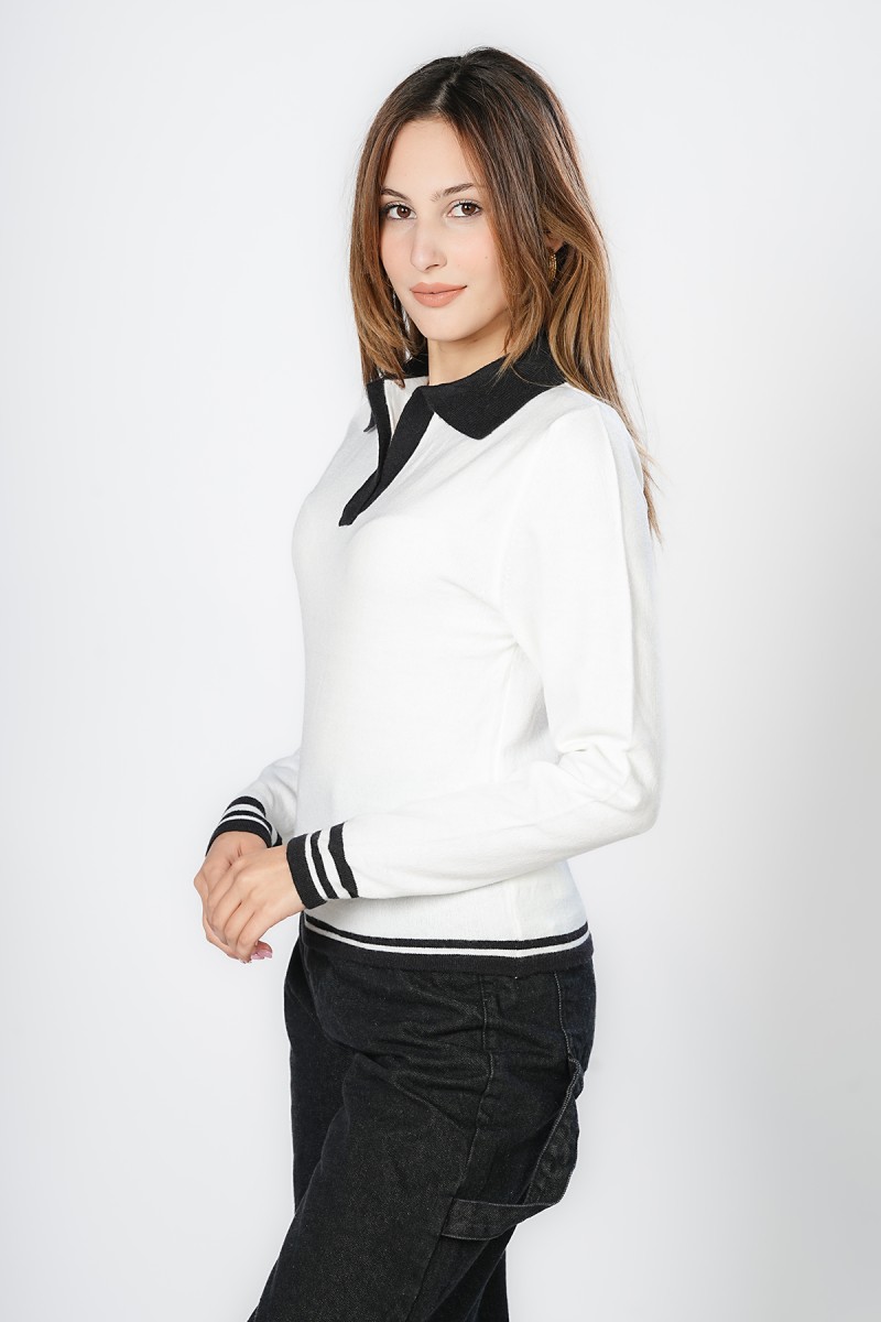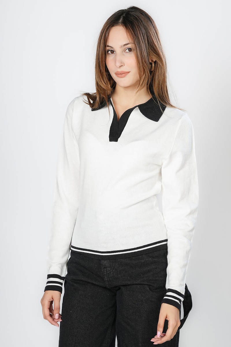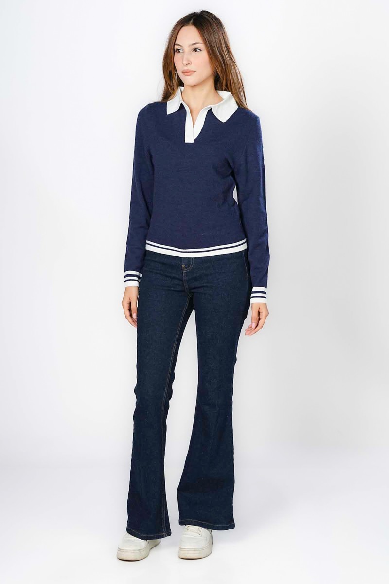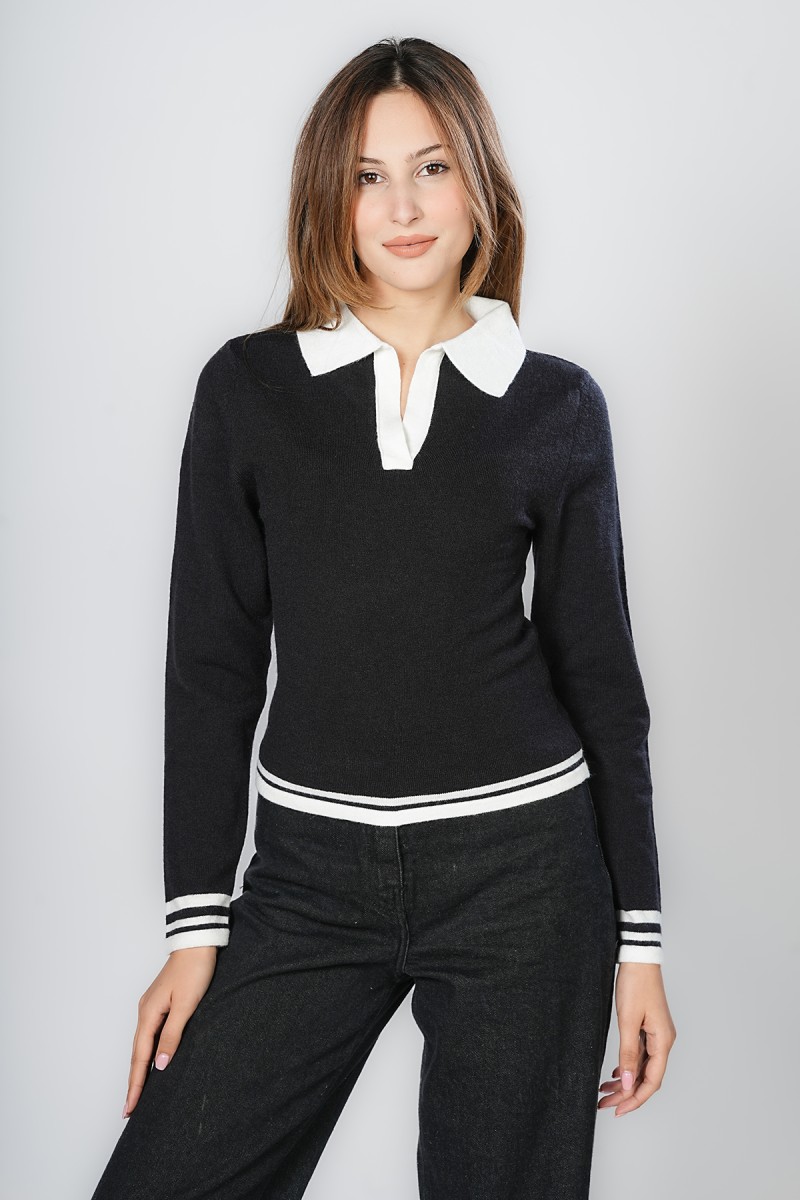 Pull polo Basique ajusté, avec col blanc contrastant et ouverture en V. Fines rayures blanches sur les manches et la taille pour une touche élégante et légèrement nautique. Parfait pour un look preppy ou chic décontracté