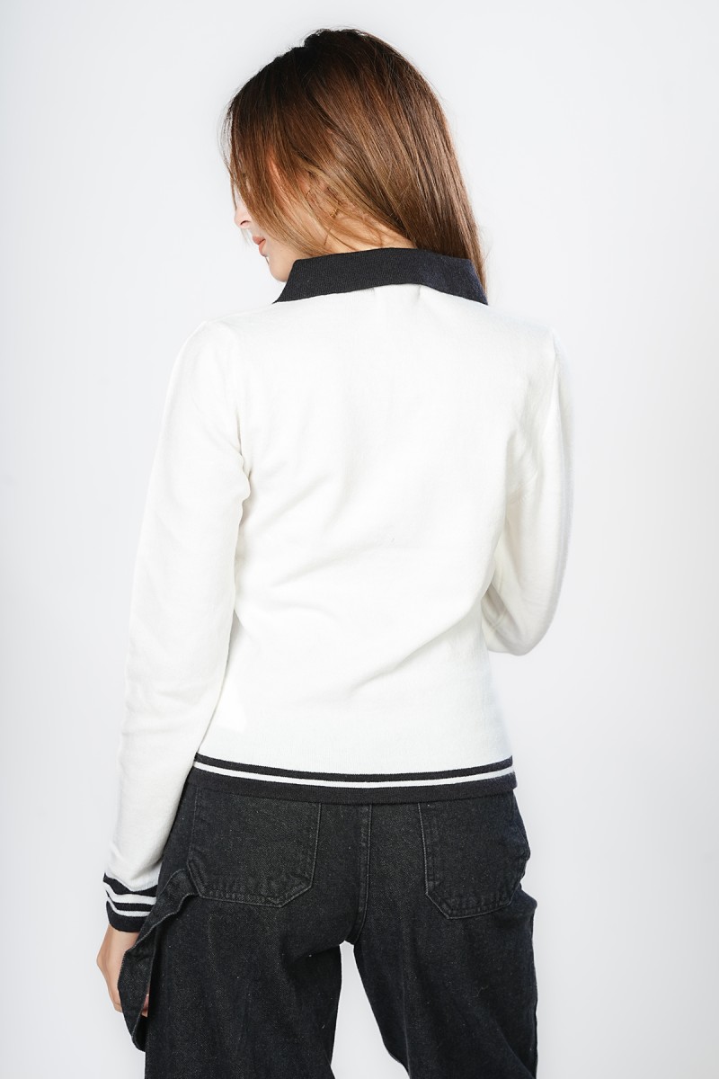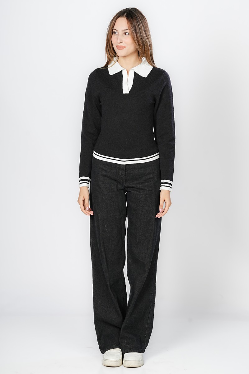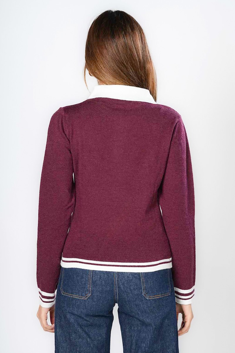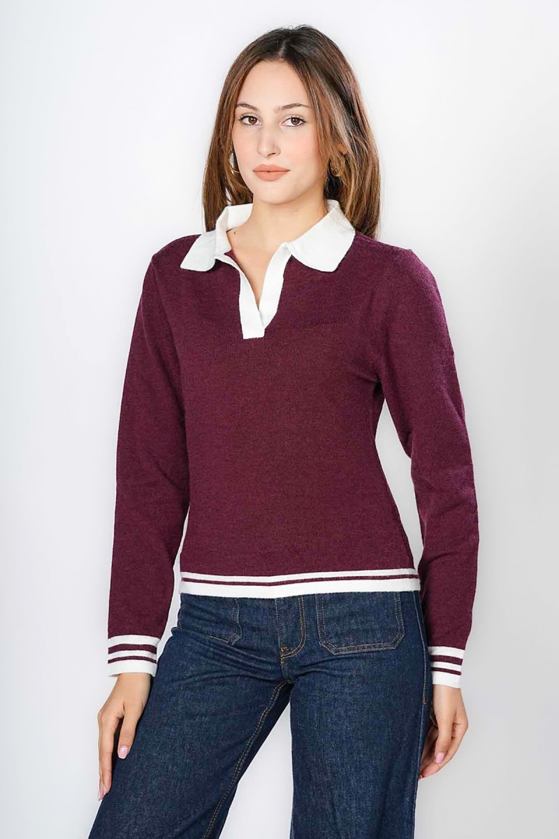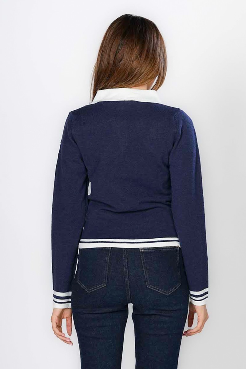 Pull polo Basique ajusté, avec col blanc contrastant et ouverture en V. Fines rayures blanches sur les manches et la taille pour une touche élégante et légèrement nautique. Parfait pour un look preppy ou chic décontracté