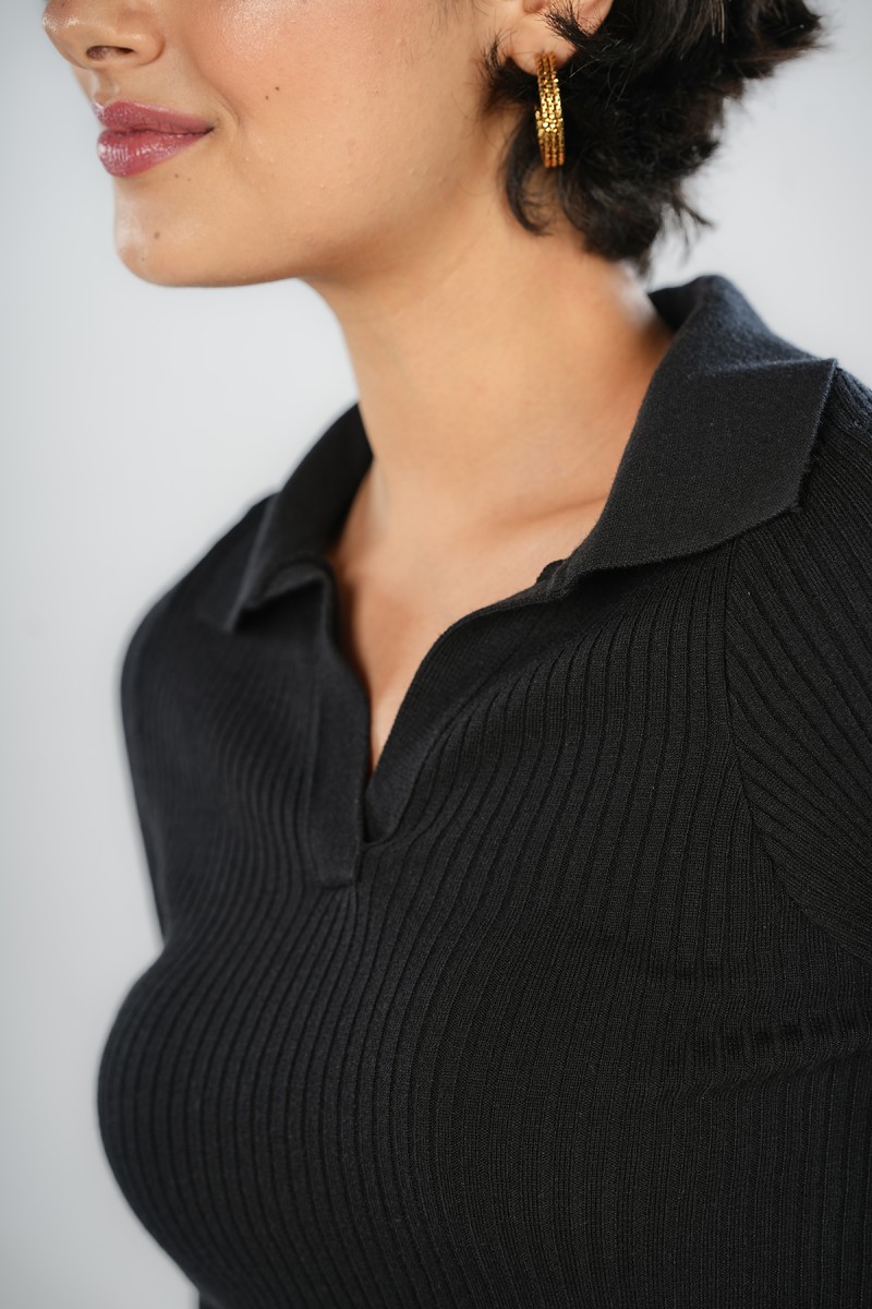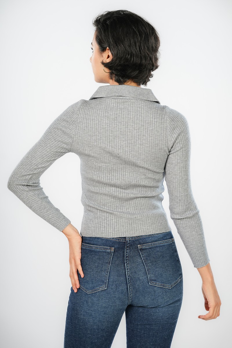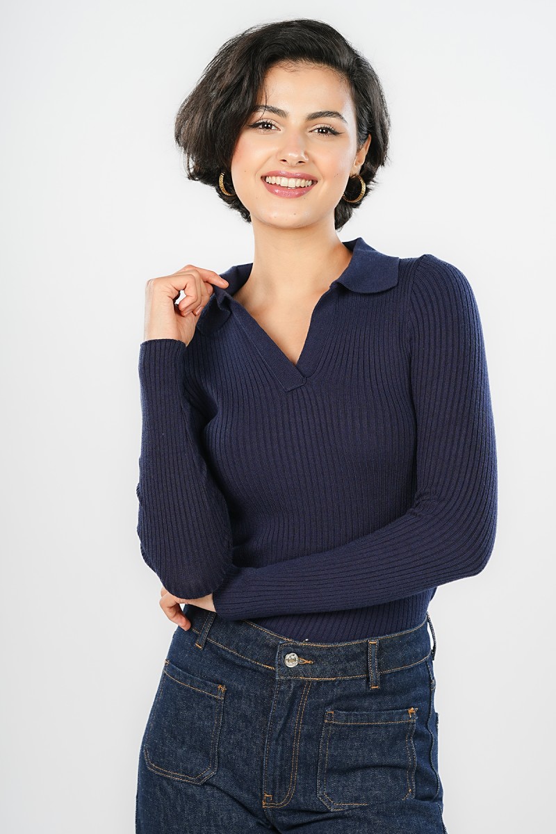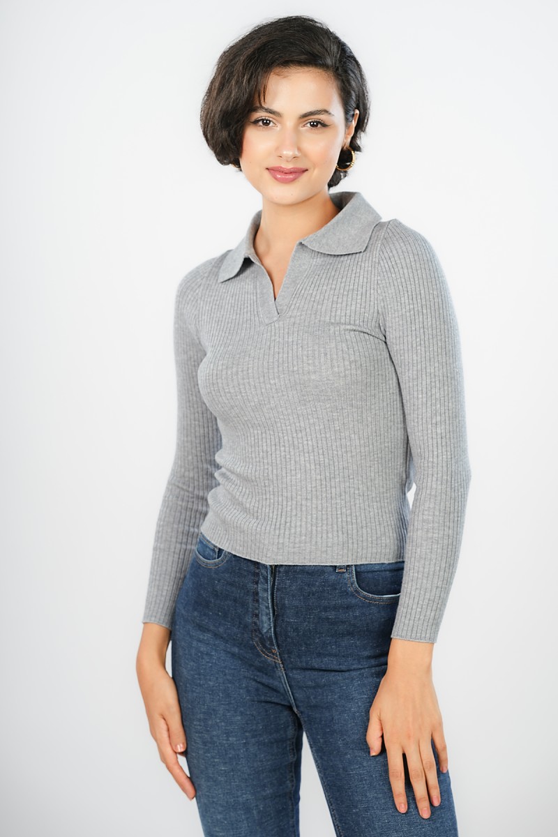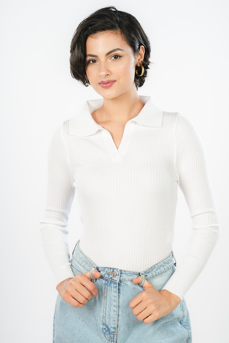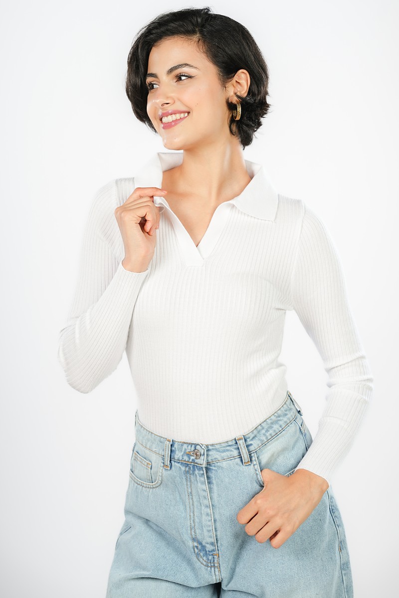Pull maille fine courte à col polo, confortable et ajusté. Facile à porter avec jean, pantalon ou jupe pour un look moderne au quotidien.