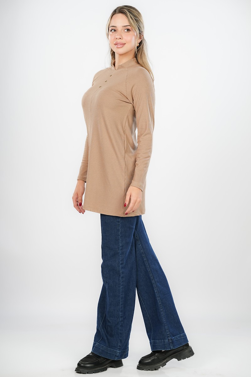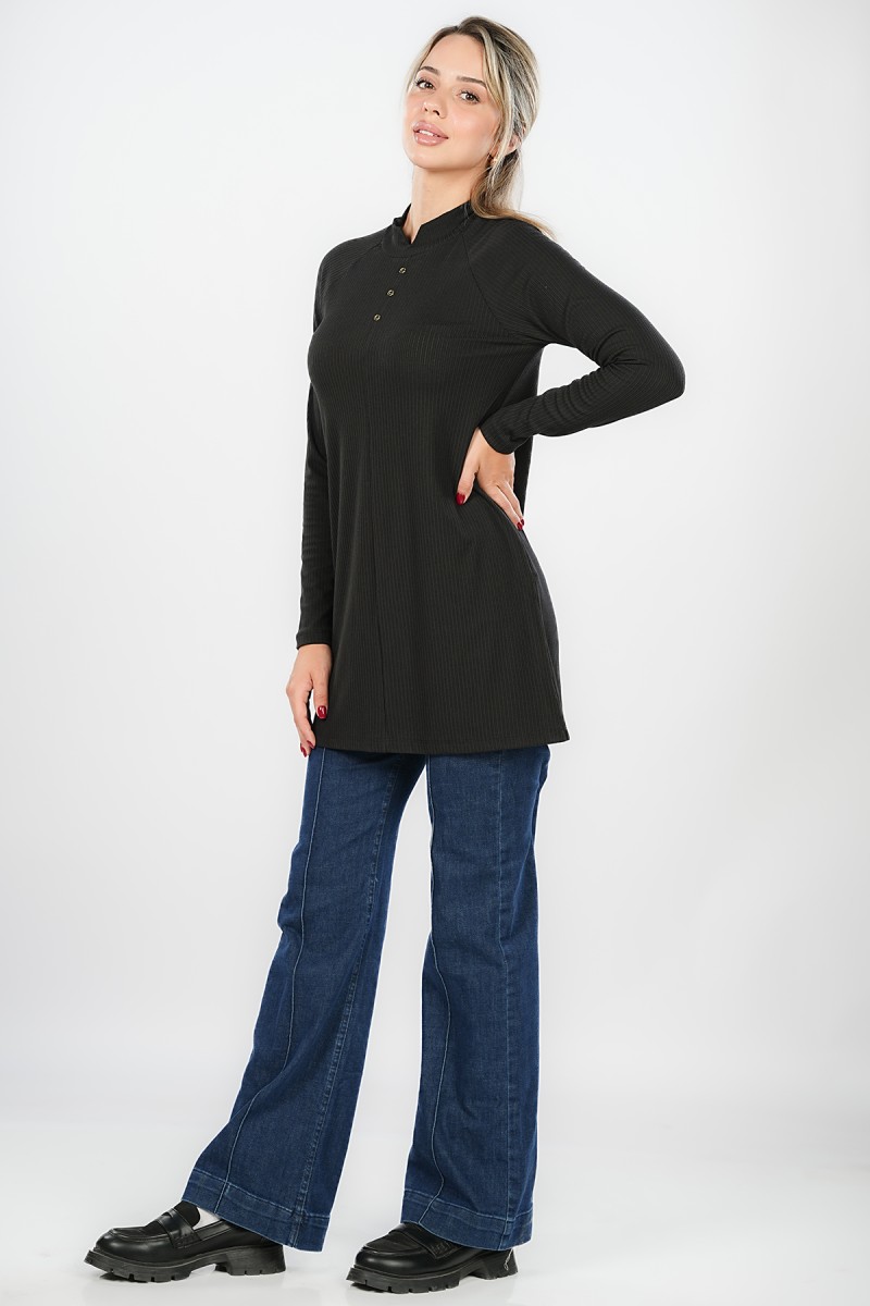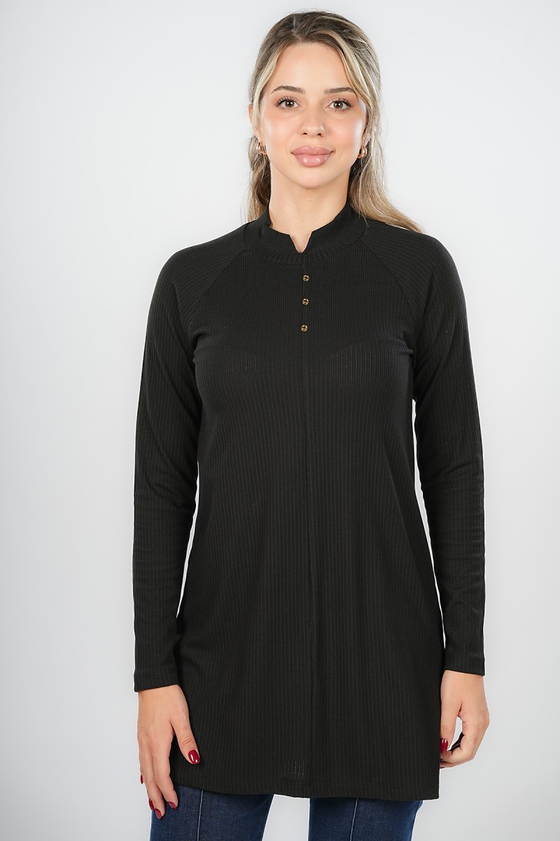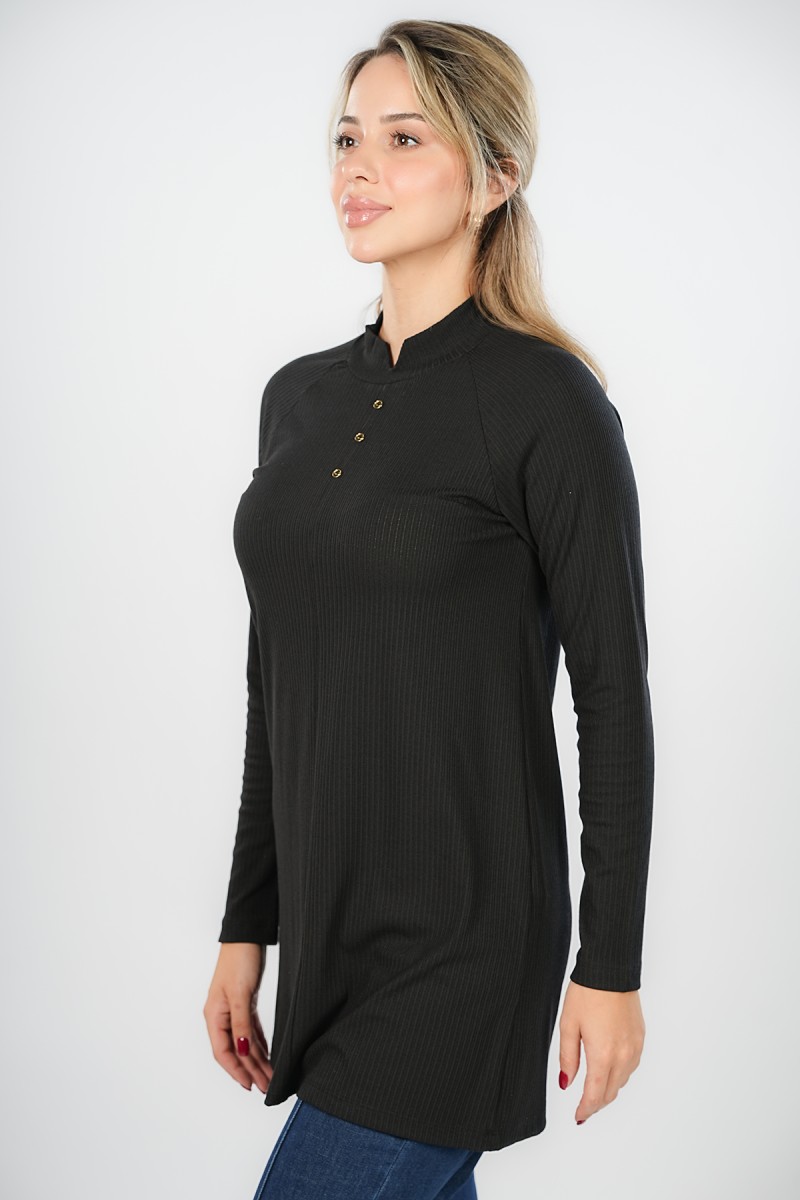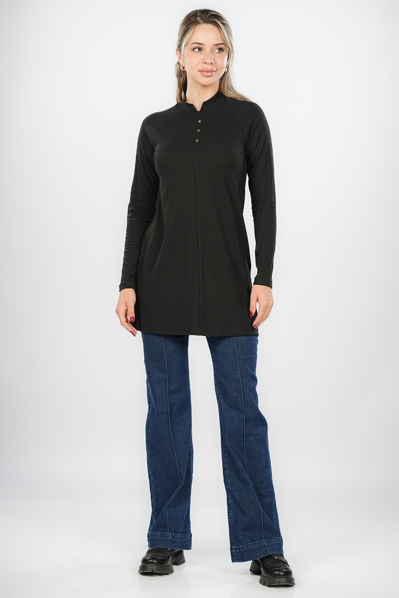 Pull long à boutons au col avec petit décolleté en V, idéal pour les femmes voilées ou celles qui préfèrent un style plus réservé.