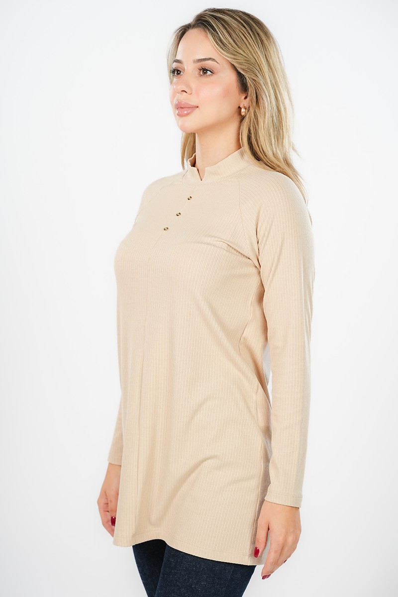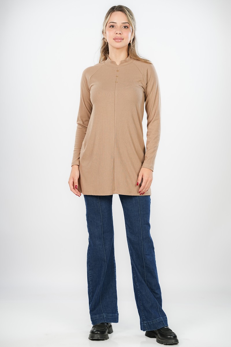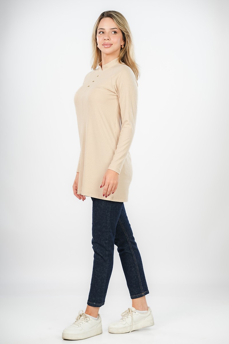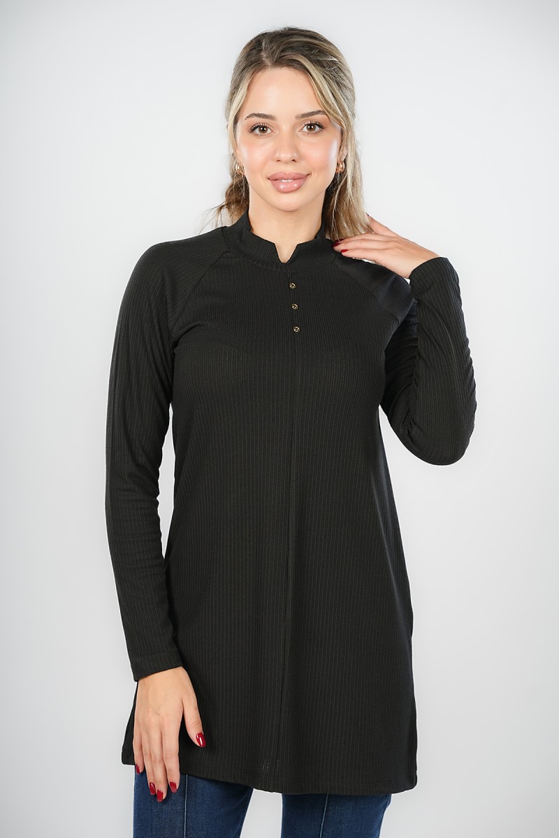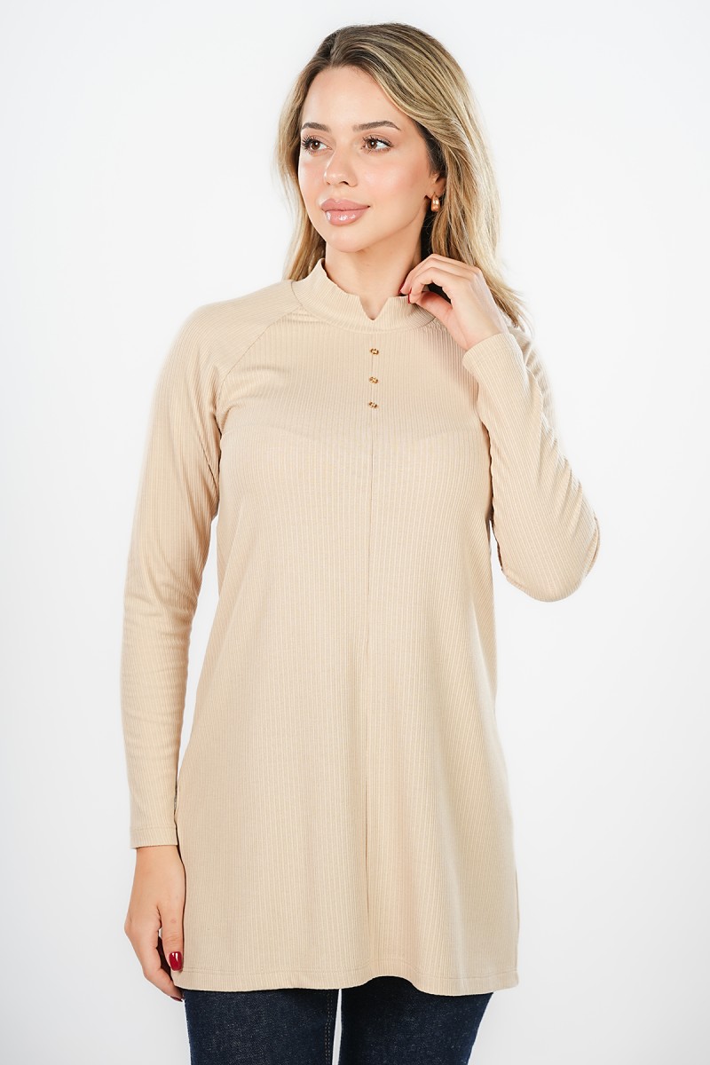 Pull long à boutons au col avec petit décolleté en V, idéal pour les femmes voilées ou celles qui préfèrent un style plus réservé.