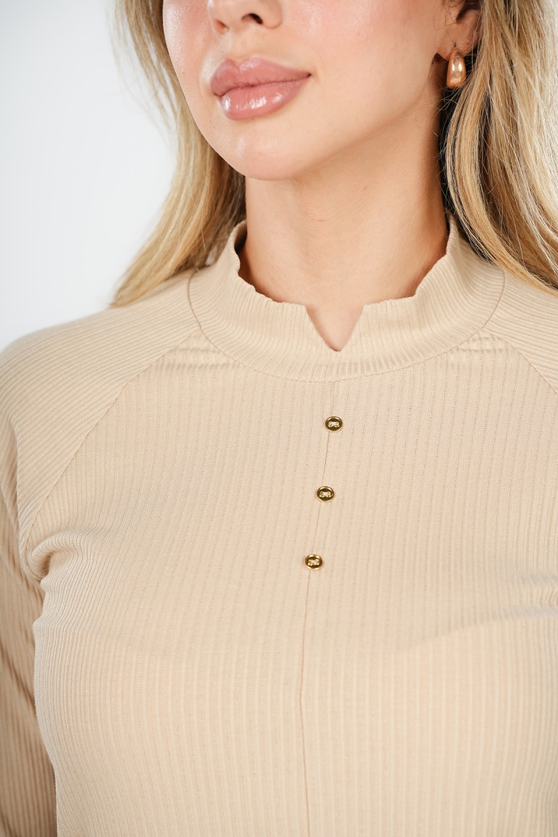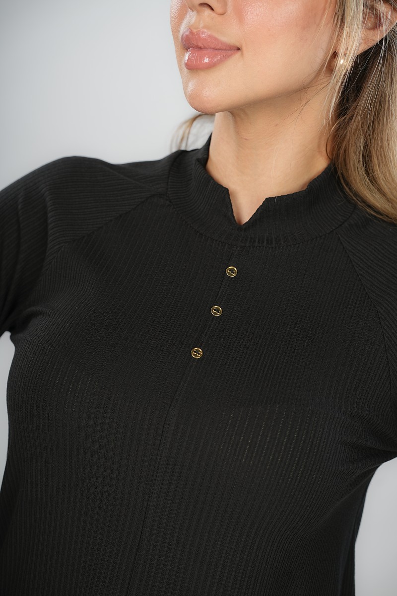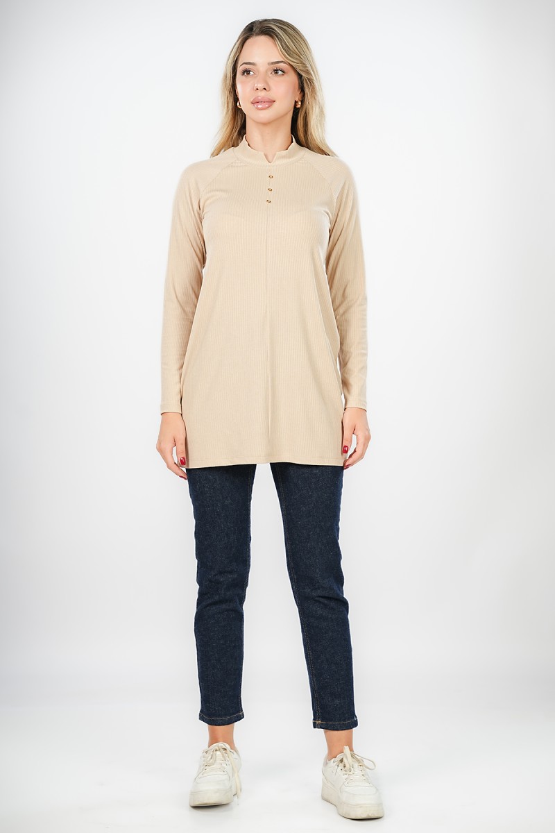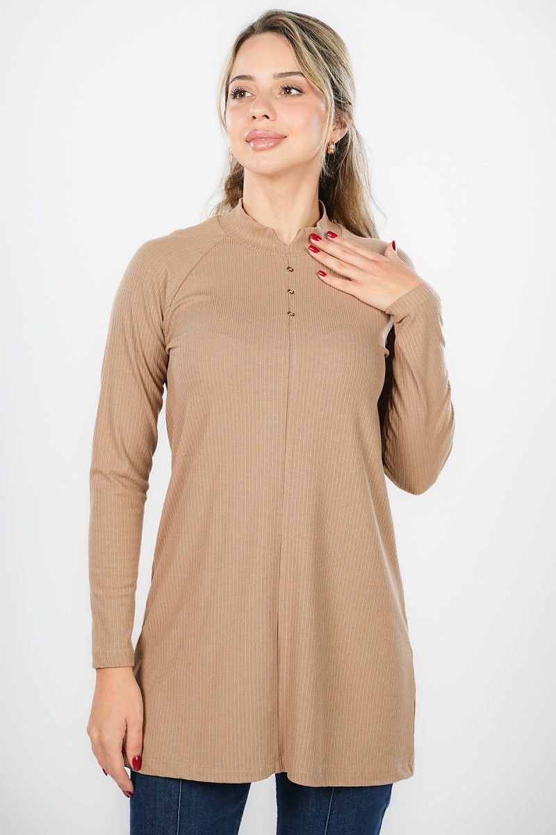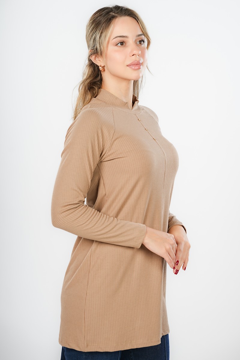 Pull long à boutons au col avec petit décolleté en V, idéal pour les femmes voilées ou celles qui préfèrent un style plus réservé.