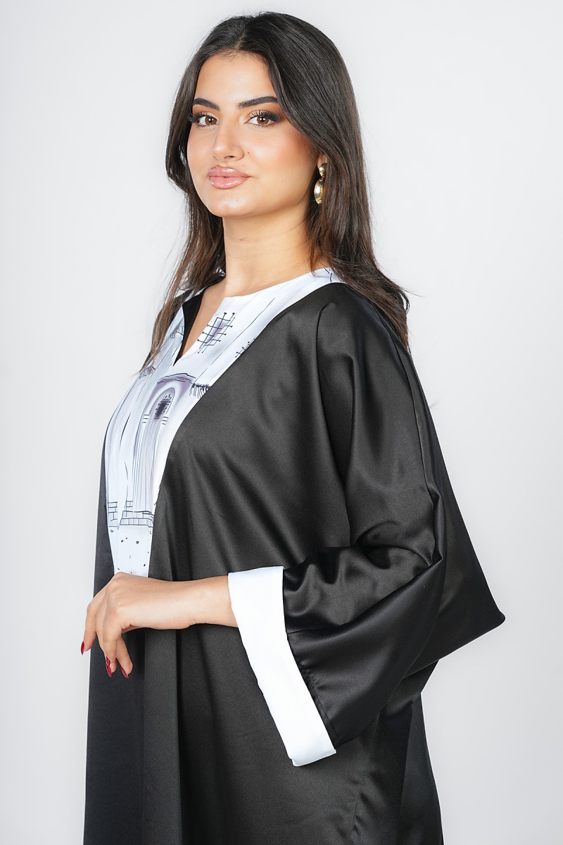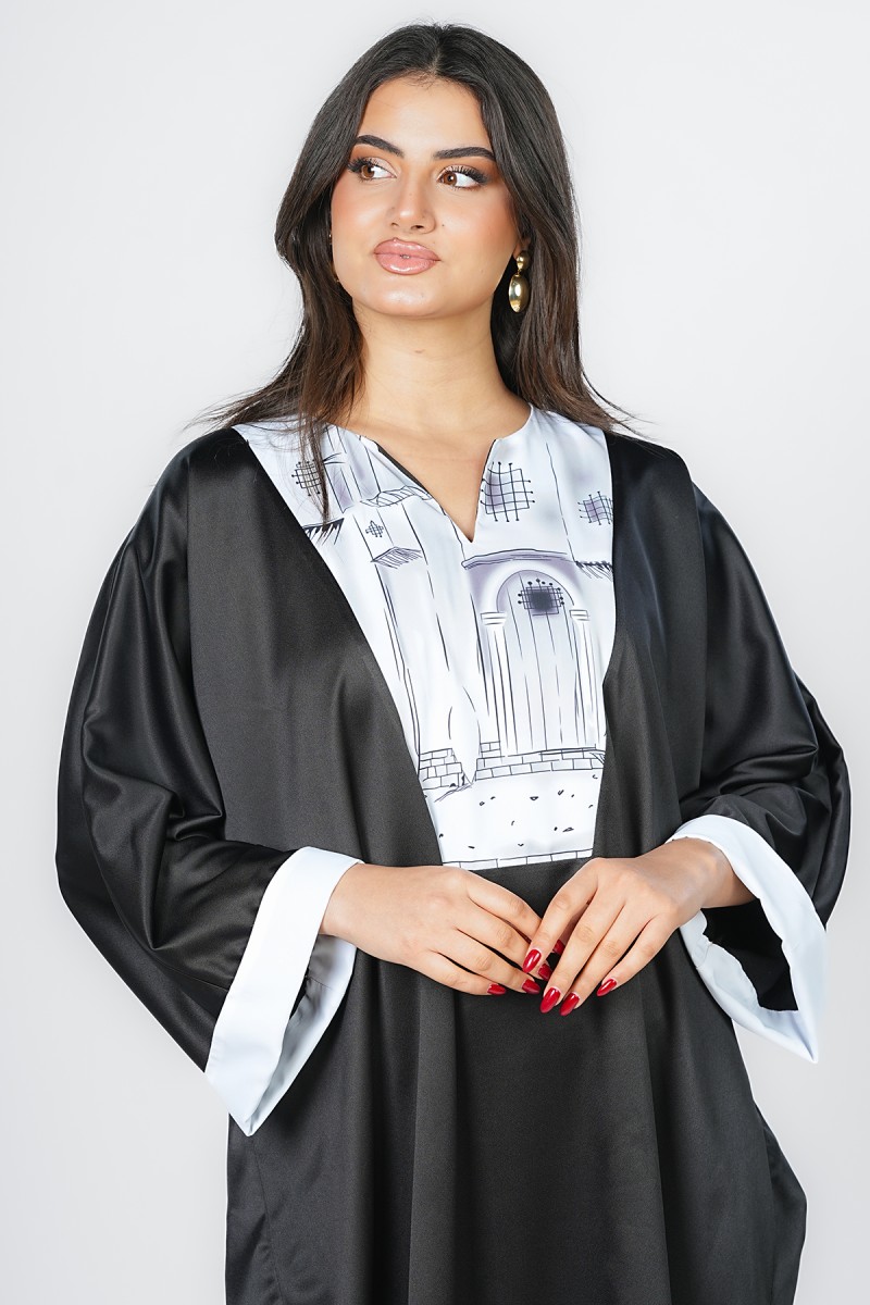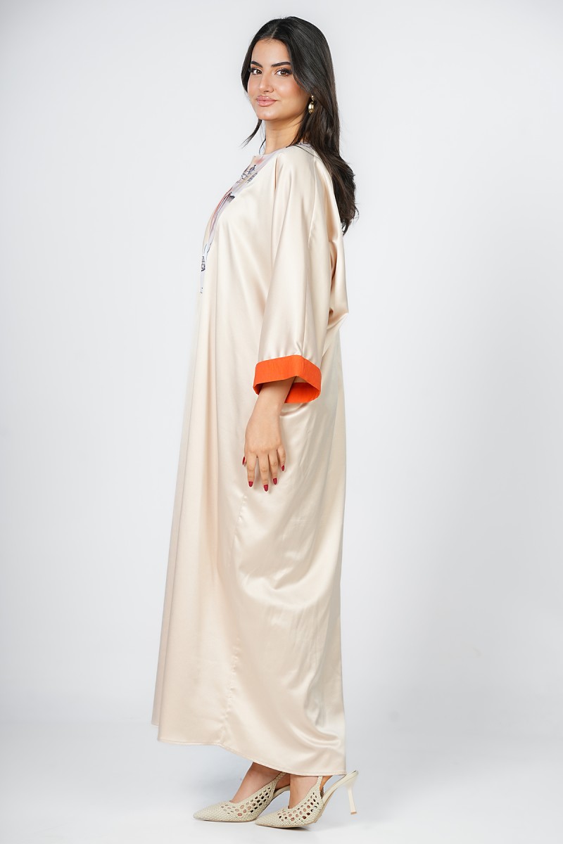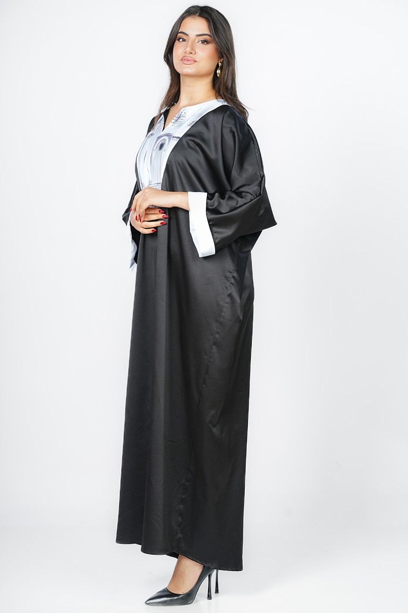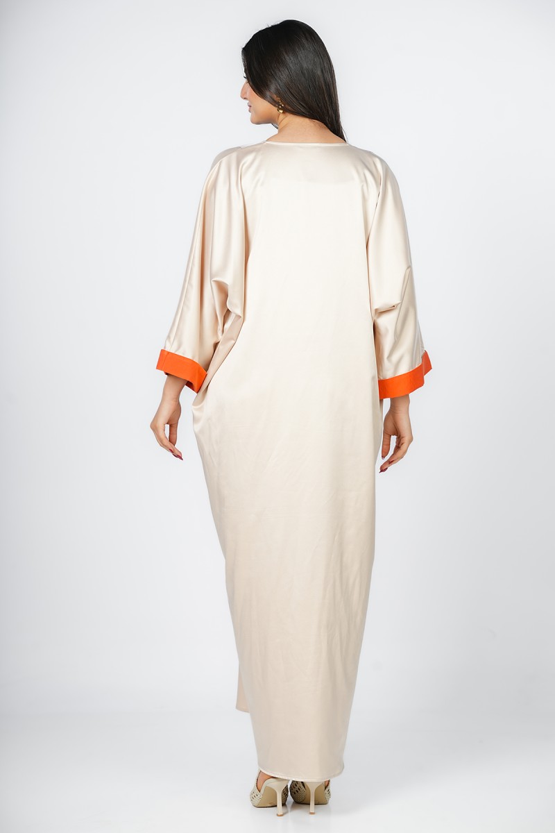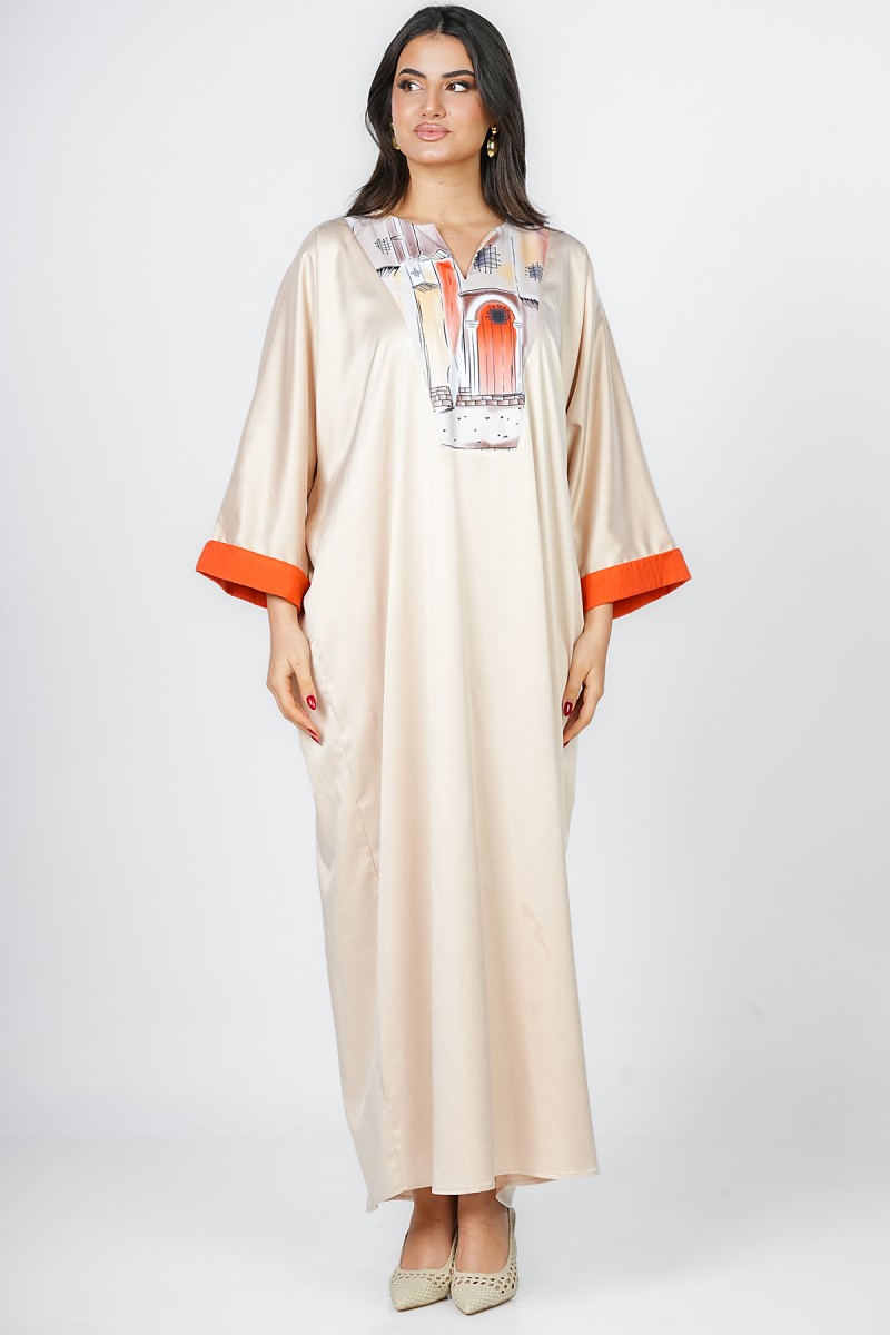 Rayonnez d'élégance avec cette robe caftan en satin fluide. Ornée d'un imprimé graphique exclusif au décolleté et de larges revers contrastés aux manches, elle offre une silhouette noble et moderne pour toutes vos célébrations.