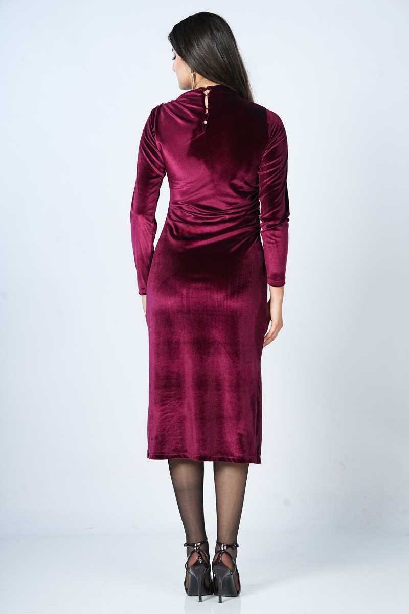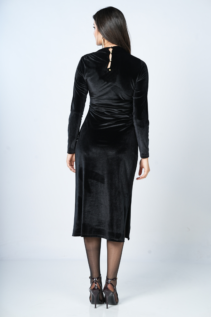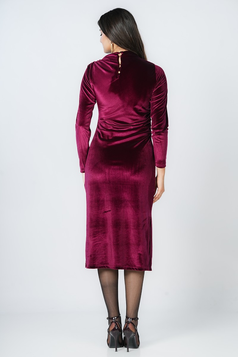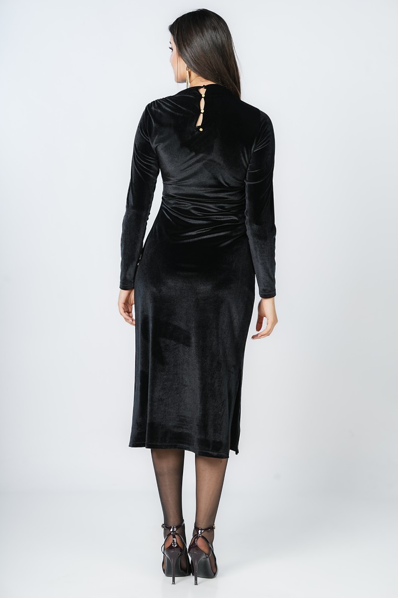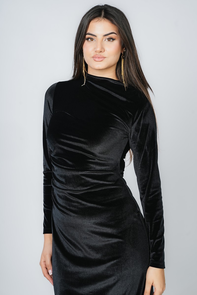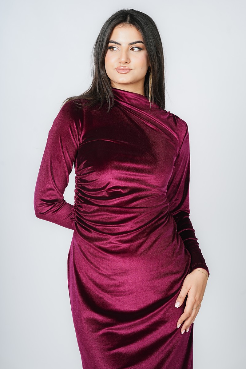 Découvrez cette robe midi en velours d’une élégance rare. Son col montant raffiné et son drapé latéral cintrent parfaitement la taille, tandis que sa fente discrète apporte une touche de modernité. Une pièce sophistiquée pour toutes vos occasions spéciales