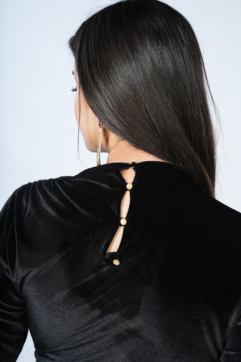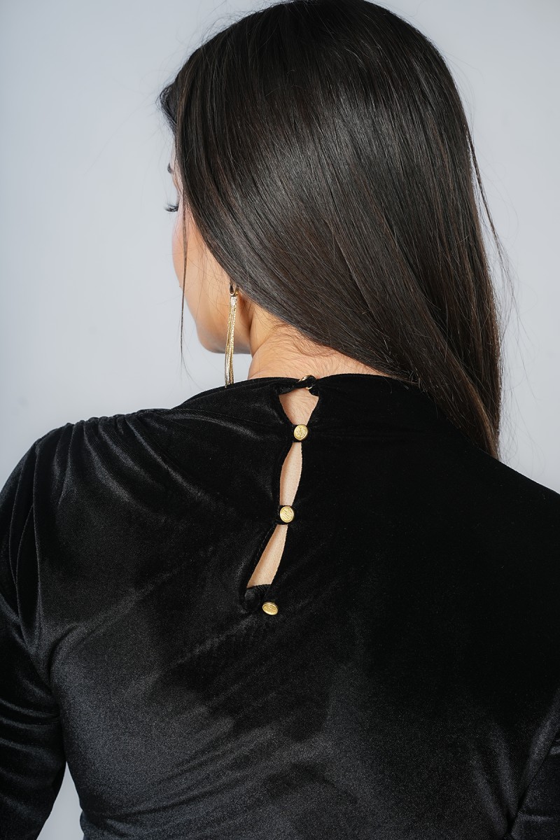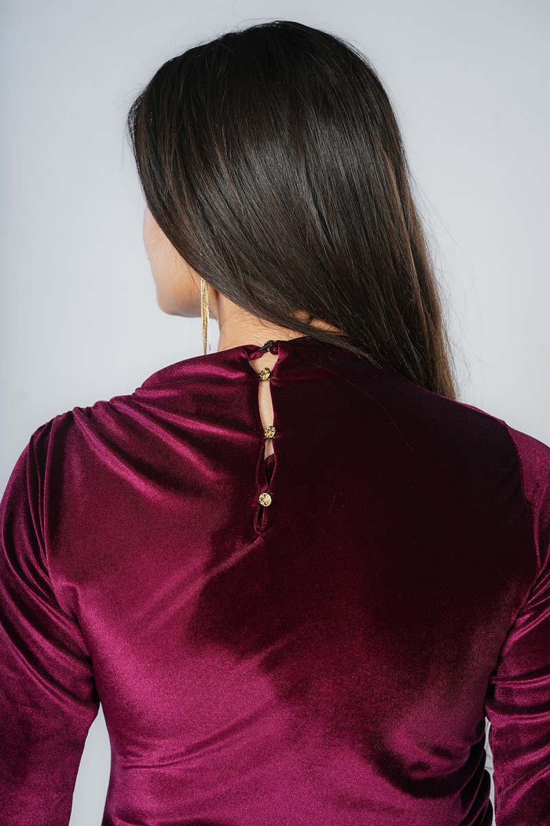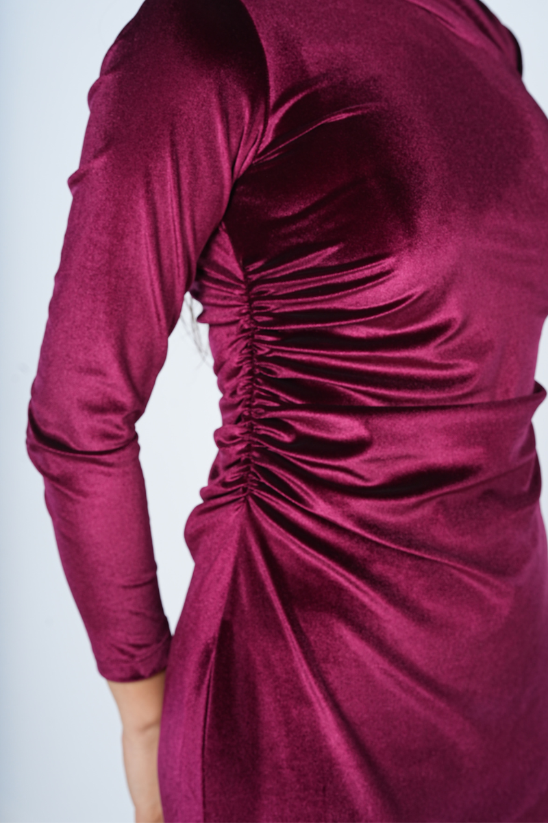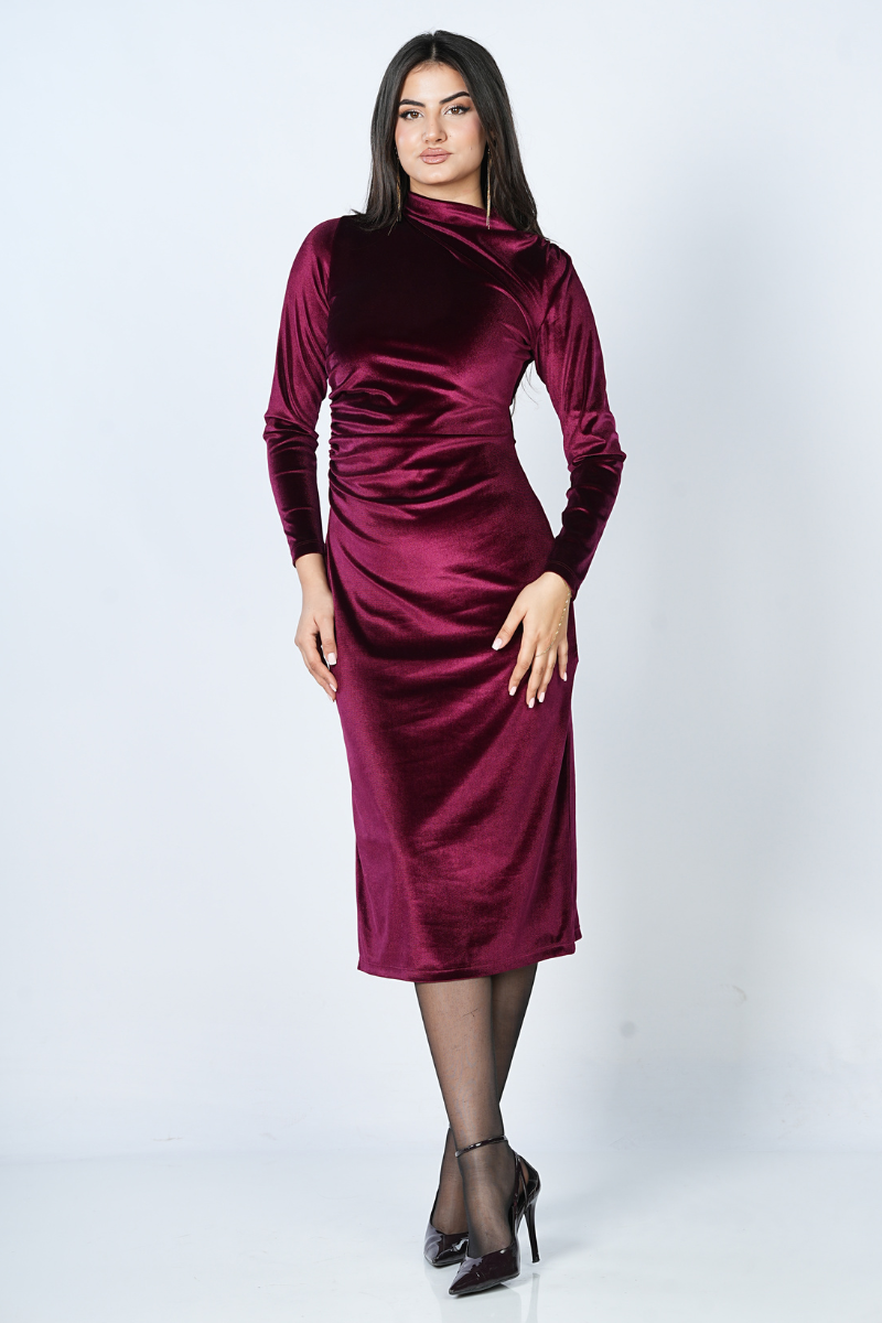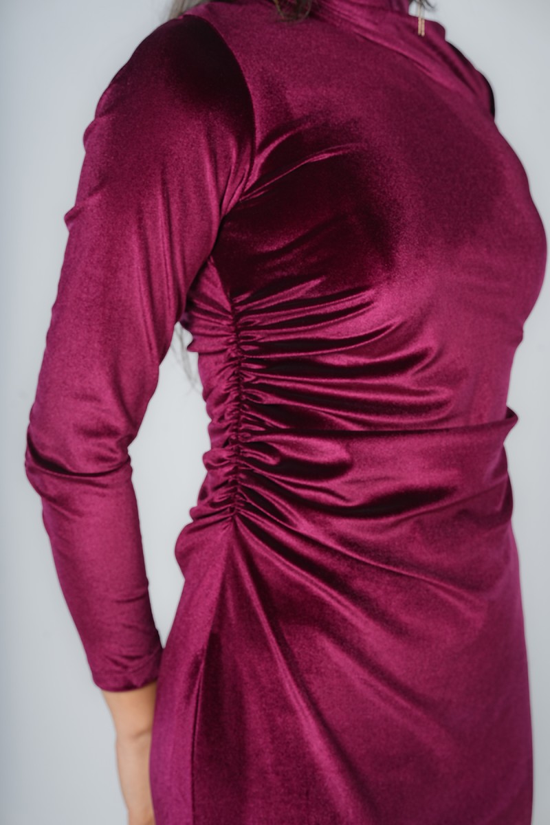 Découvrez cette robe midi en velours d’une élégance rare. Son col montant raffiné et son drapé latéral cintrent parfaitement la taille, tandis que sa fente discrète apporte une touche de modernité. Une pièce sophistiquée pour toutes vos occasions spéciales