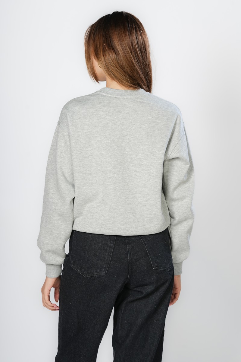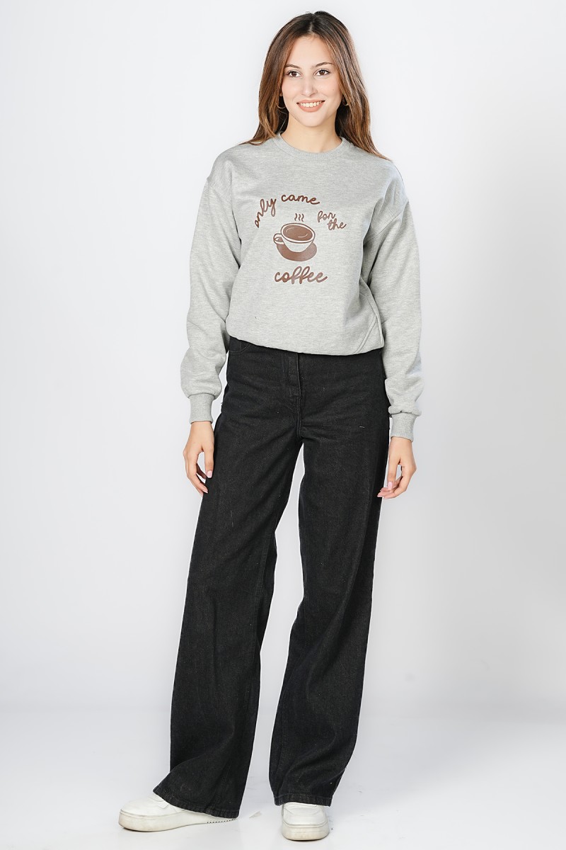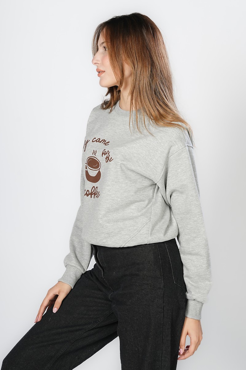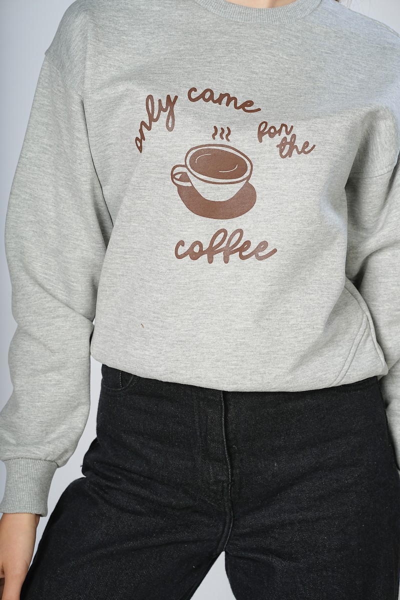 Sweat gris chiné doux et confortable, avec motif café et inscription « Only came for the coffee ». Coupe ample, col rond, parfait pour un look décontracté et tendance.