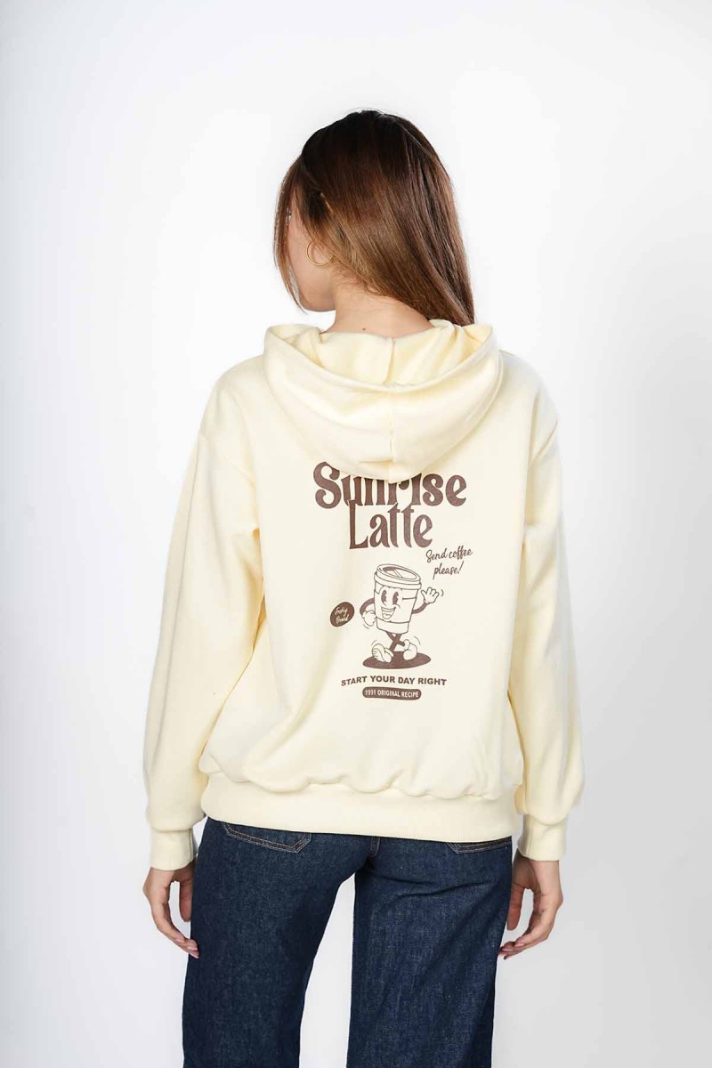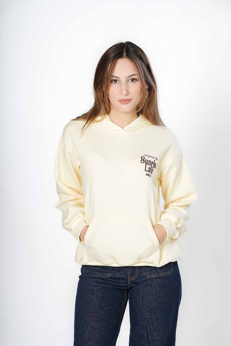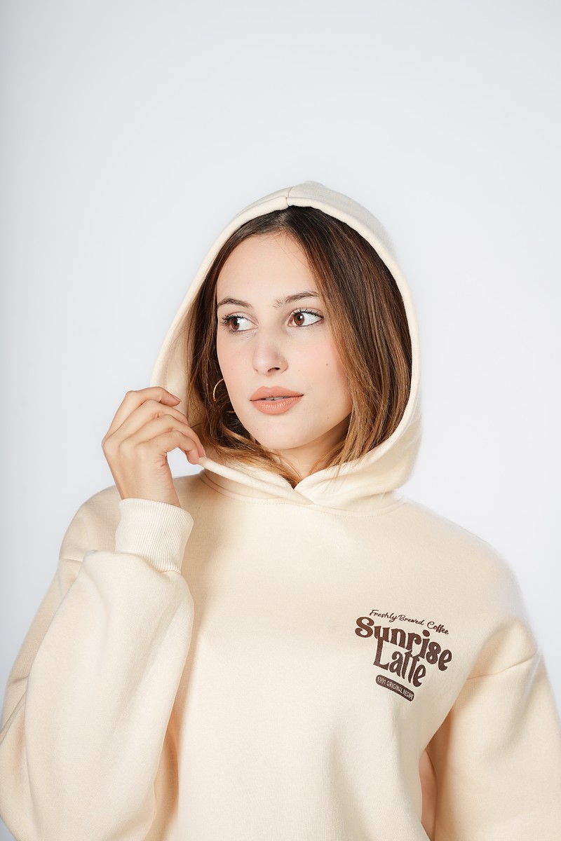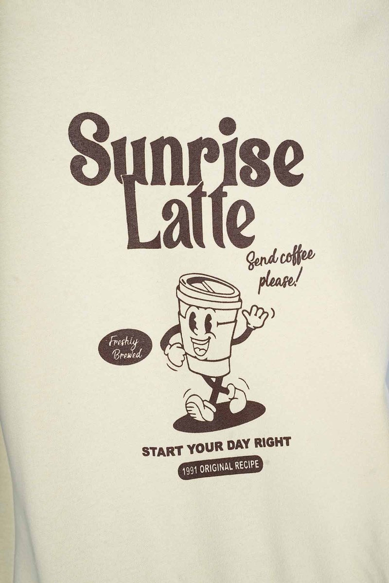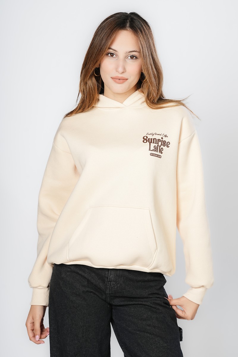 Sweat oversize, doux et très confortable. Motif « Sunrise Latte » sur la poitrine et grand imprimé rétro humoristique au dos, parfait pour les fans de café. Un sweat à capuche pratique avec poche kangourou, idéal pour un look décontracté au quotidien.