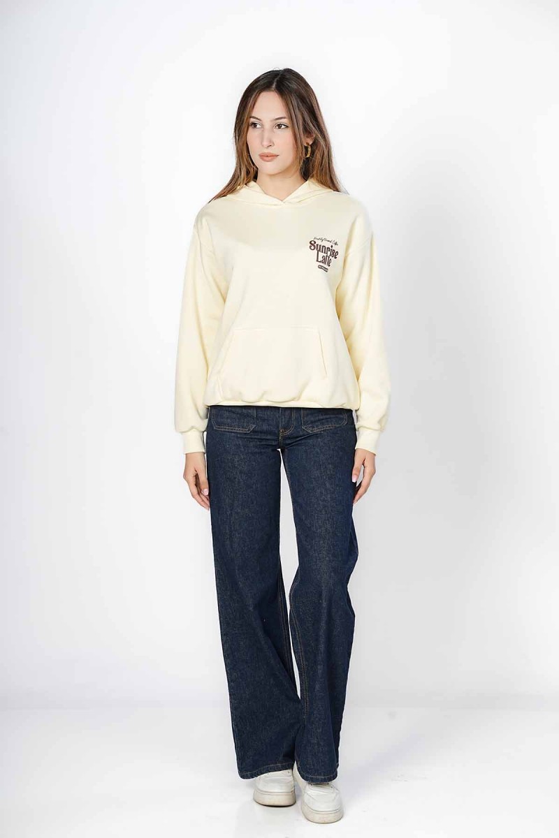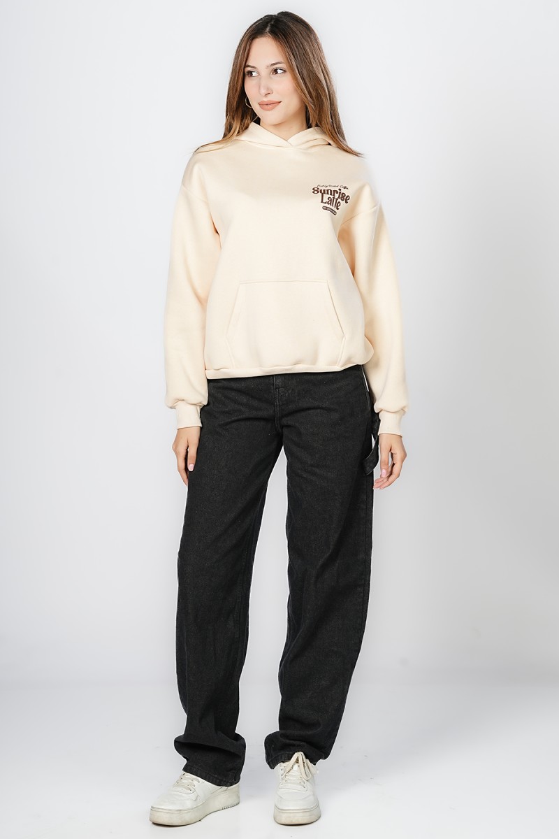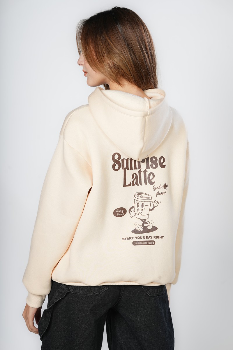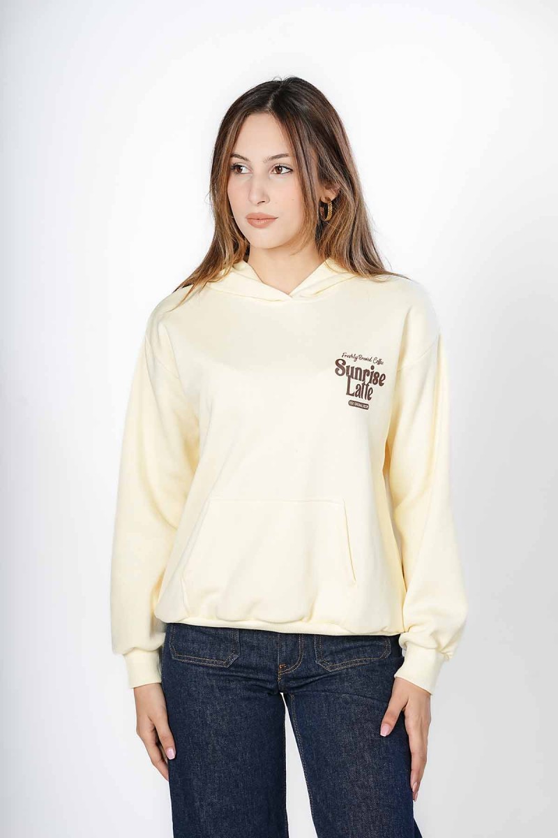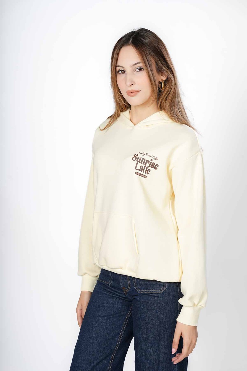 Sweat oversize, doux et très confortable. Motif « Sunrise Latte » sur la poitrine et grand imprimé rétro humoristique au dos, parfait pour les fans de café. Un sweat à capuche pratique avec poche kangourou, idéal pour un look décontracté au quotidien.