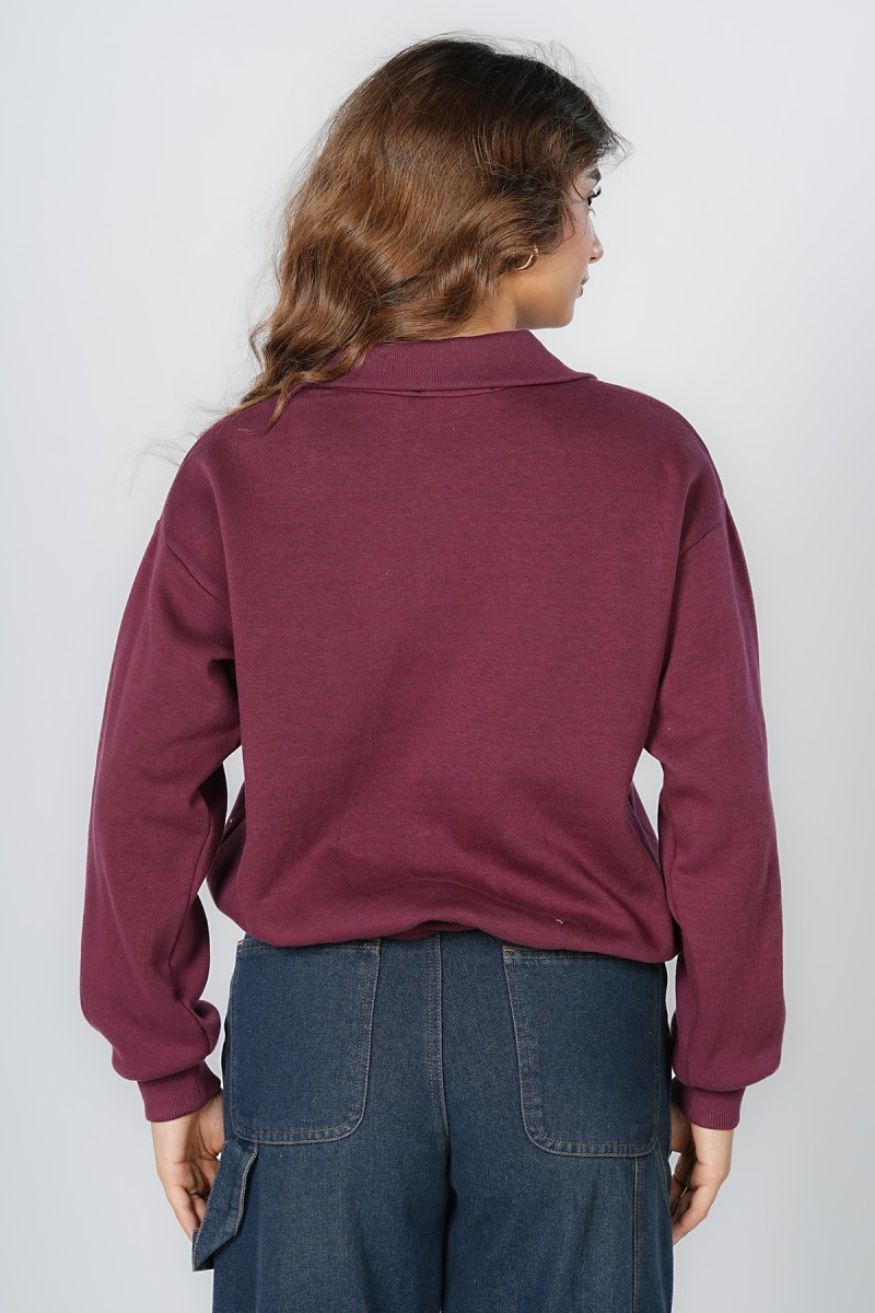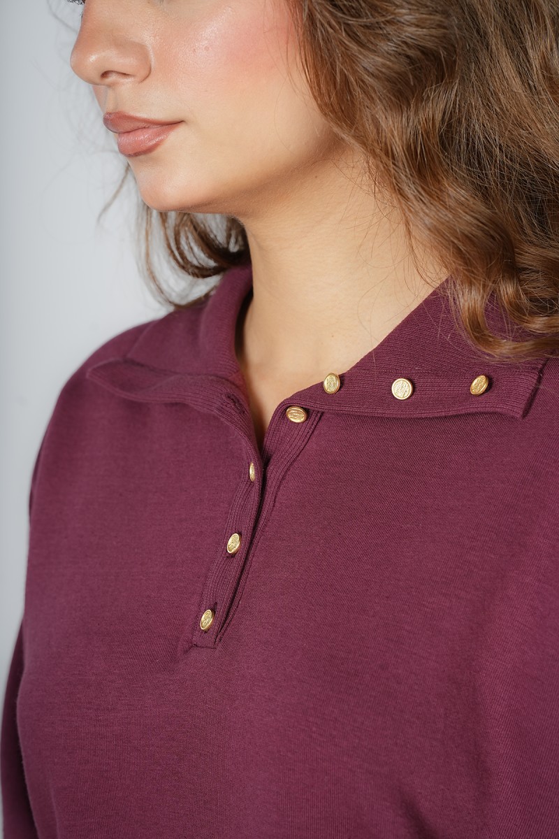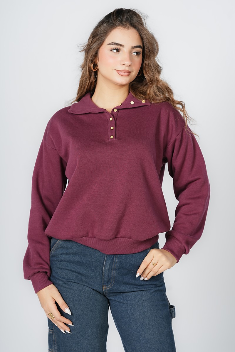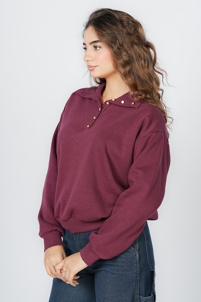 Sweat-shirt oversize en matière douce, dans une teinte burgundy tendance. Son col chemise et sa patte de boutonnage dorée ajoutent une touche raffinée à ce modèle plus sophistiqué qu’un simple sweat. Idéal pour être à l’aise et stylée au quotidien.