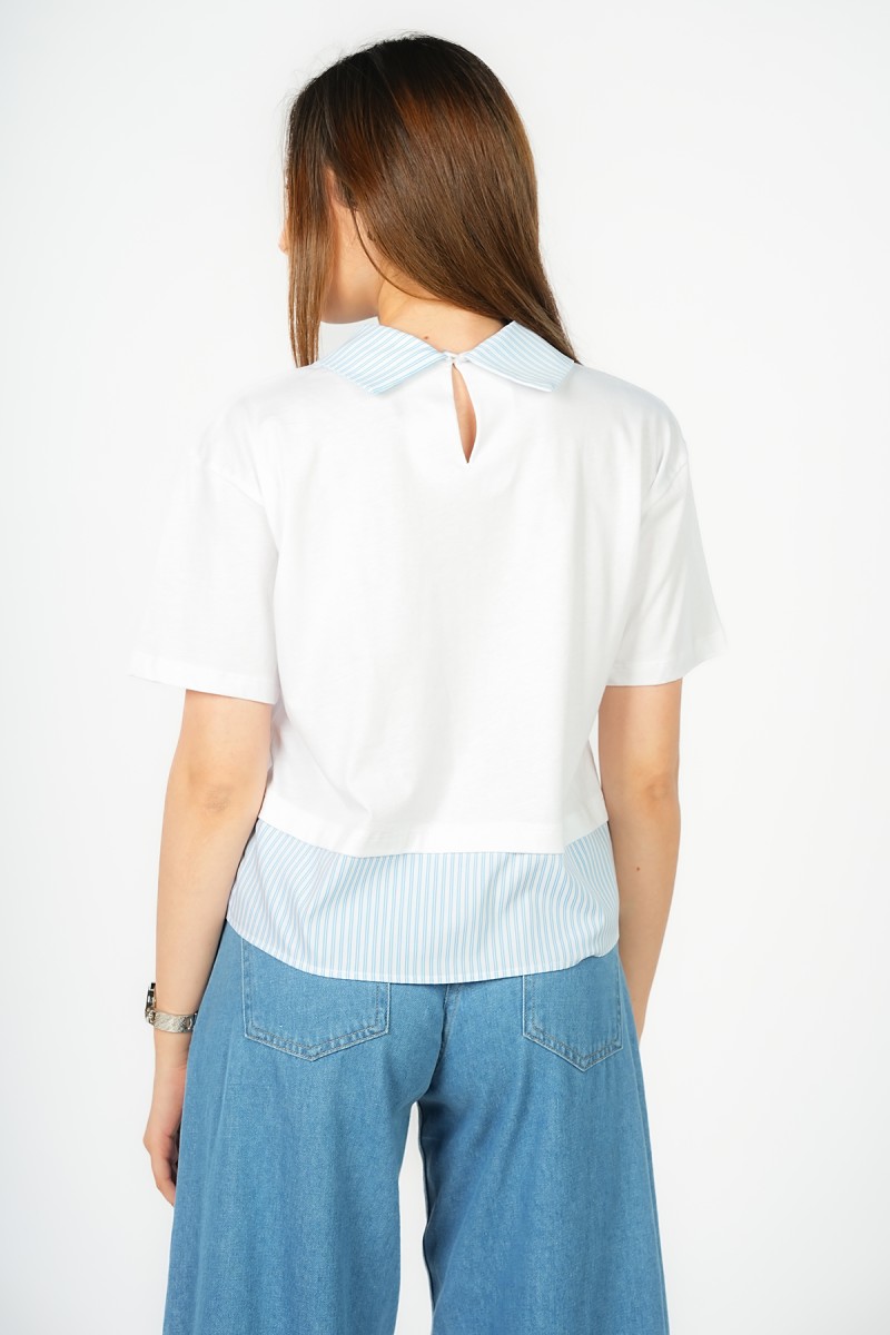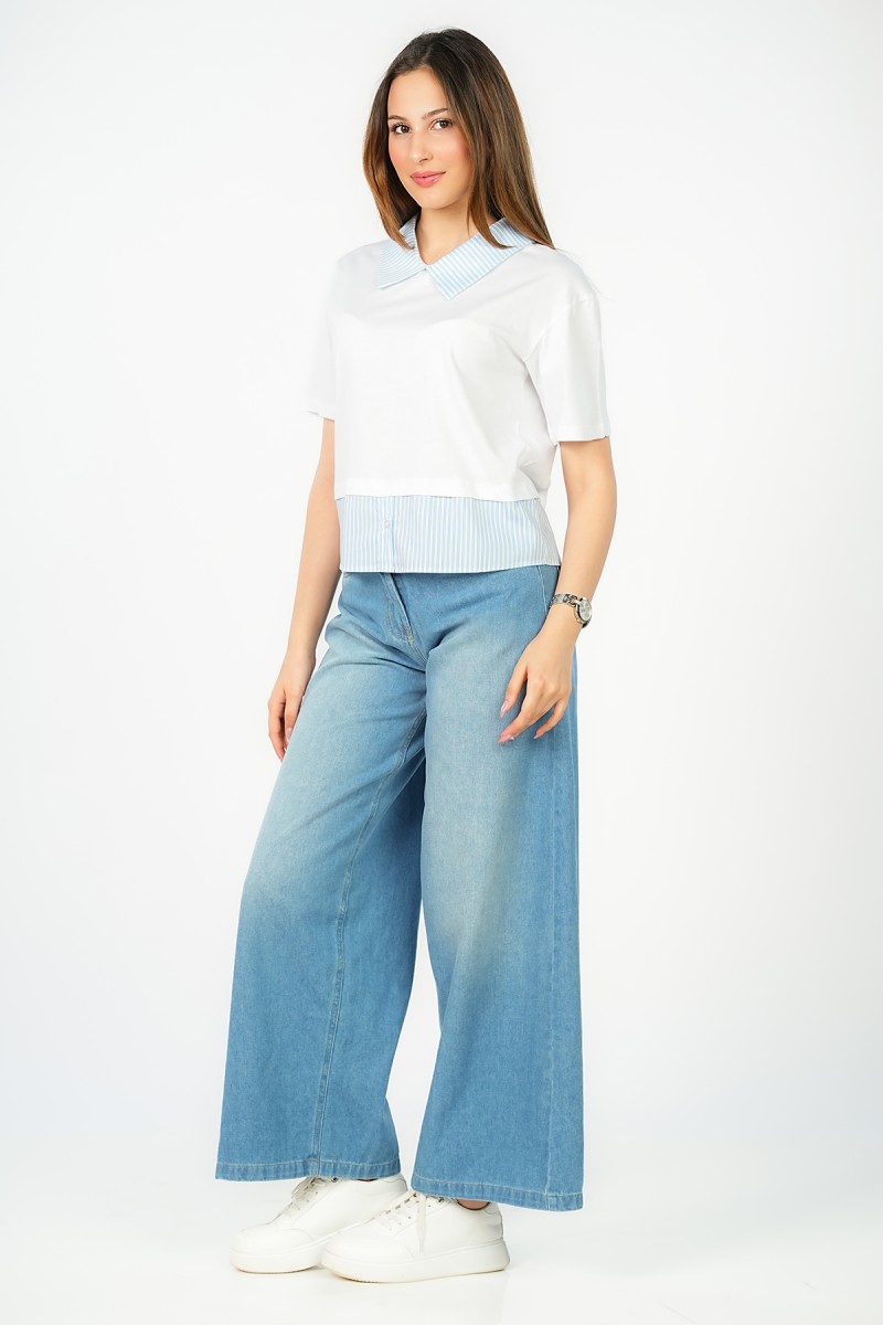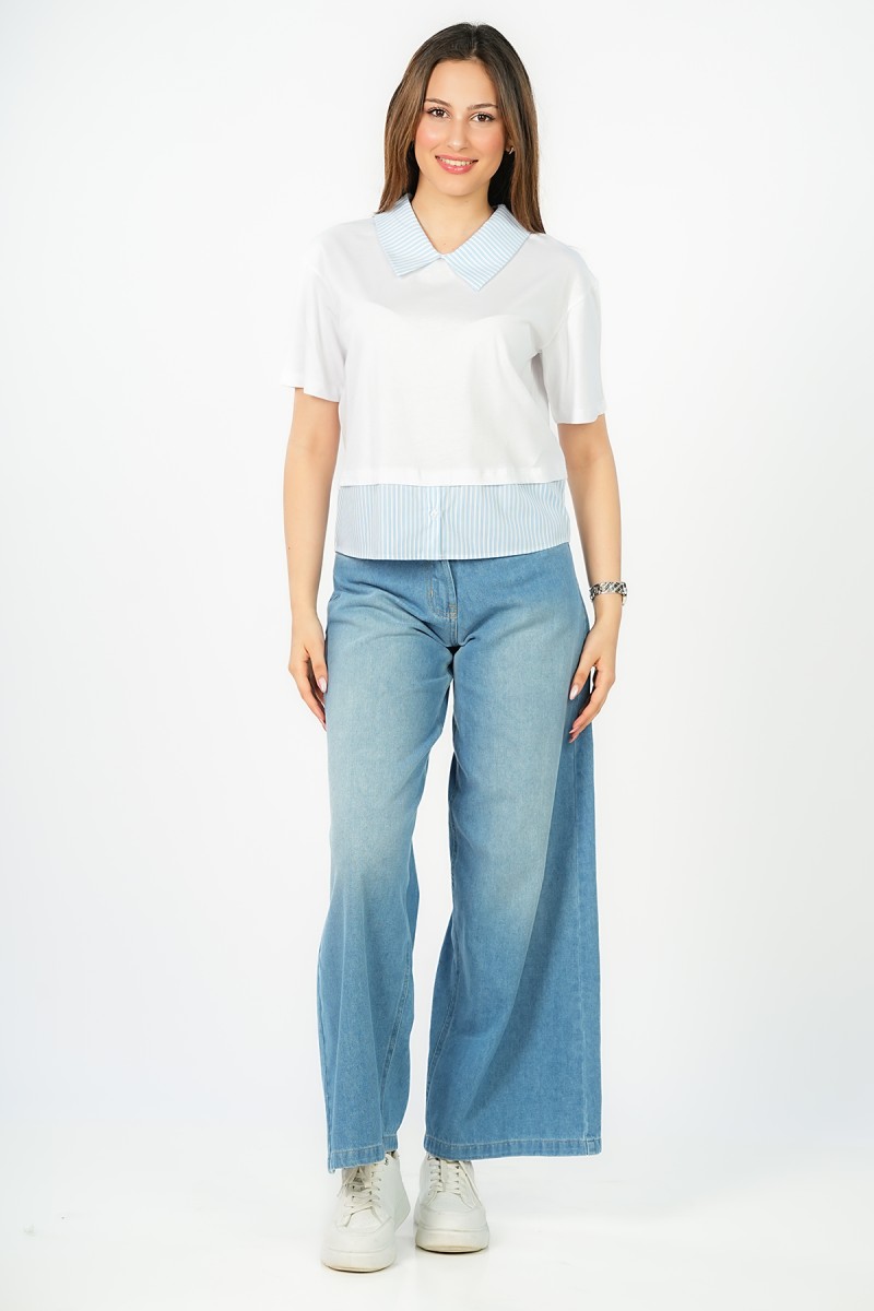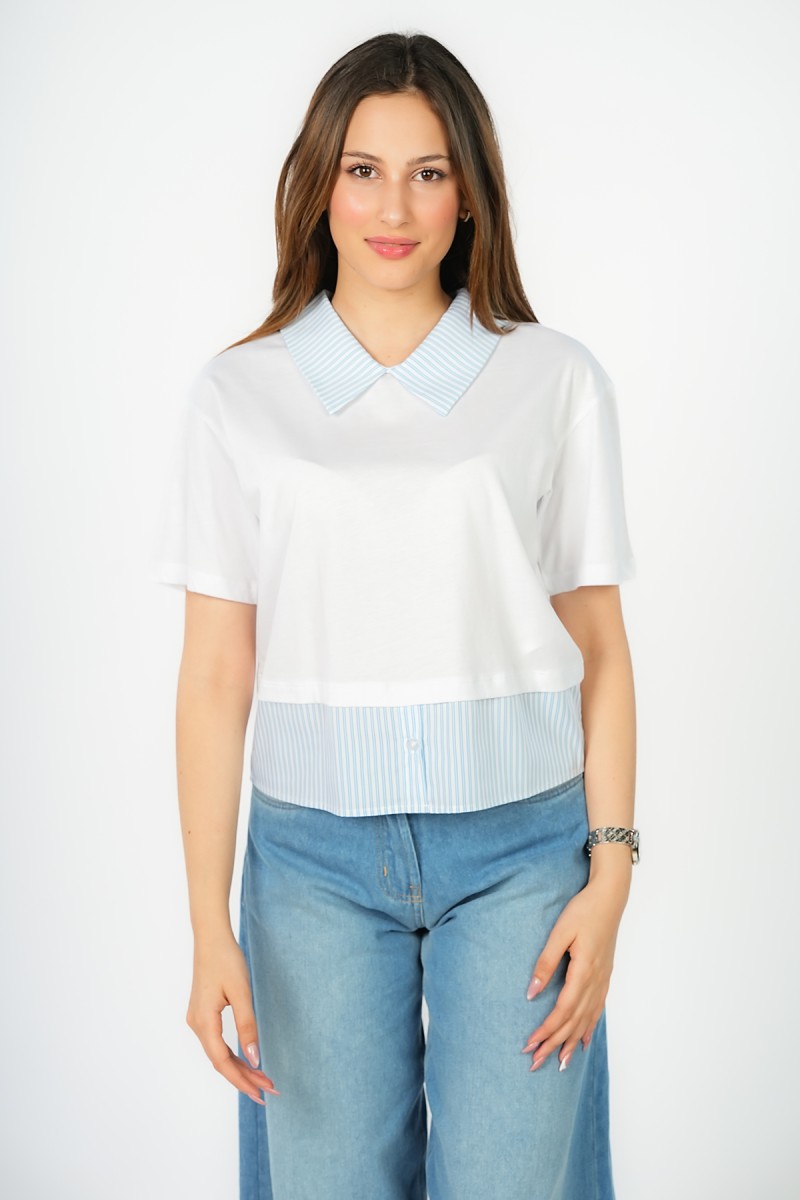 T-shirt à col rond avec revers contrastés, manches courtes, base en tissu combiné, et fermeture au dos par une fente avec bouton.