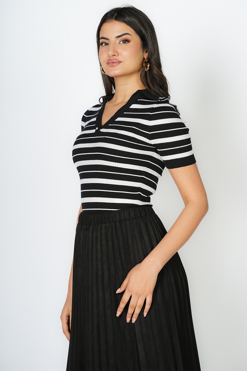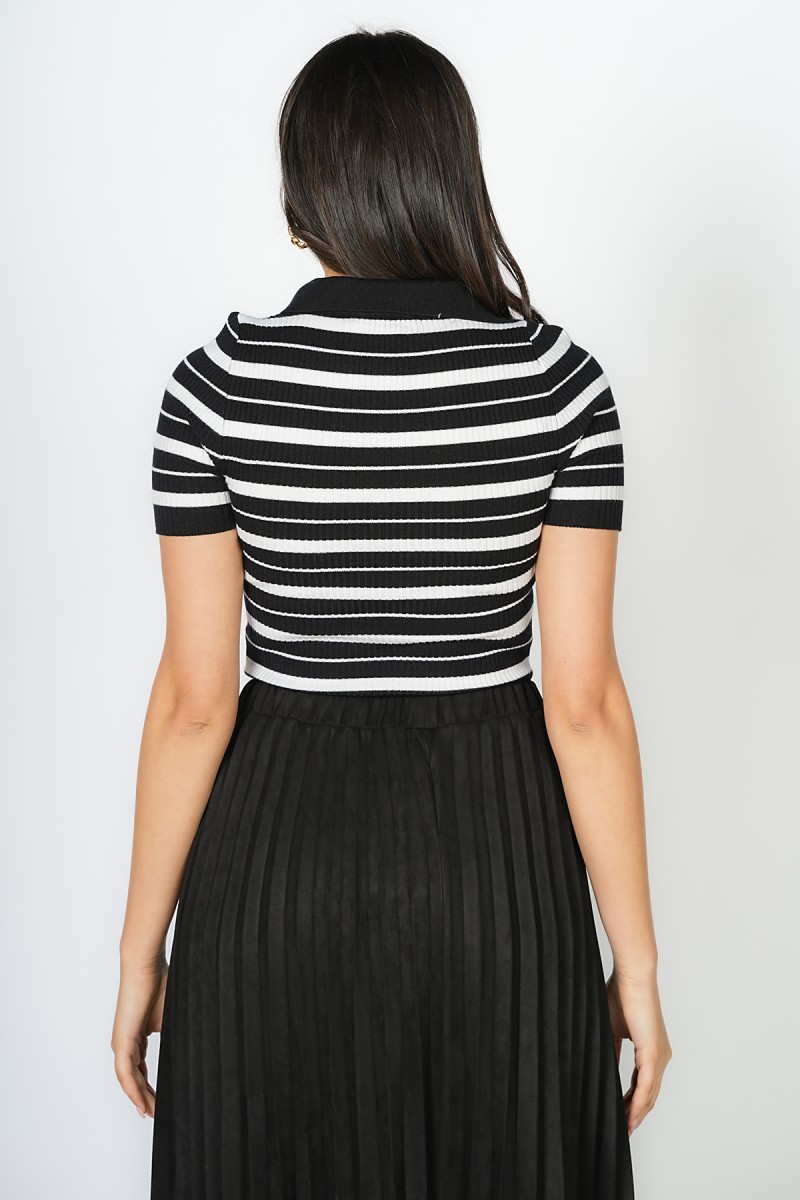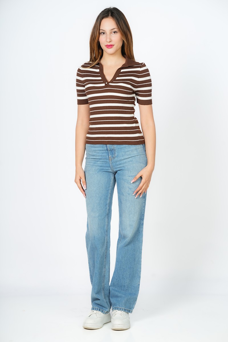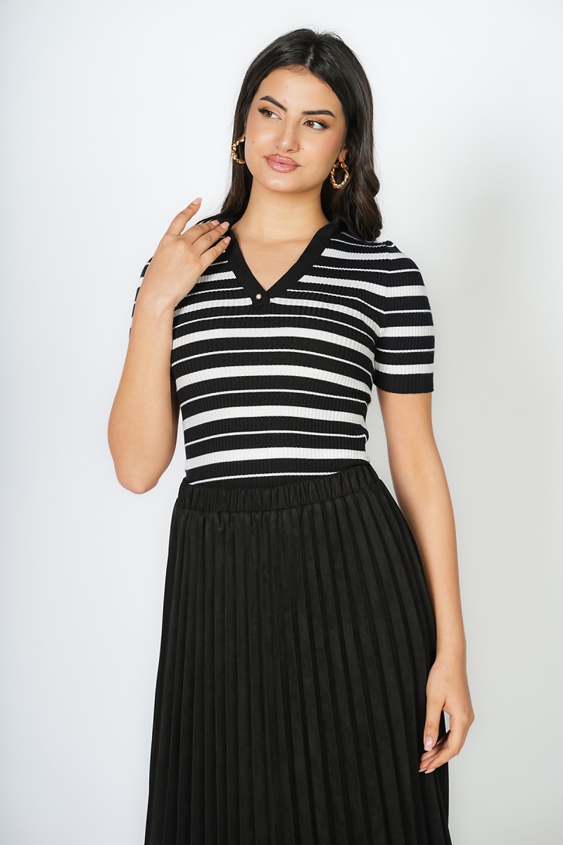 T-shirt en maille viscose à rayures, manches courtes montées, col à revers et encolure en V ornée de petits boutons décoratifs dorés.