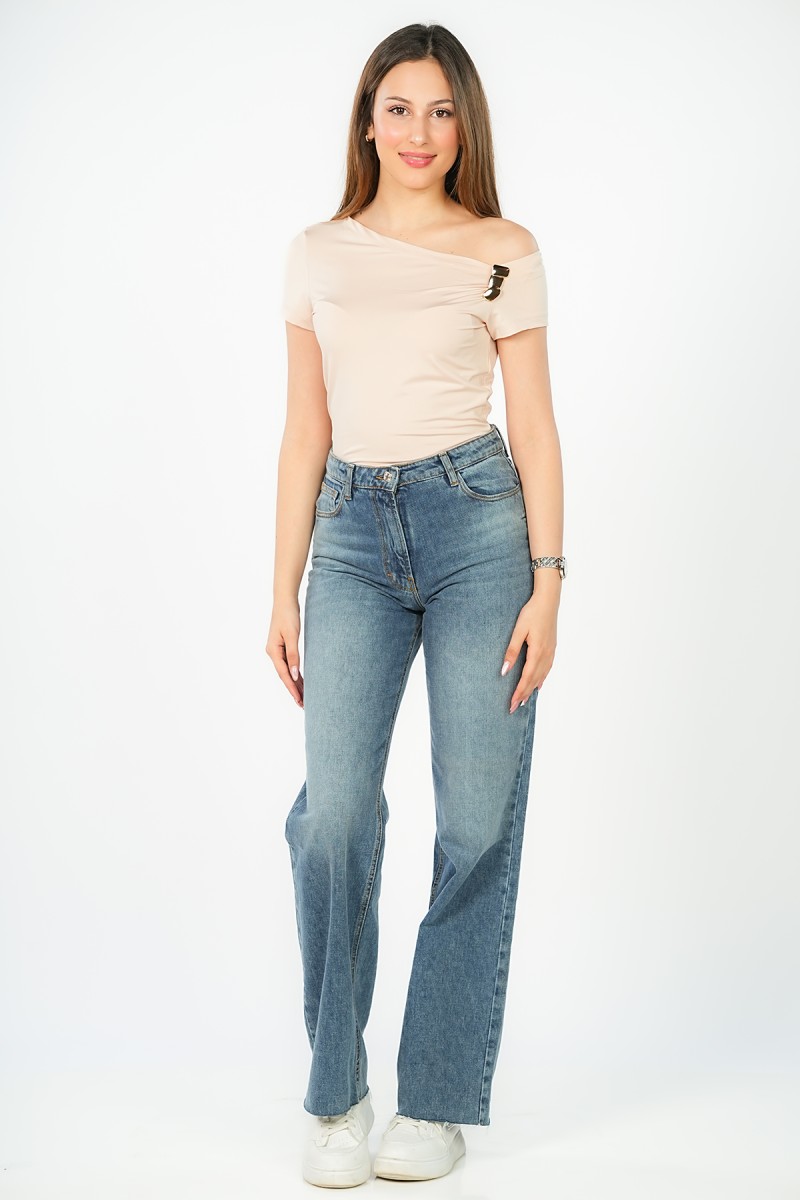 Top Asymétrique à Boucle Dorée est un modèle slim fit au design audacieux et raffiné qui sublime la silhouette grâce à son épaule dénudée et son détail métallique élégant.