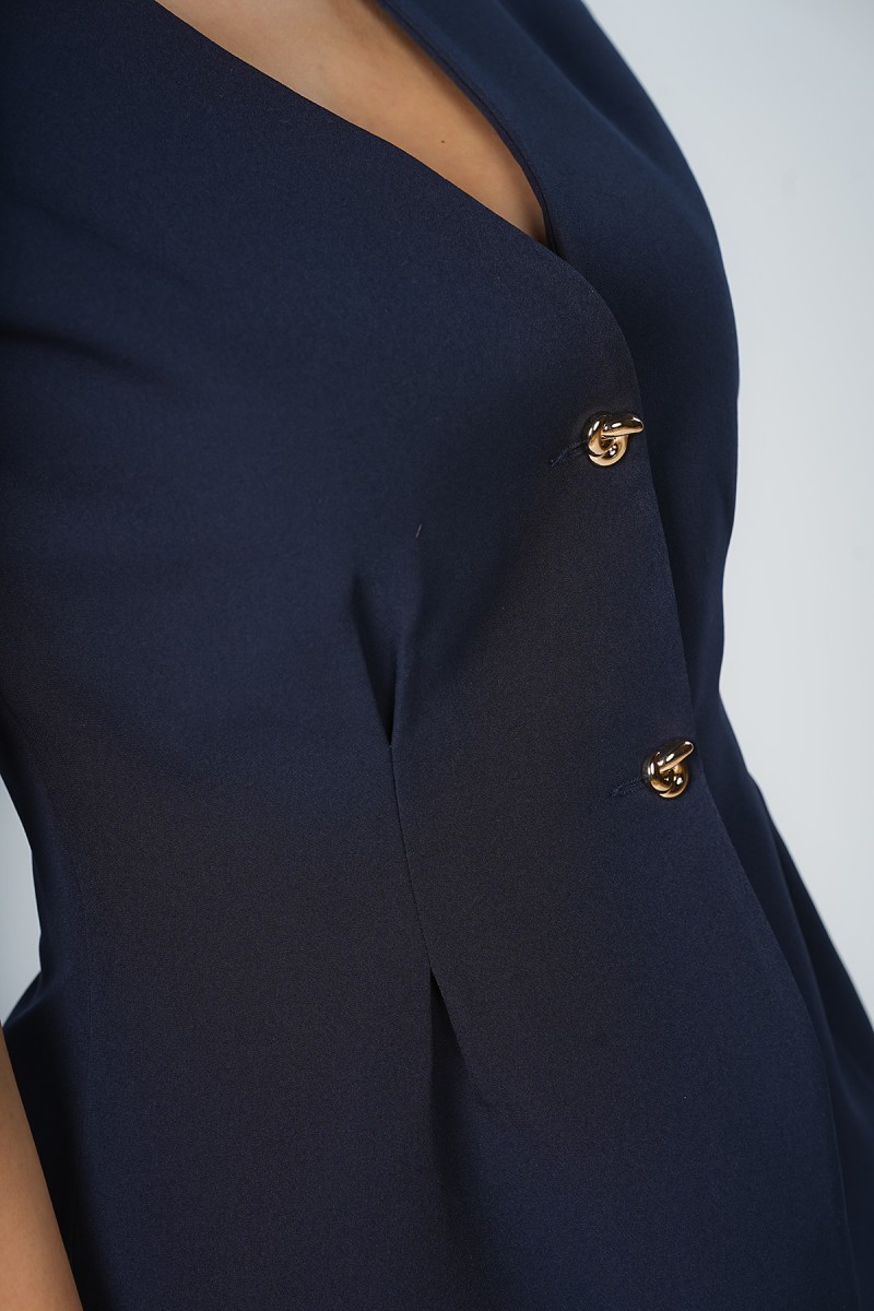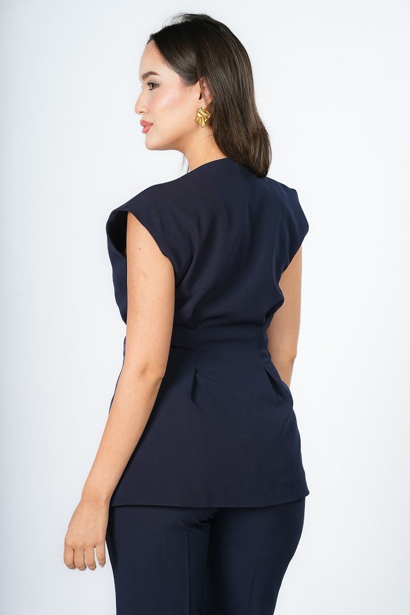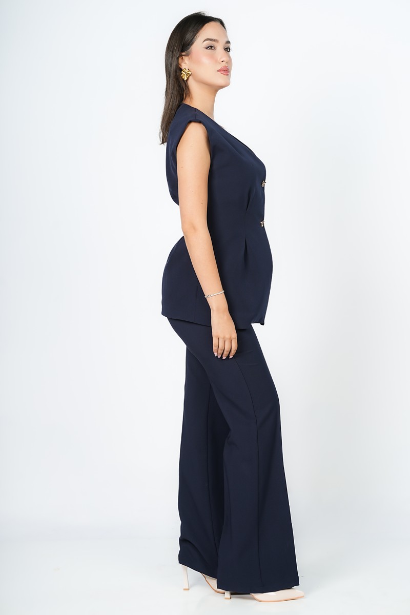 Blazer sans manches à coupe évasée et taille cintrée avec une structure qui sculpte une silhouette en sablier pour une allure Executive Chic, un essentiel Quiet Luxury se distinguant par sa fluidité moderne et son style Minimaliste.