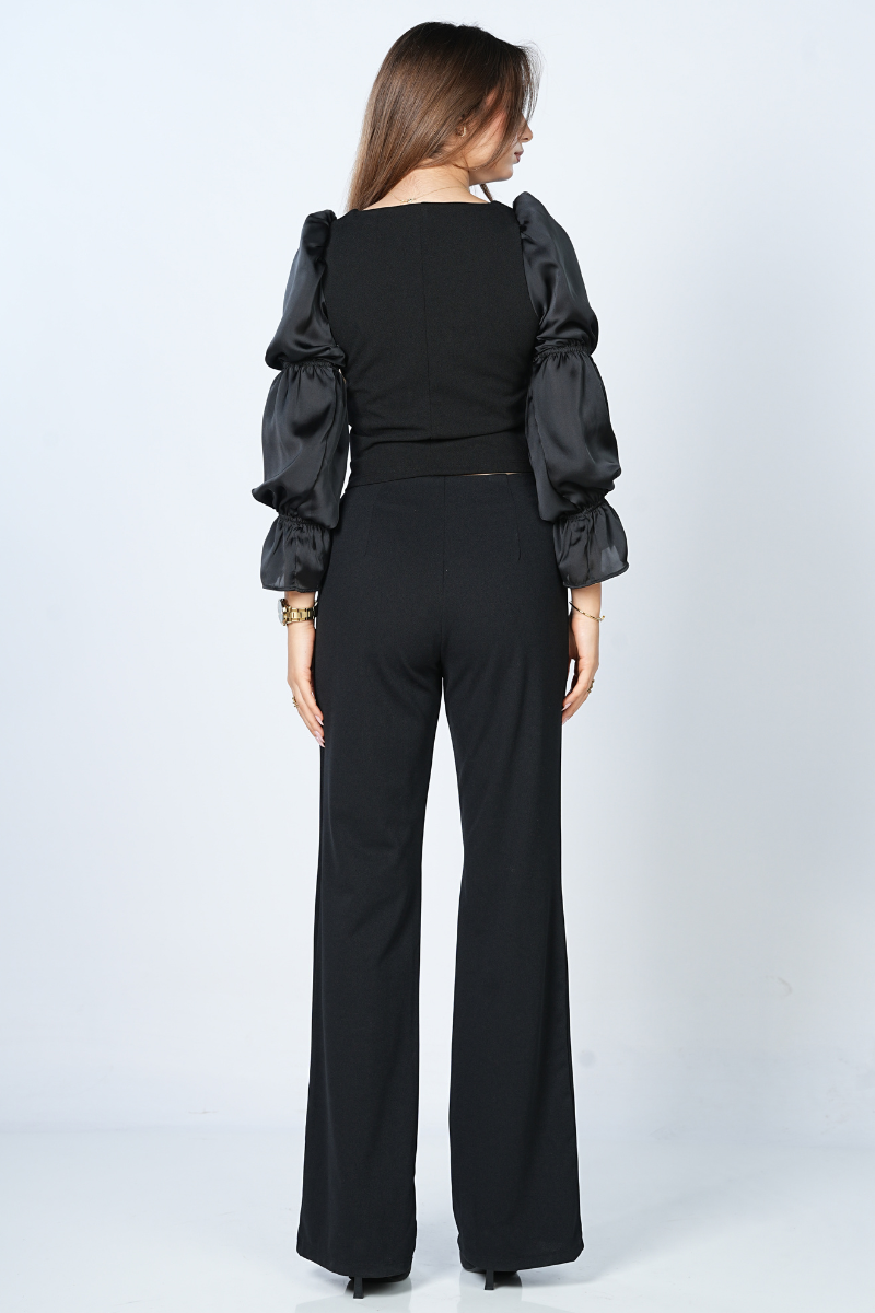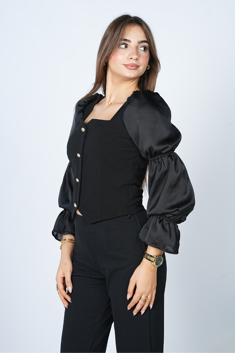 Blouse chic fluide noire, moderne et élégante. Parfaite pour soirées, bureau et automne-hiver 2025-2026. Polyvalente et casual élégante, idéale avec jean ou jupe. Qualité premium, style intemporel et look raffiné tendance