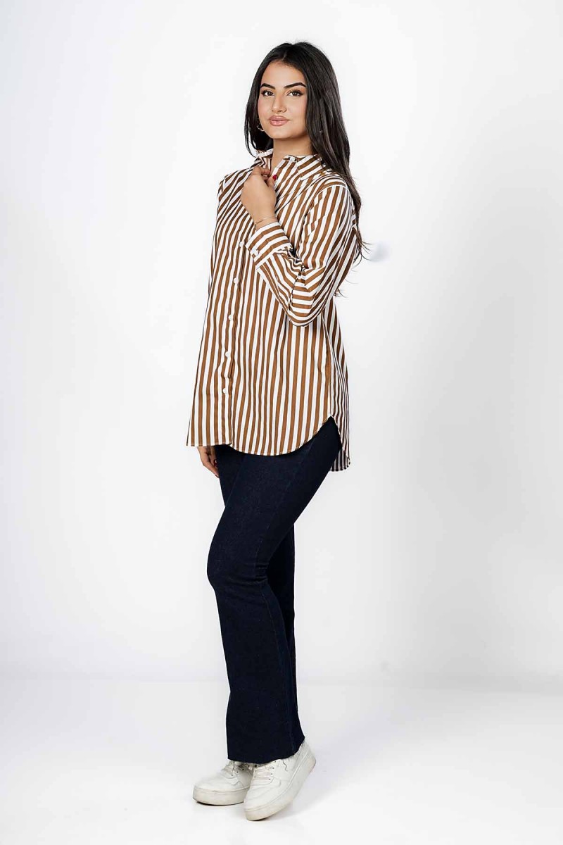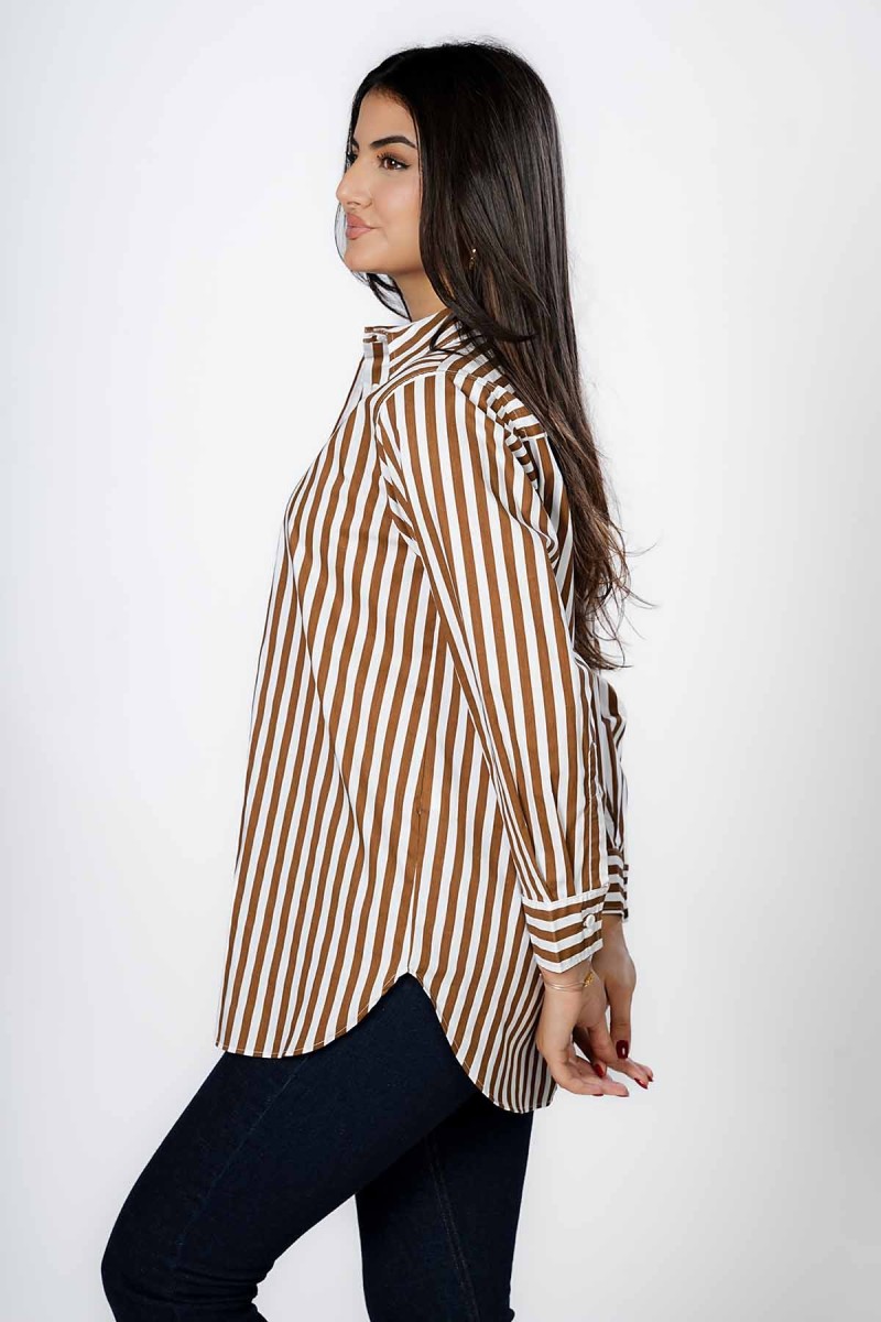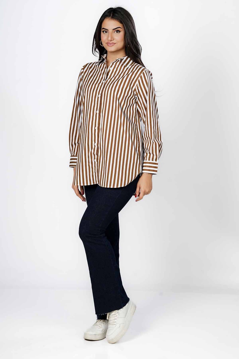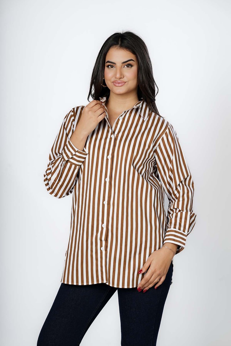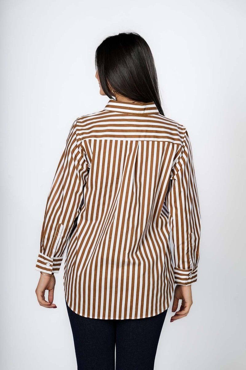 Ceci est une chemise à rayures manches longues avec un col chemisier classique et une patte de boutonnage verticale simple. Le tissu est fluide et lisse, et la coupe est droite et décontractée