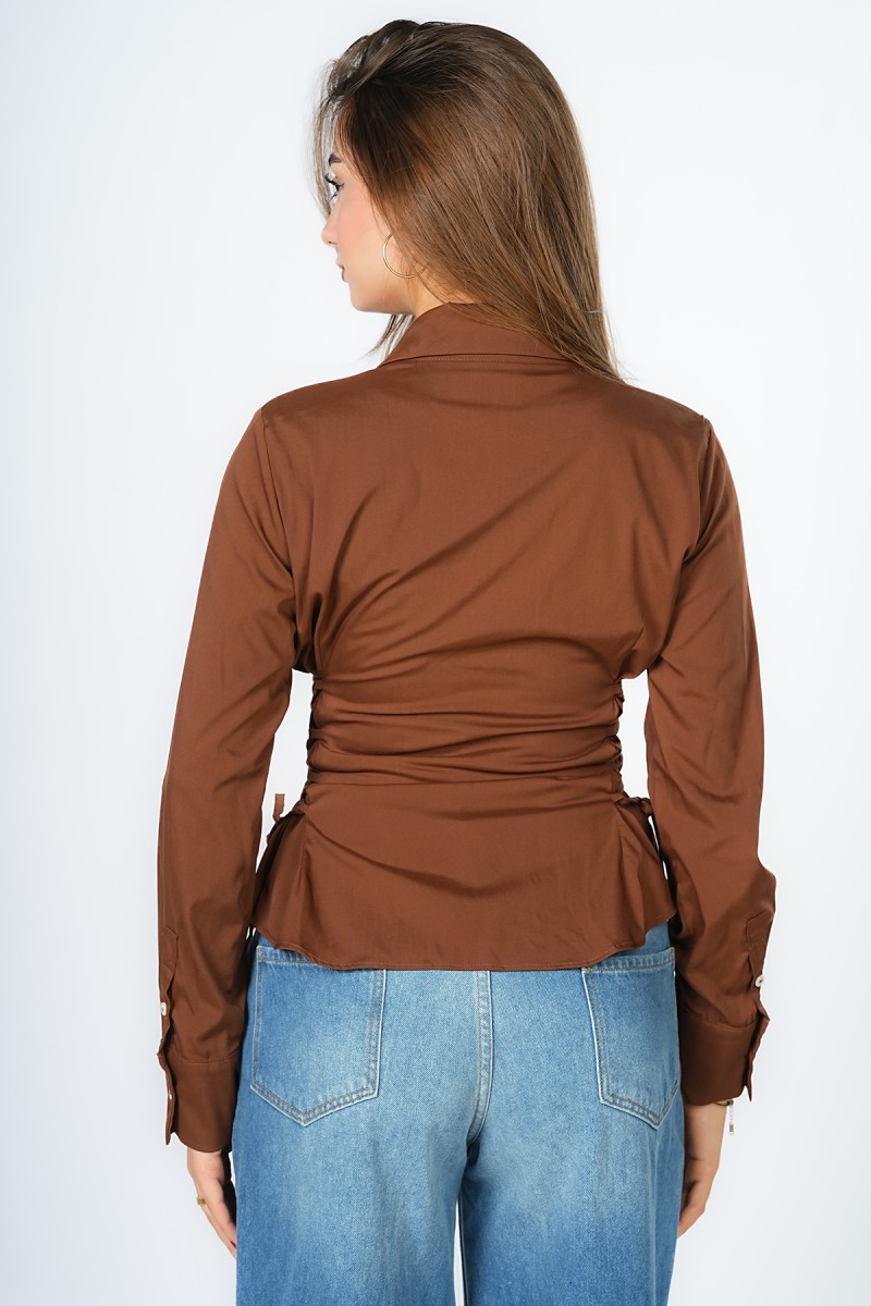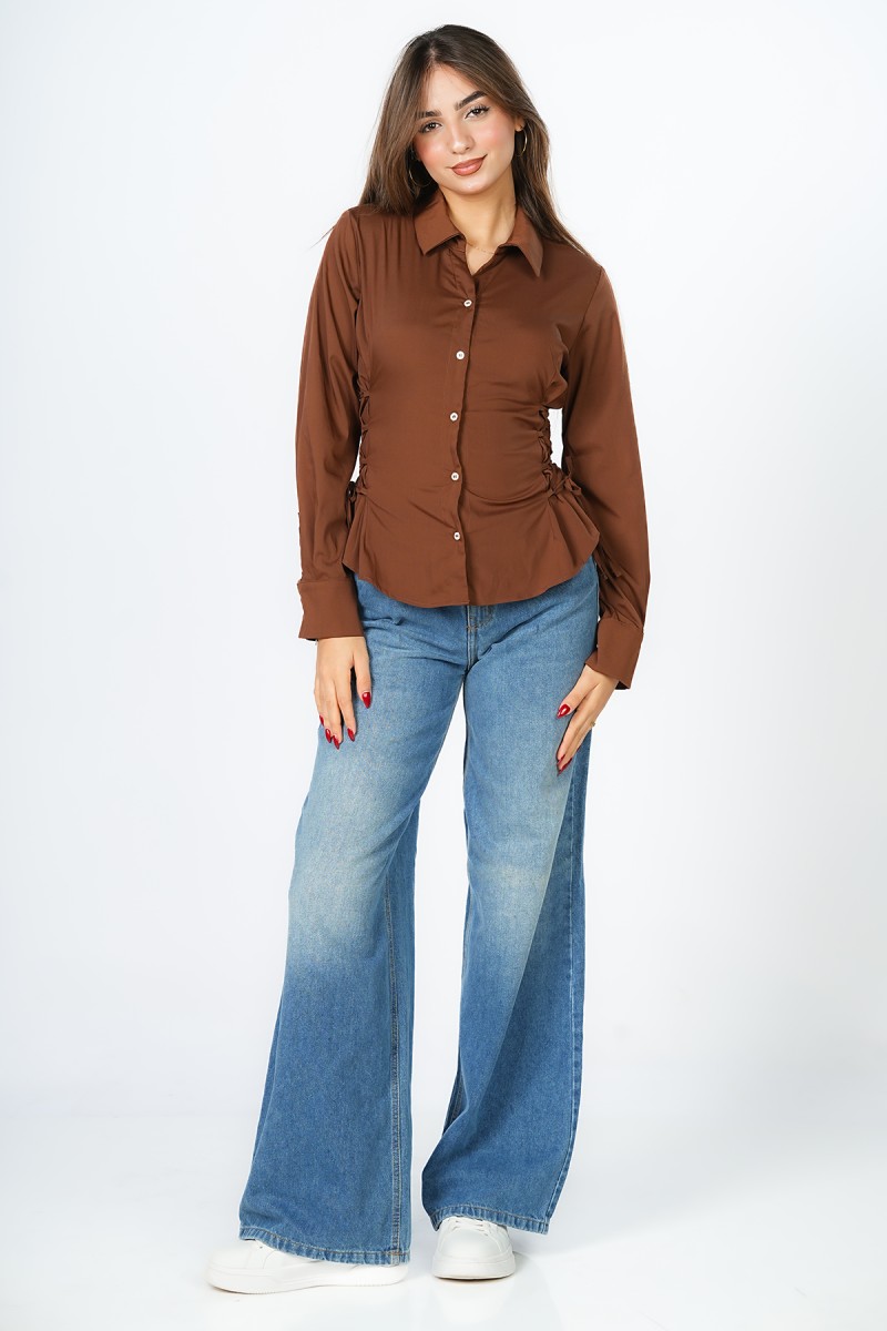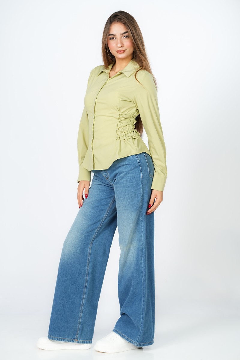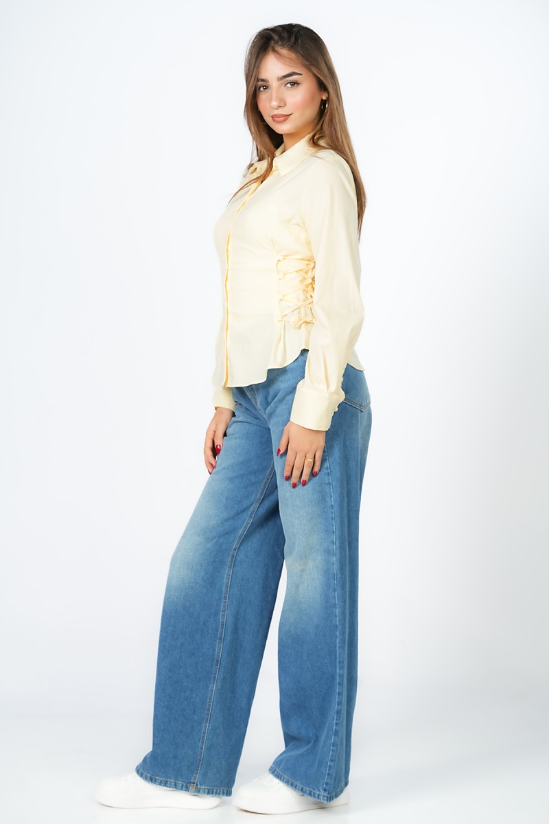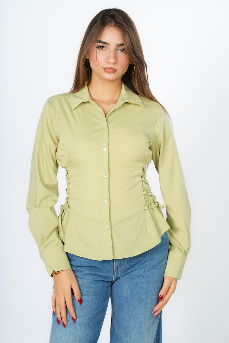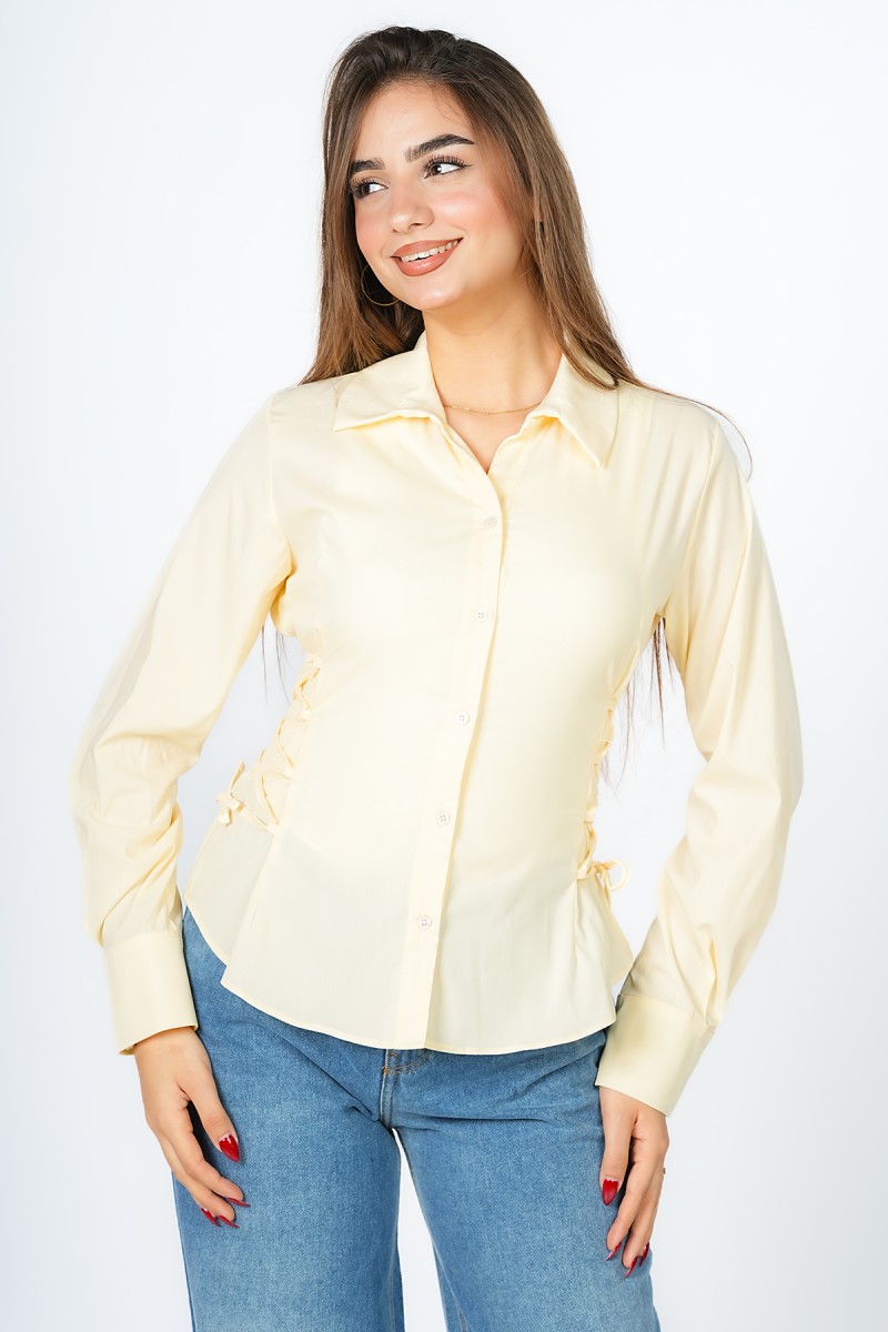 Chemise courte à la coupe magistrale, soulignée par un laçage délicat sur les côtés pour sculpter une silhouette architecturale et raffinée.Une pièce maîtresse minimaliste qui réinvente les codes du classique avec un détail couture d'une élégance absolue.