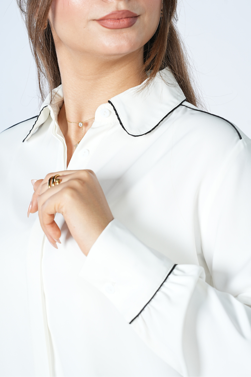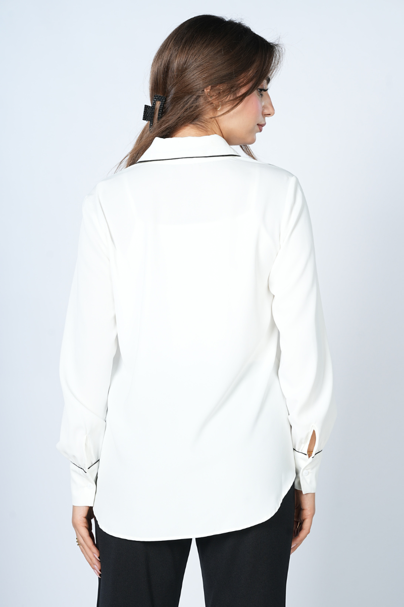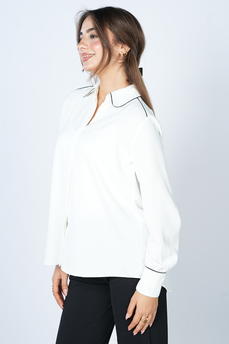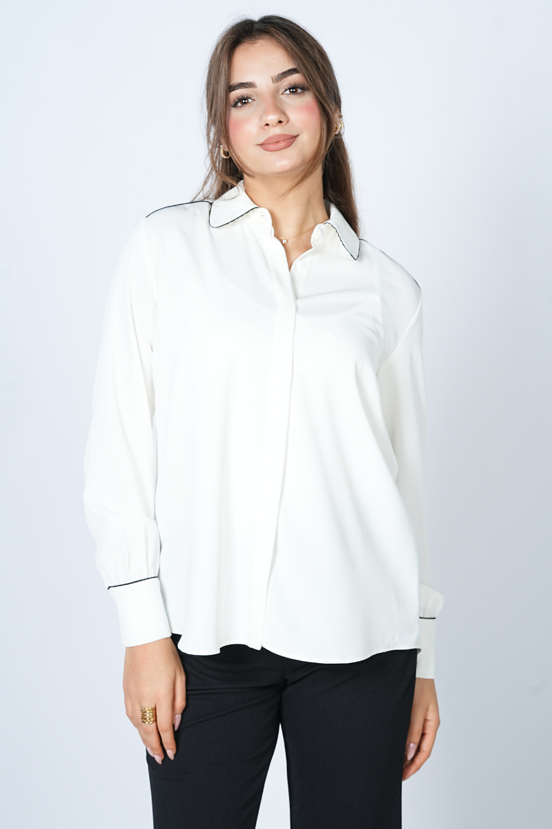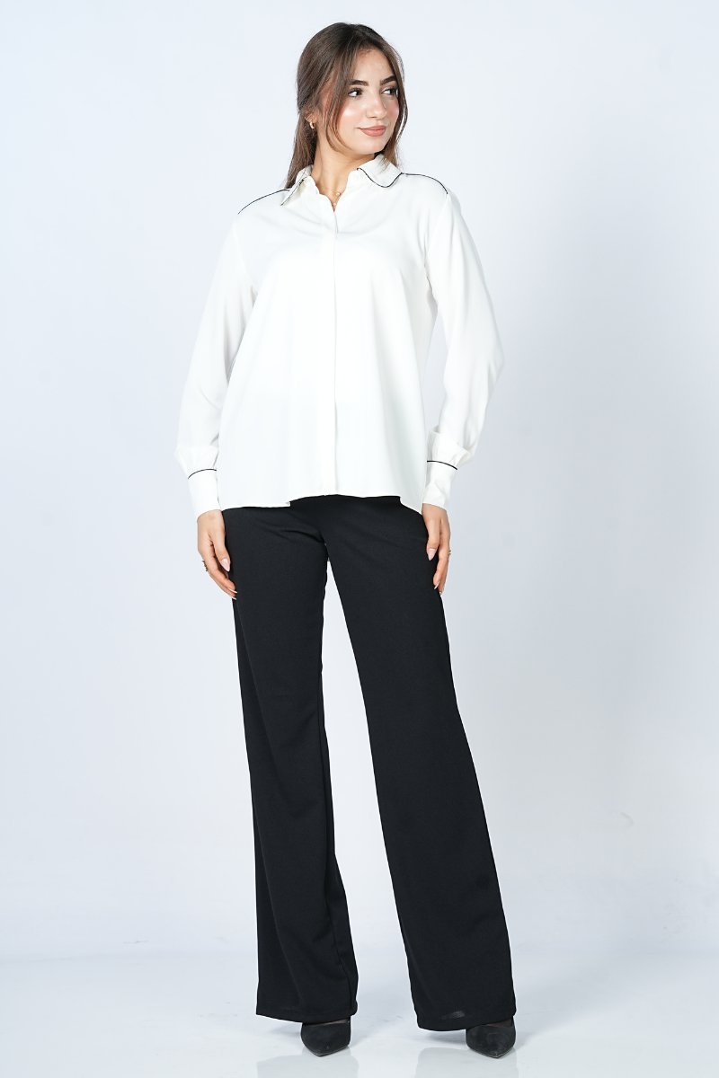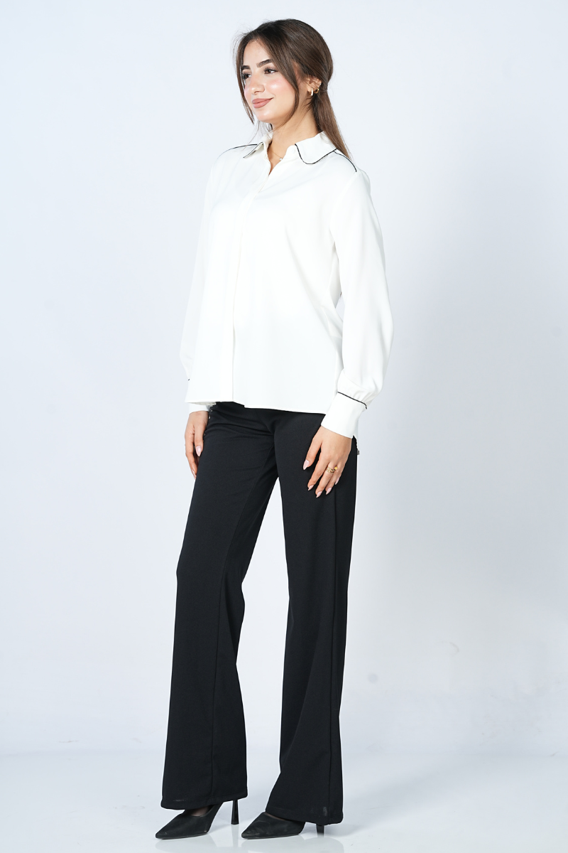 Apportez une touche de sophistication moderne à votre vestiaire avec ce chemisier fluide aux finitions remarquables. Conçu pour la femme élégante, ce haut combine une coupe classique avec des détails de design contemporains.