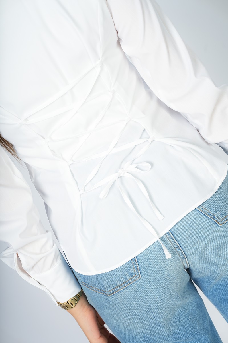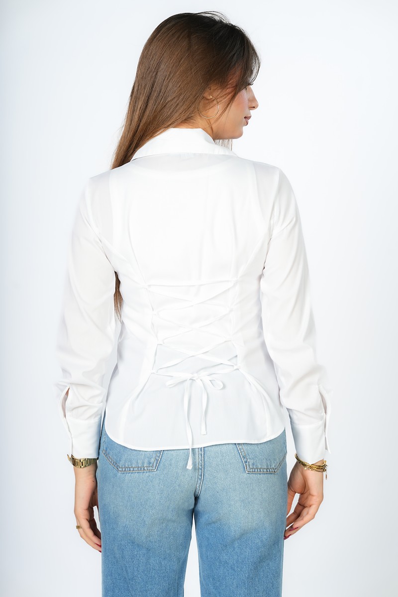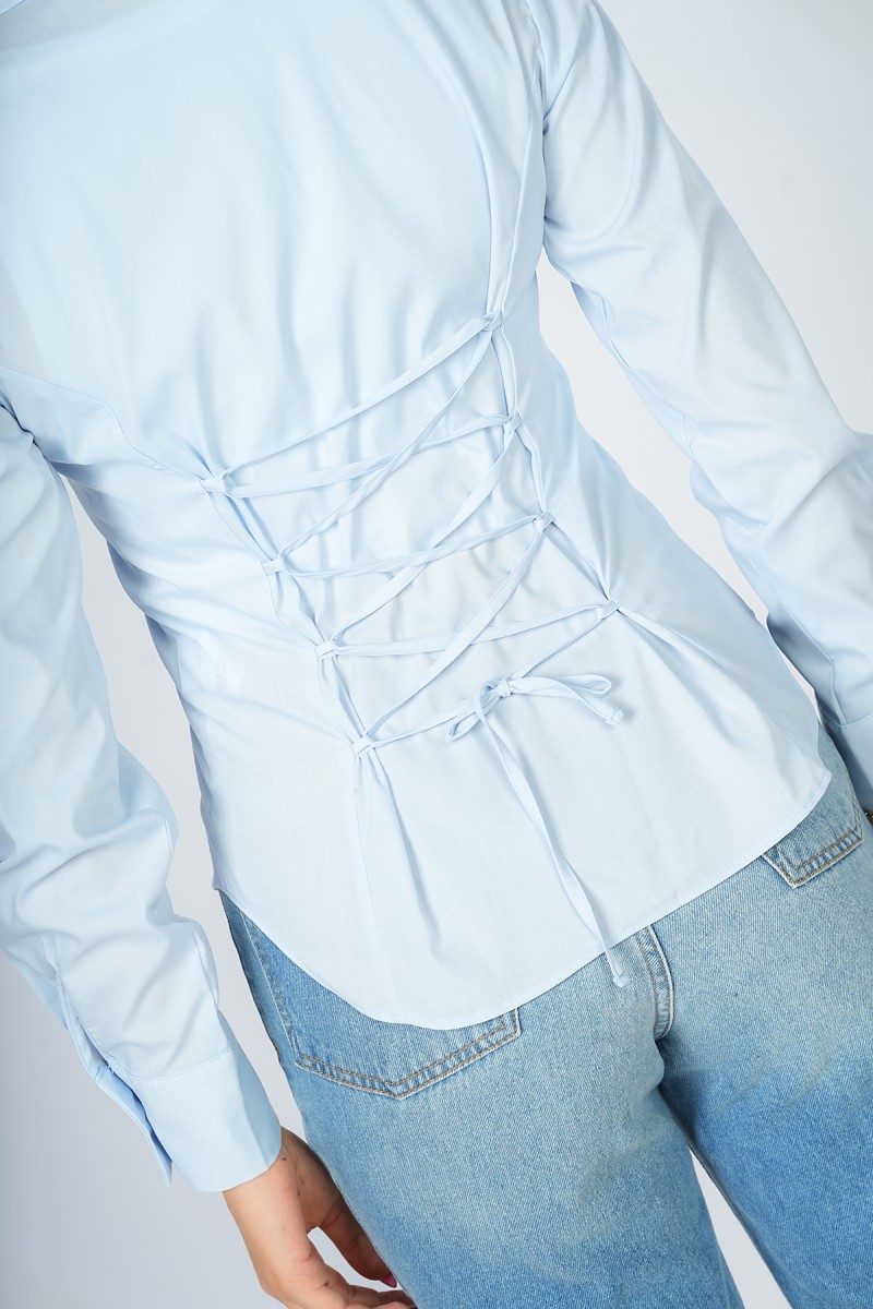 Chemise unie à la coupe impeccable, révélant un laçage sophistiqué au dos pour une silhouette architecturale et ultra-moderne. L'équilibre parfait entre l'épure du col classique et l'audace d'un détail couture qui fait toute la différence.