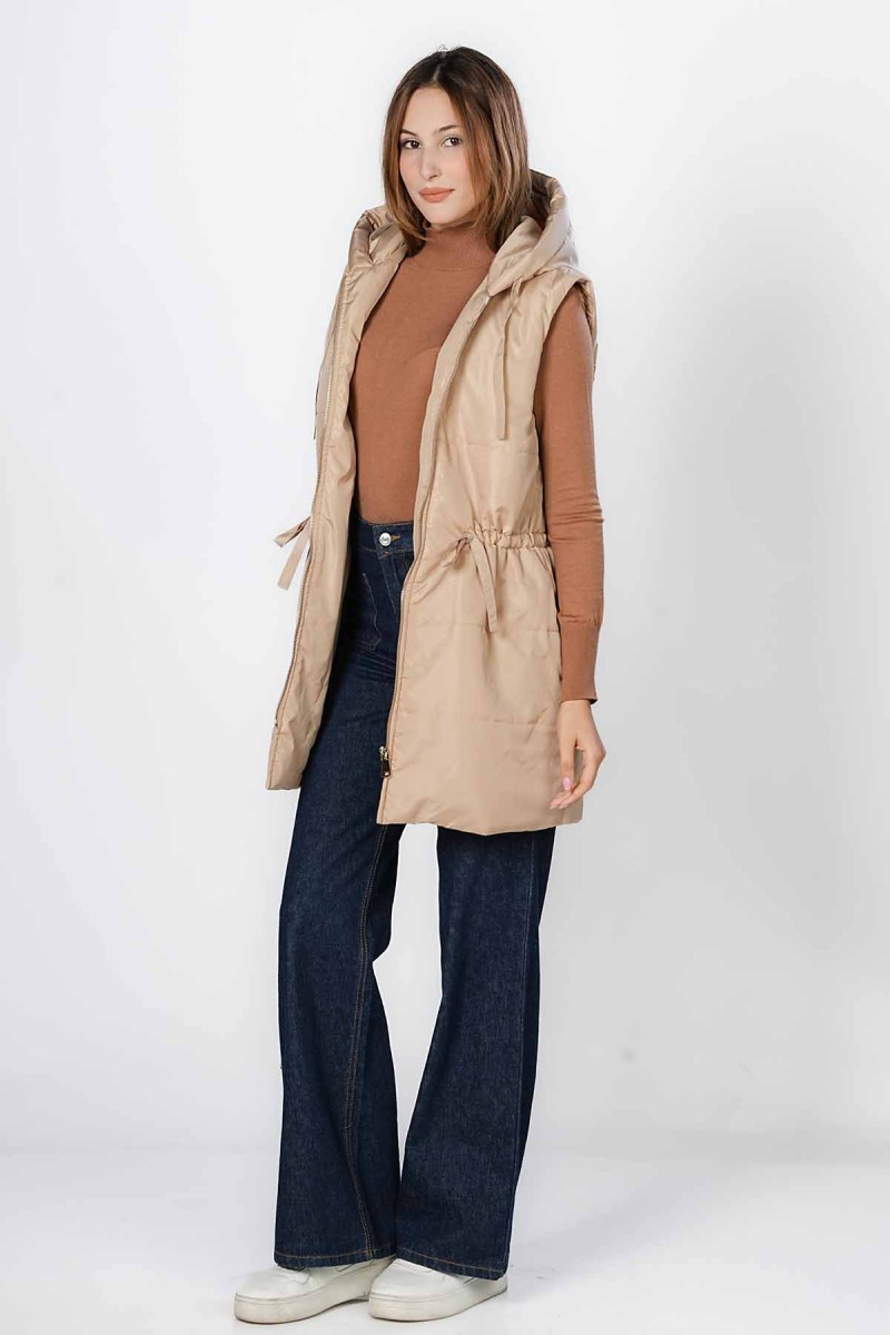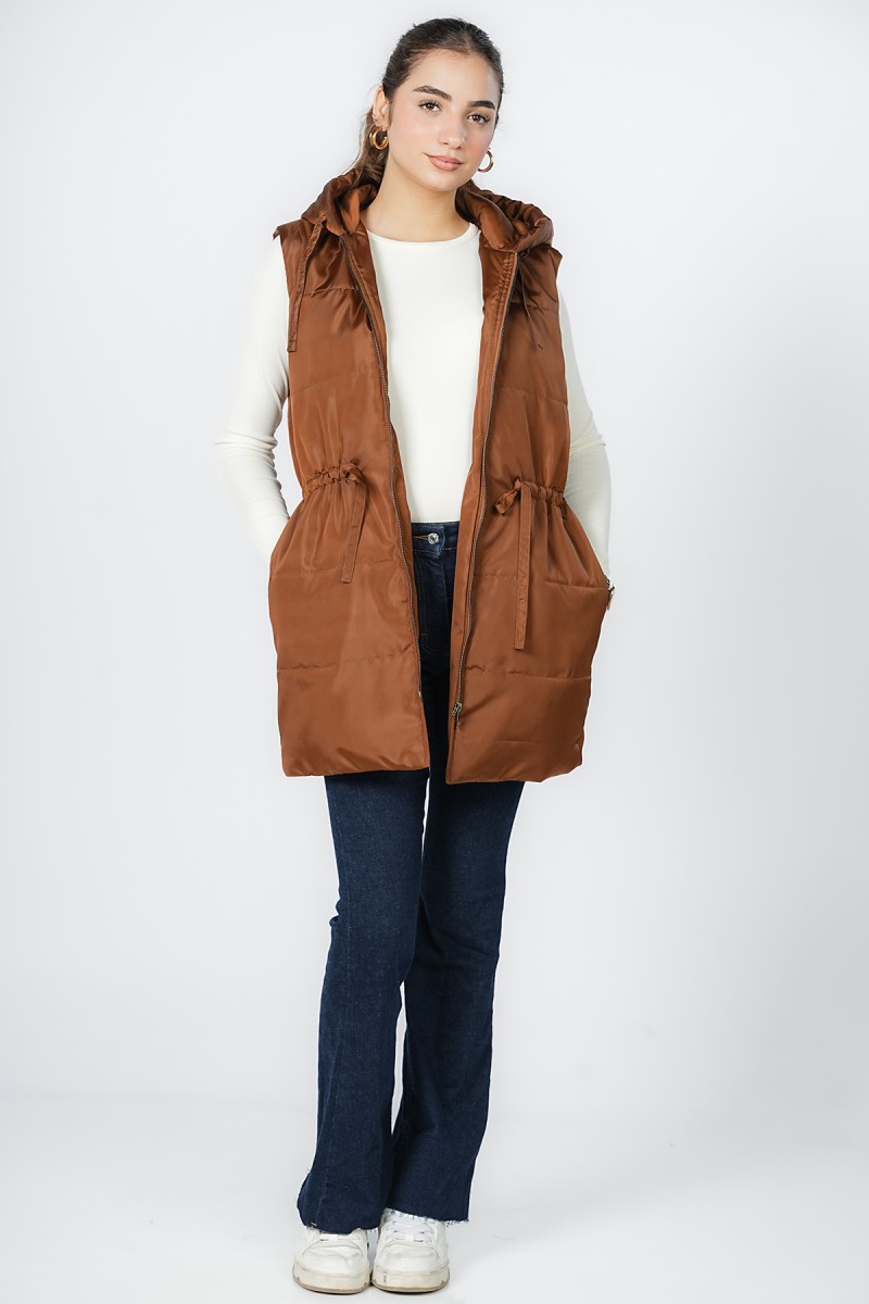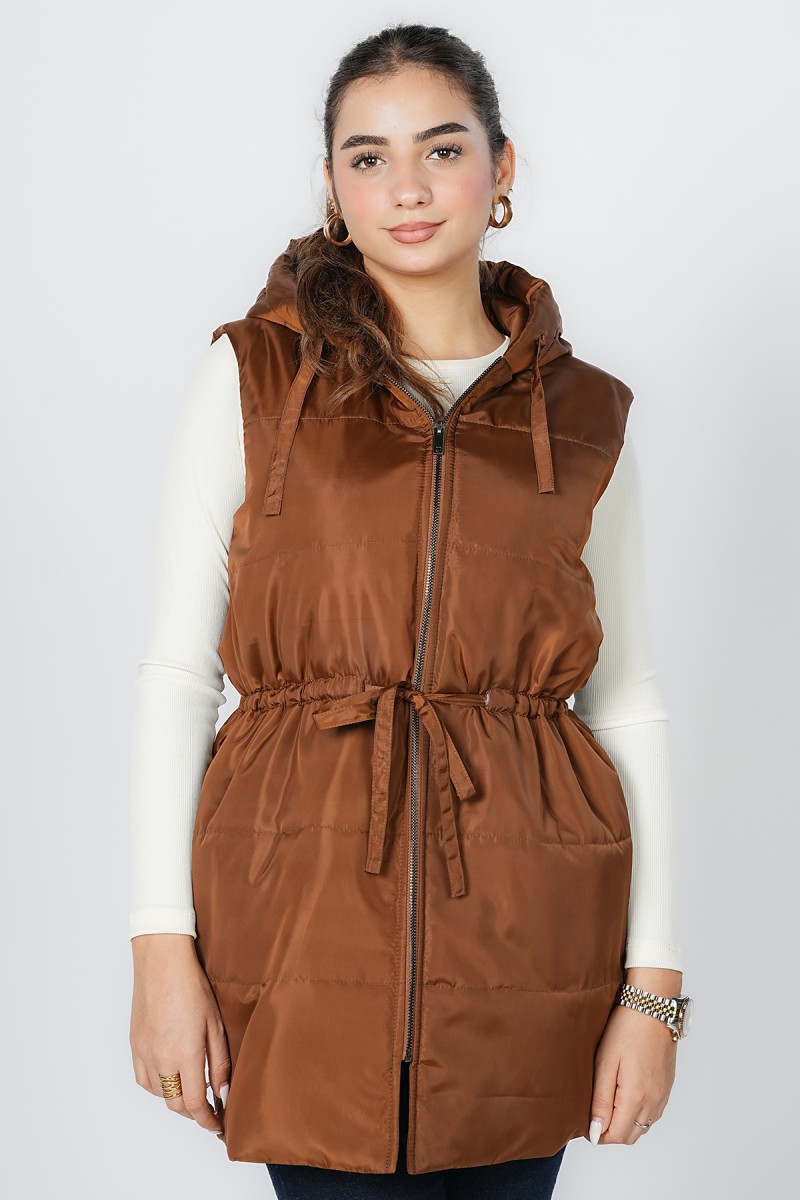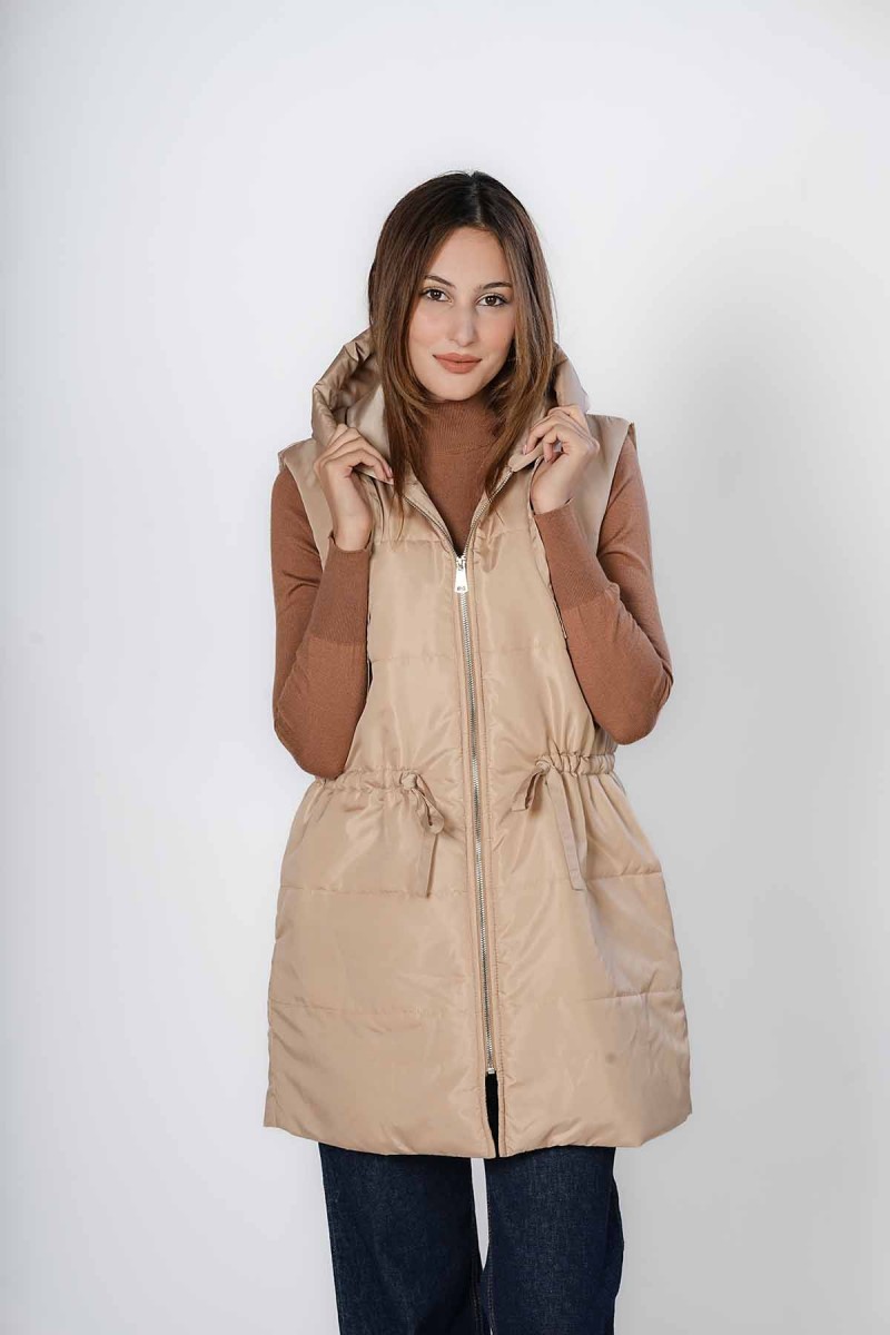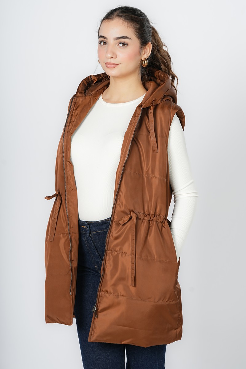 Ceci est une doudoune sans manches matelassé de coupe longue. Elle est dotée d'une capuche et d'une fermeture éclair intégrale sur le devant. Un cordon de serrage réglable est placé à la taille pour cintrer la silhouette. Elle possède également des poches plaquées sur le devant