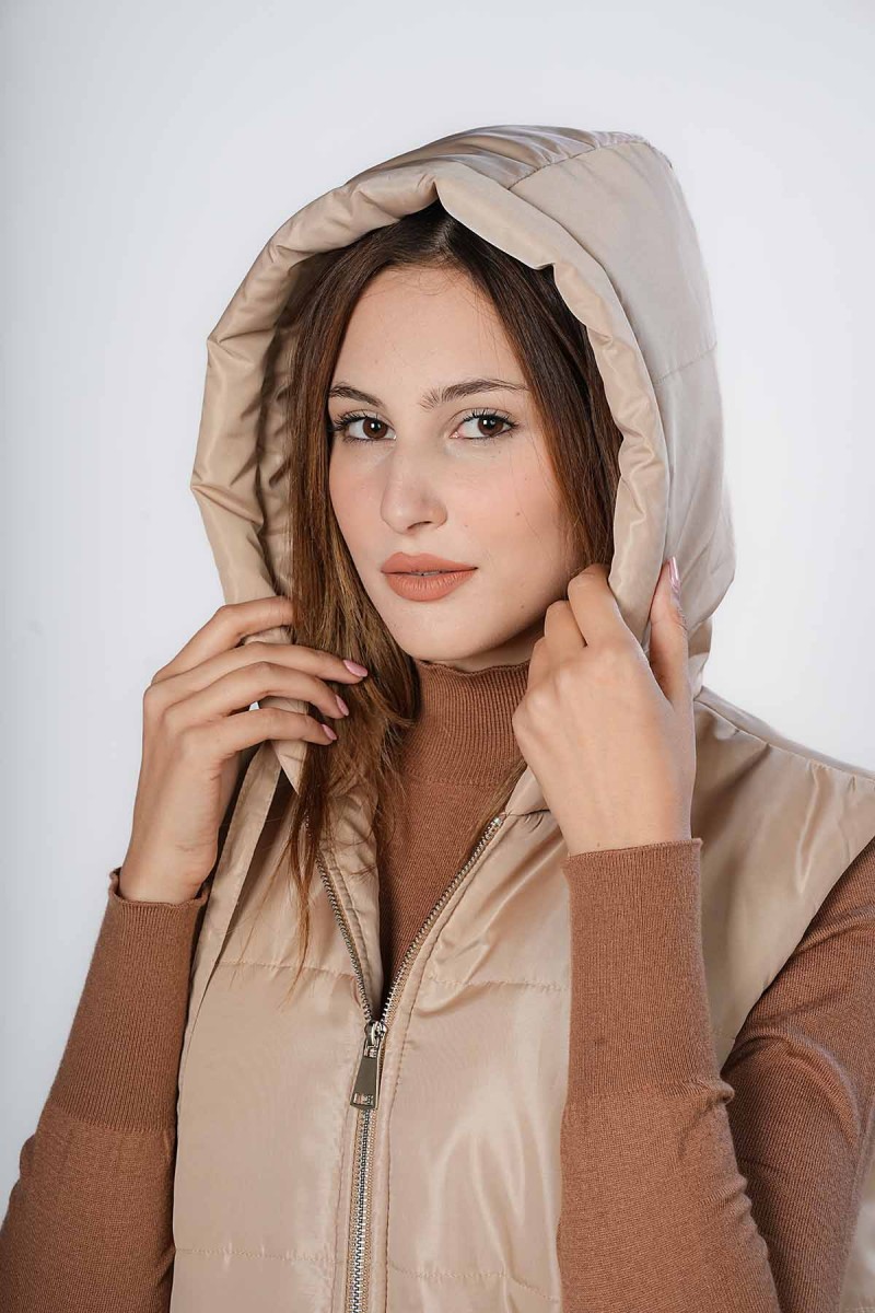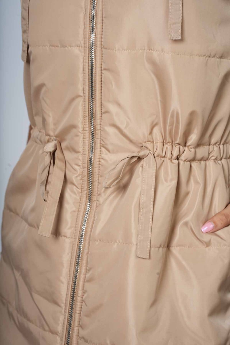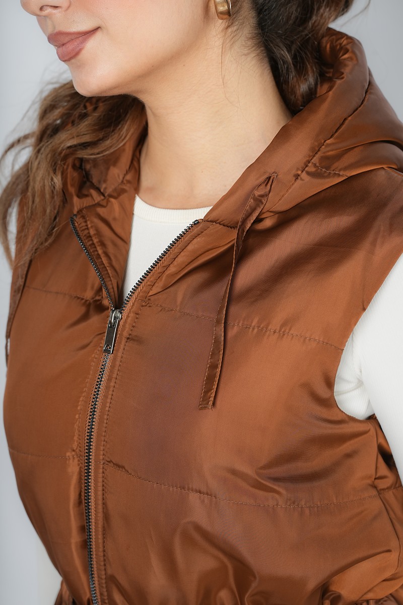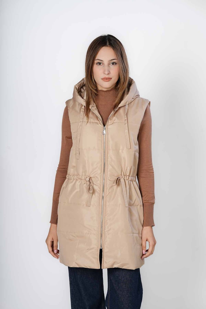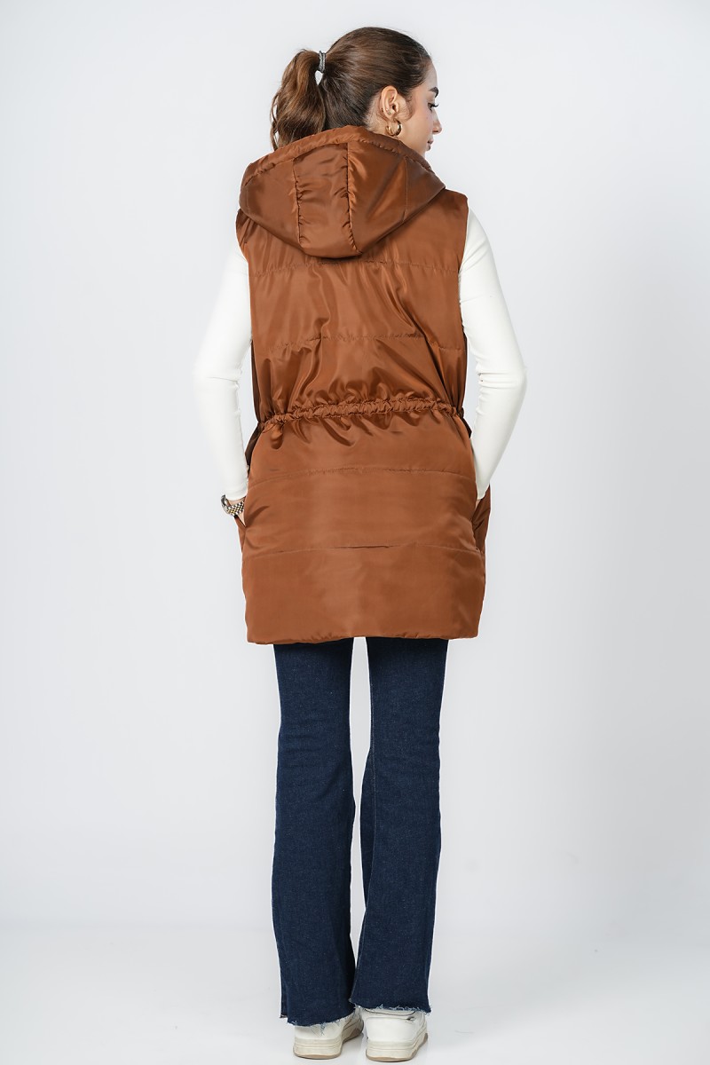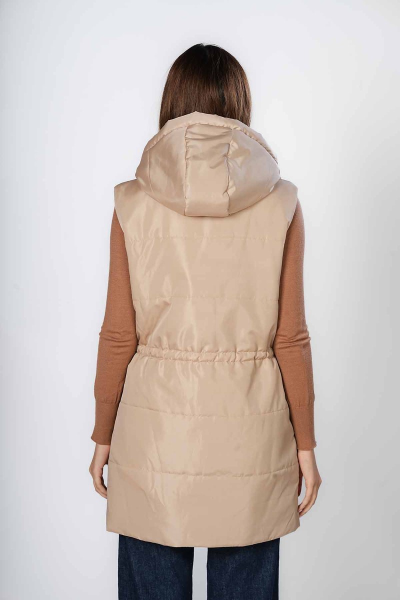 Ceci est une doudoune sans manches matelassé de coupe longue. Elle est dotée d'une capuche et d'une fermeture éclair intégrale sur le devant. Un cordon de serrage réglable est placé à la taille pour cintrer la silhouette. Elle possède également des poches plaquées sur le devant
