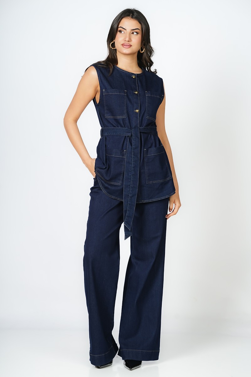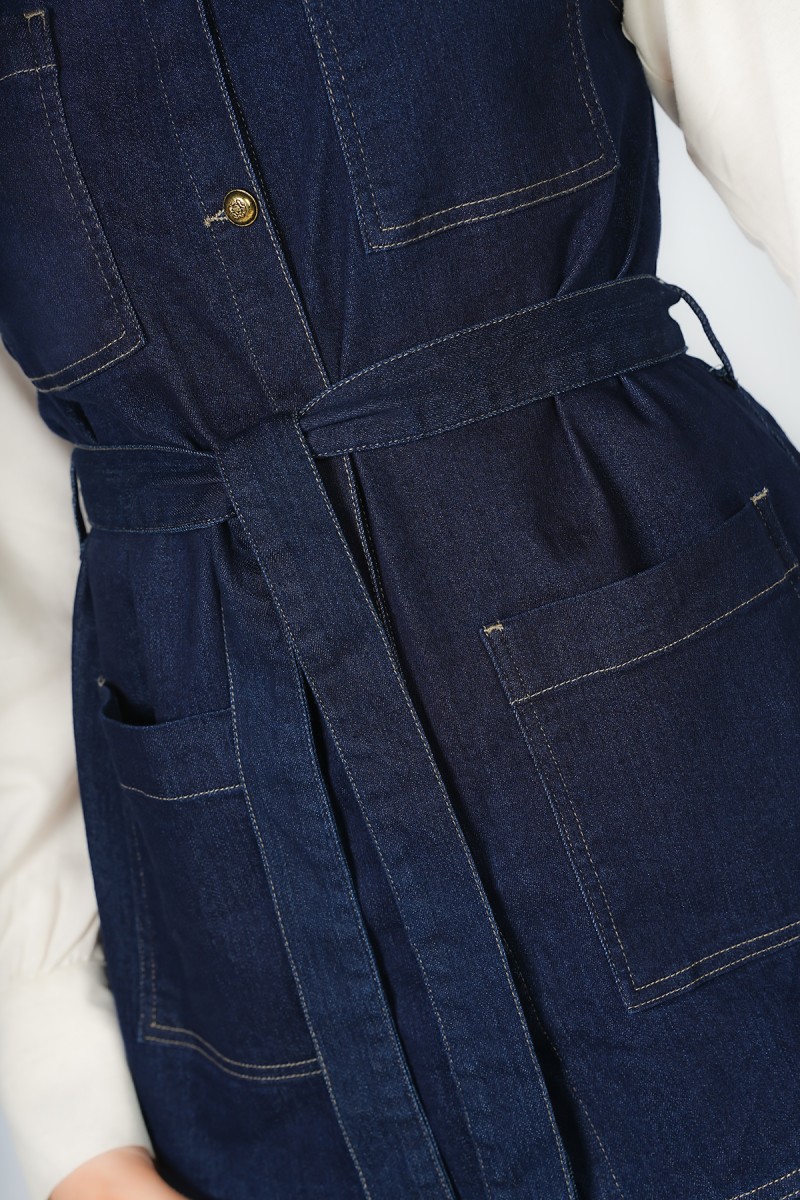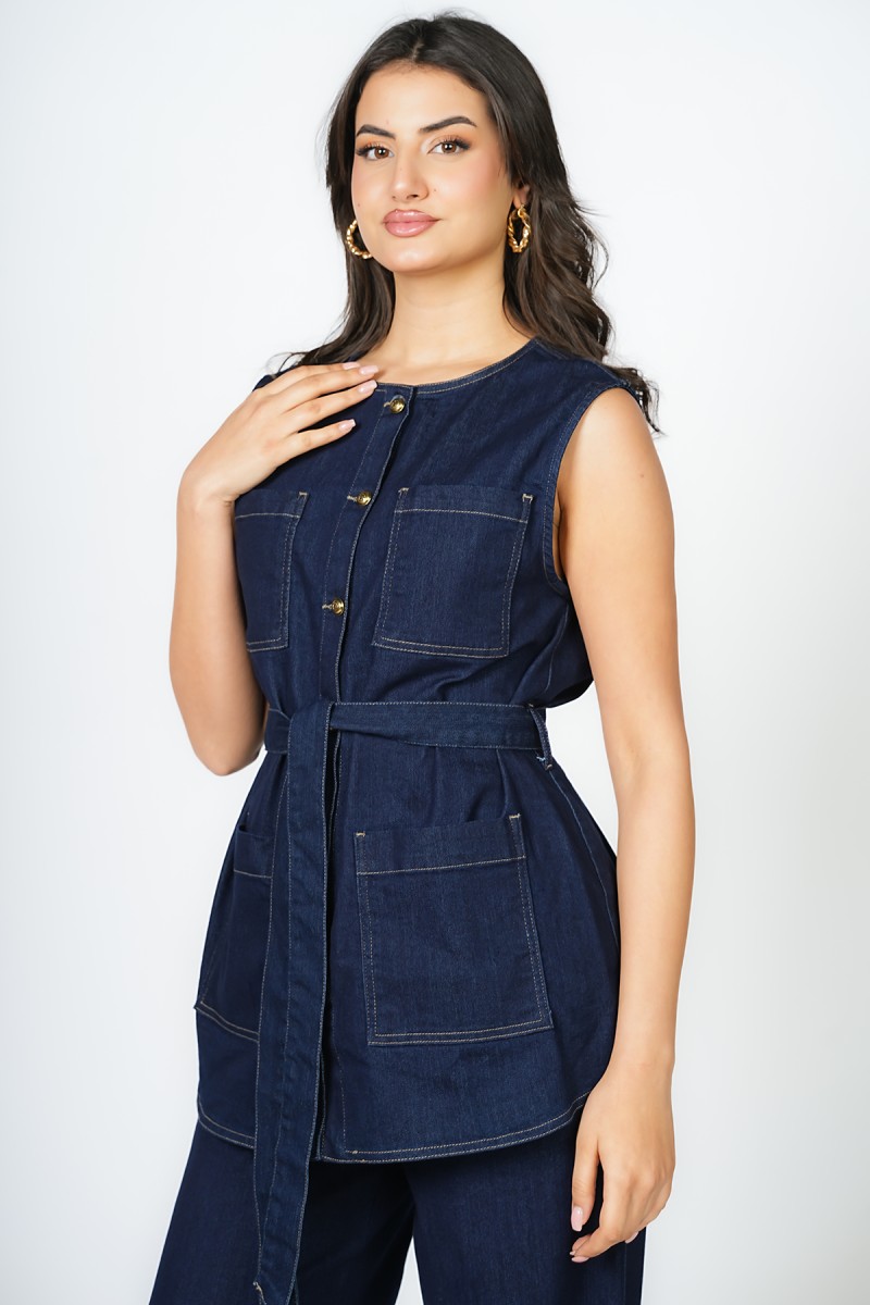 Jacket denim sans manches à col rond, avec deux poches plaquées sur la poitrine et deux poches sur le devant, fermeture avant à boutons dorés et ceinture. Peut se porter avec ou sans chemise.