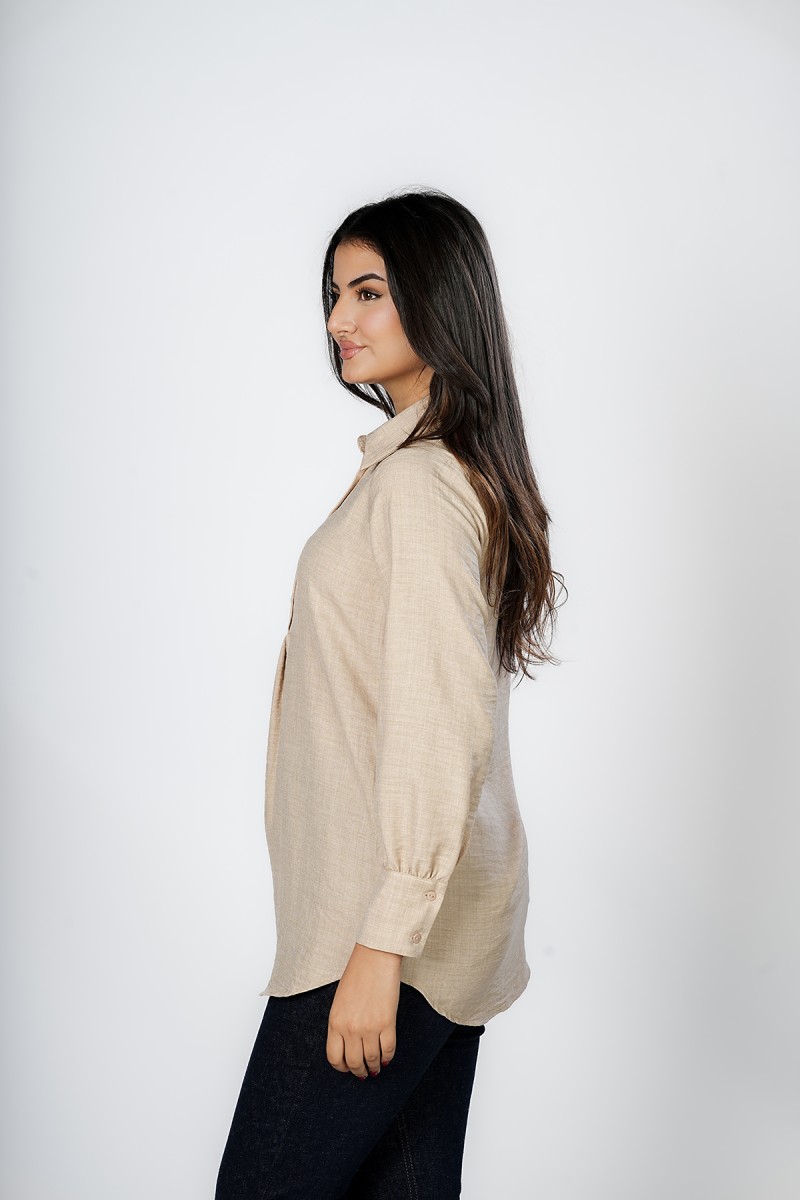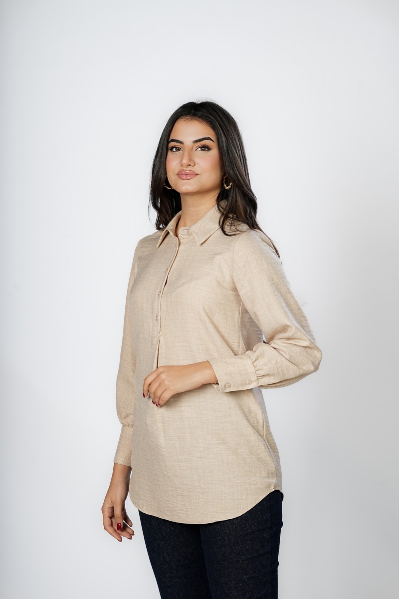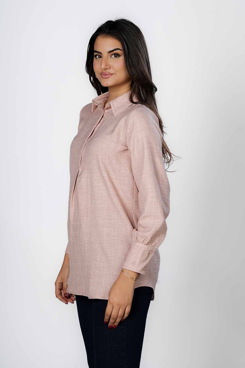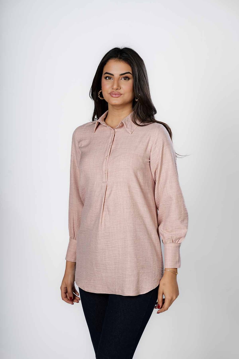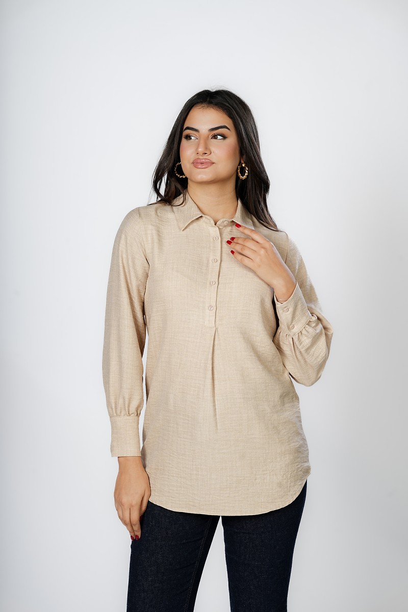 Ceci est une liquette à manches longues avec une coupe longue et ample. Elle présente un col chemisier classique et une patte de boutonnage courte à l'avant, typique d'un style tunisien. La matière semble avoir une texture visible, et les poignets sont resserrés et froncés.