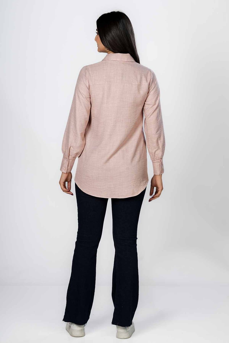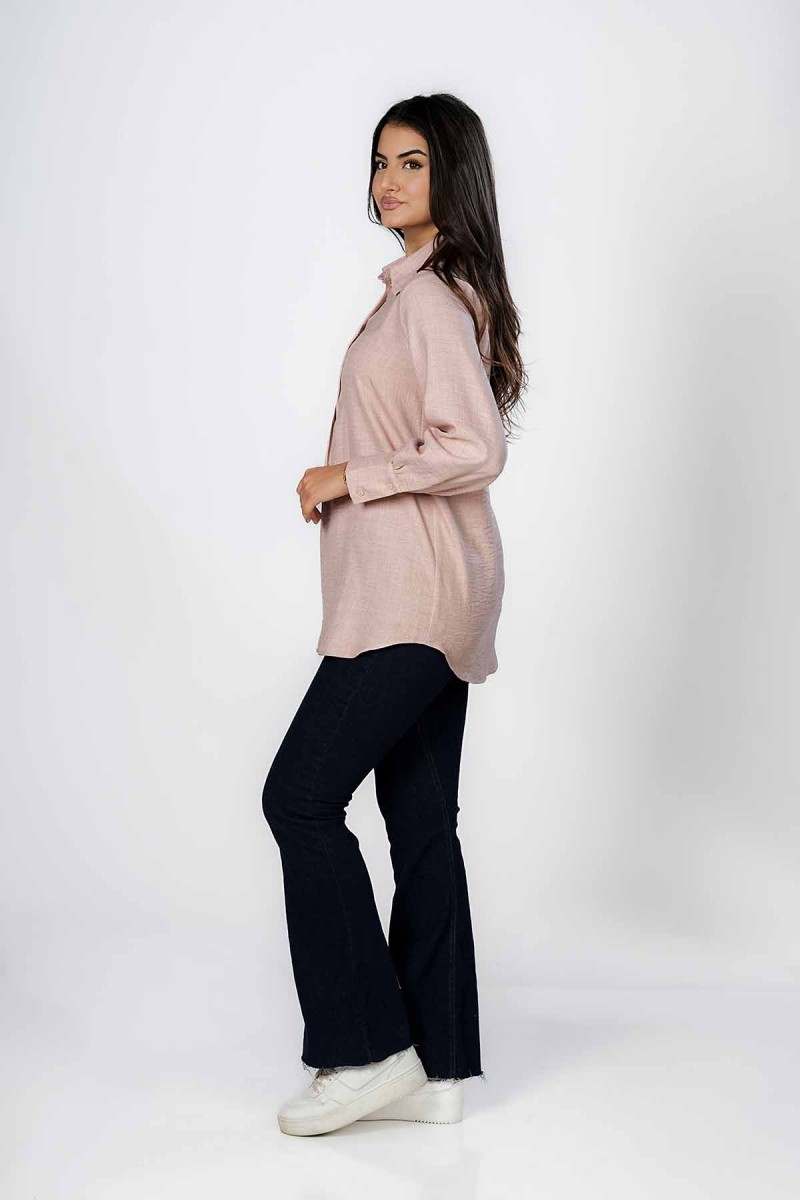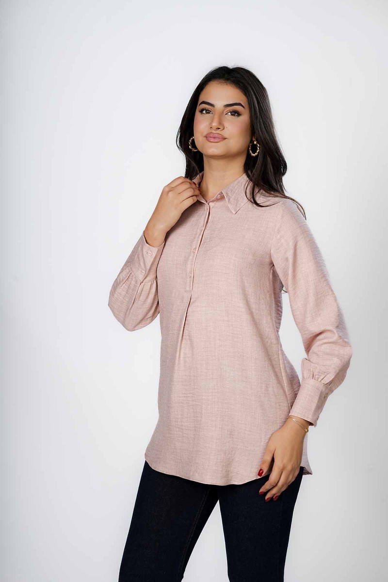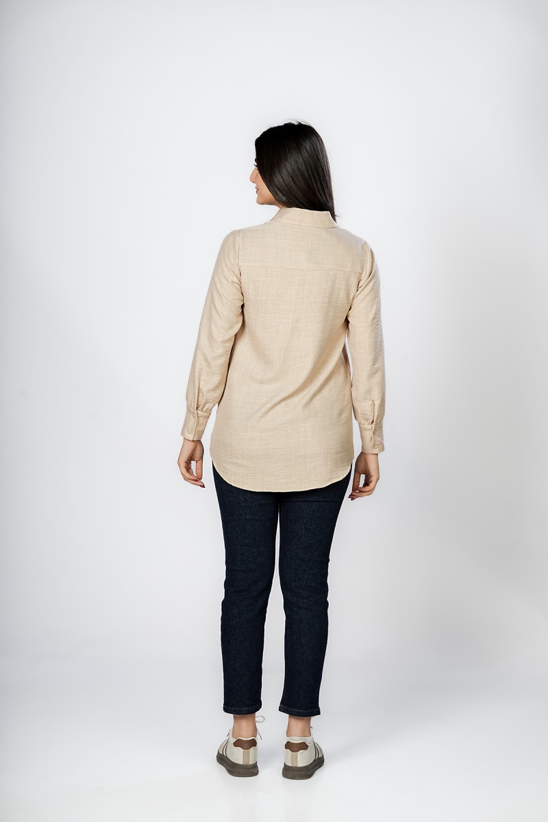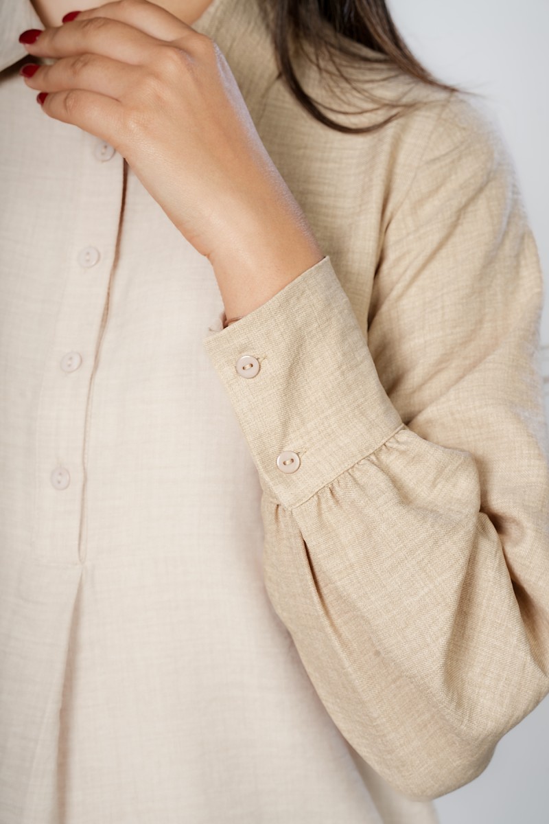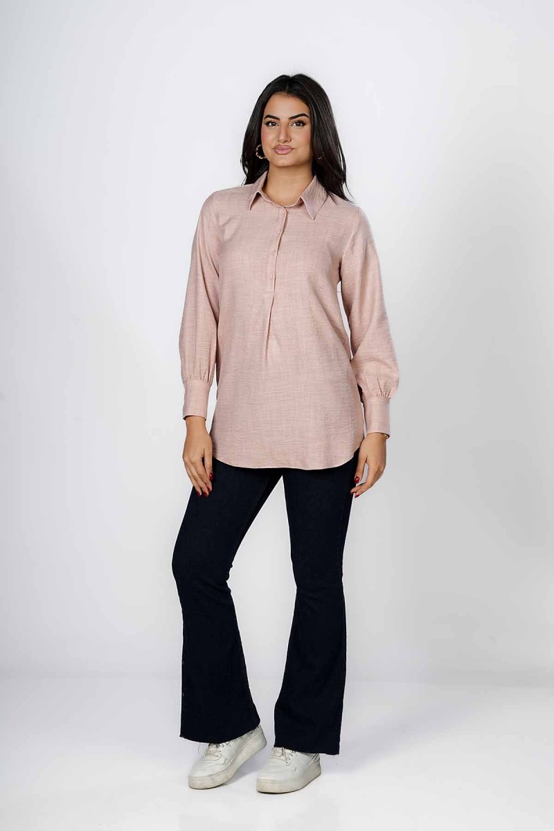 Ceci est une liquette à manches longues avec une coupe longue et ample. Elle présente un col chemisier classique et une patte de boutonnage courte à l'avant, typique d'un style tunisien. La matière semble avoir une texture visible, et les poignets sont resserrés et froncés.