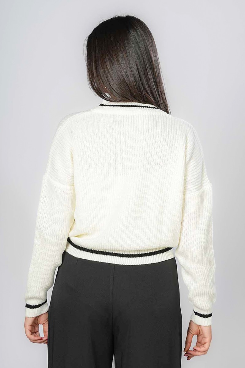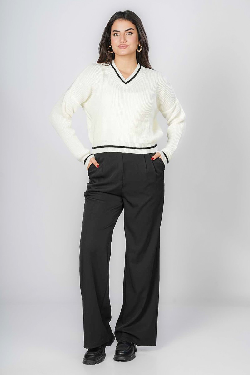 Pull blanc en maille douce avec col V et bandes contrastées noires. Coupe confortable et moderne, idéal pour un look casual chic au quotidien. Parfait à porter avec un jean ou un pantalon tailleur