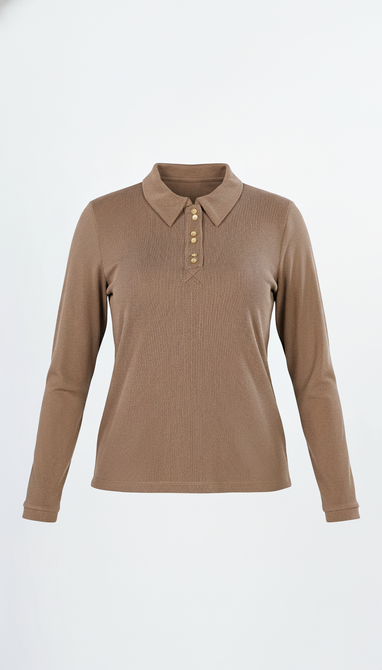 Pull col chemise élégant avec boutons dorés, parfait pour un look décontracté et moderne. Confortable et idéal pour toutes les occasions.
