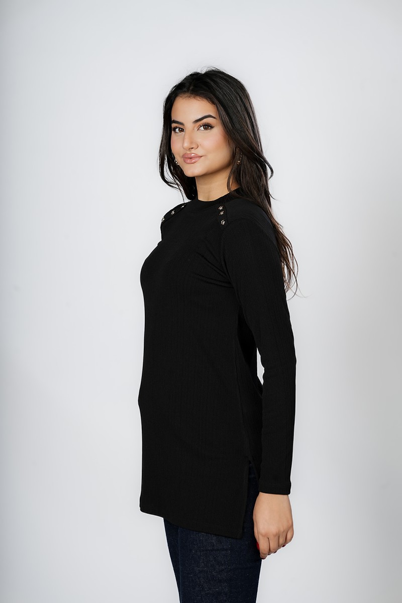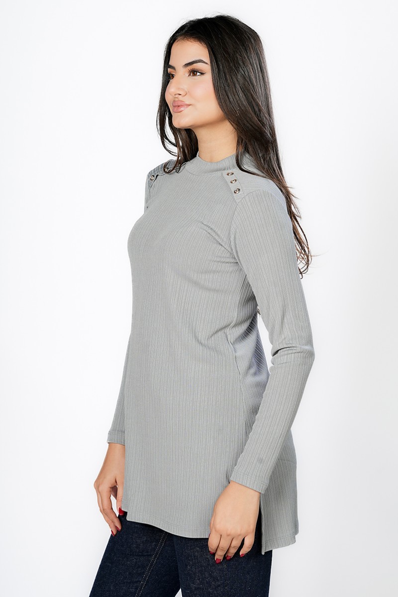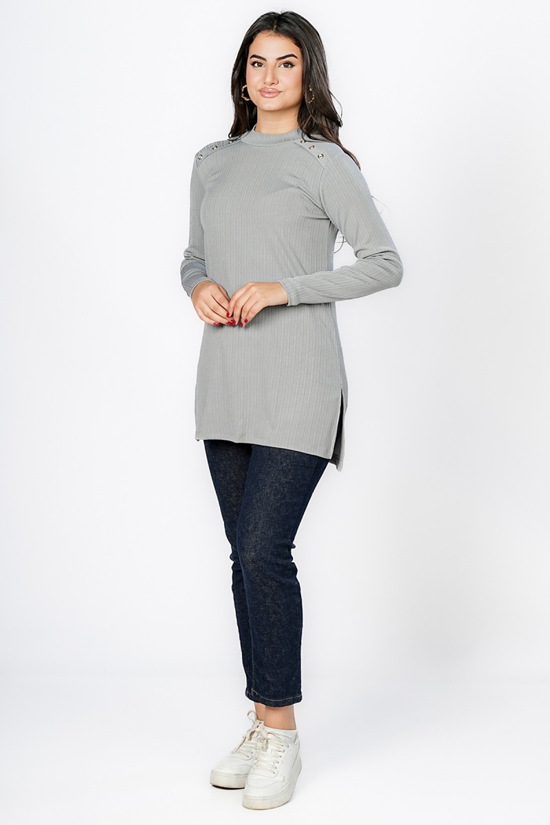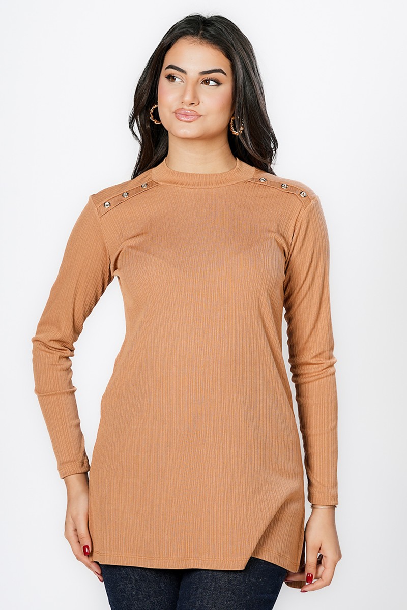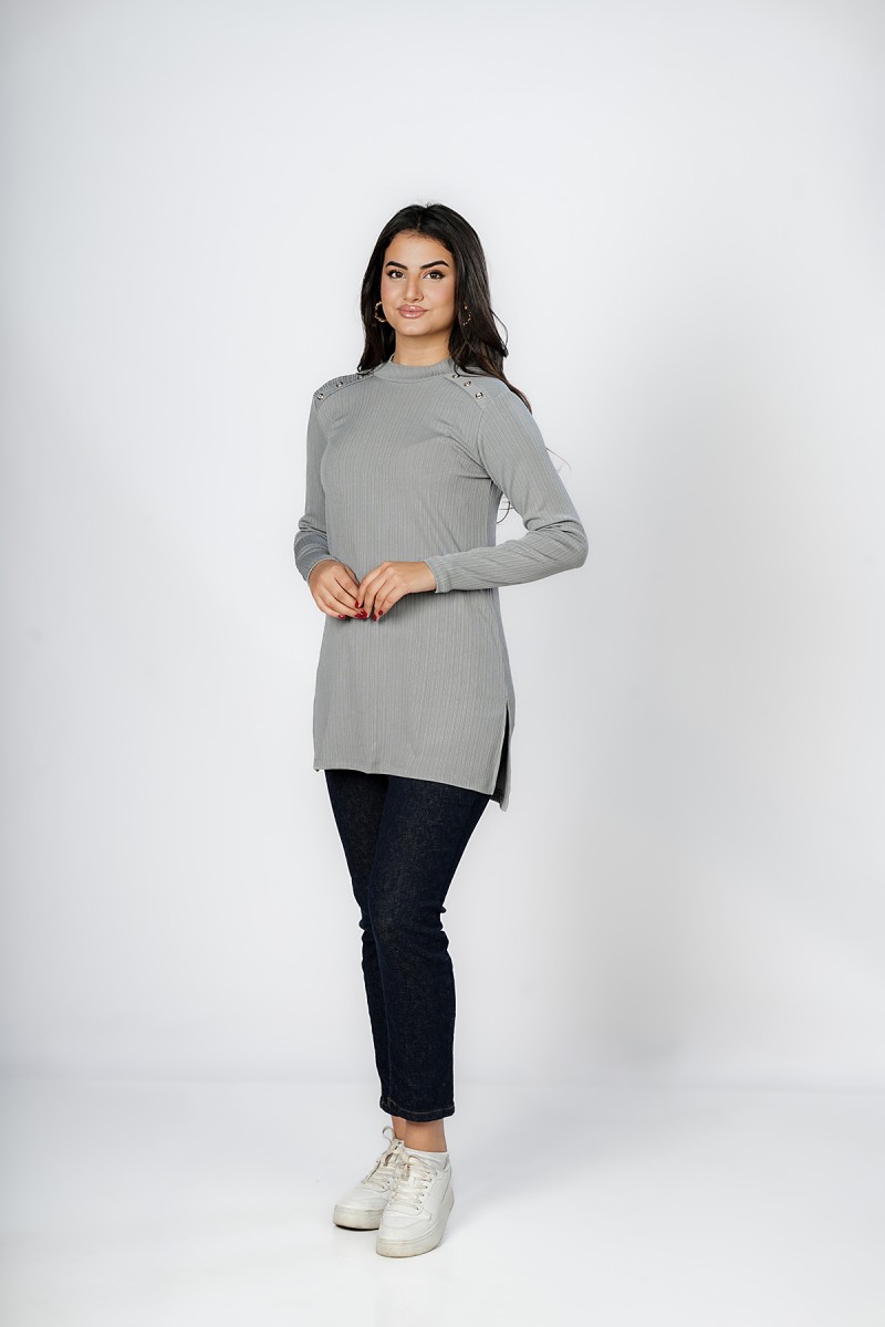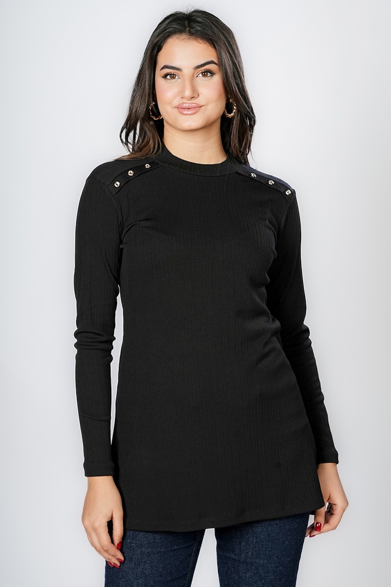 Ceci est un haut tunique côtelé à manches longues avec une coupe ajustée. Il présente un col montant et est orné de boutons-pression métalliques décoratifs sur les épaules. Le vêtement est long et possède des fentes latérales à l'ourlet