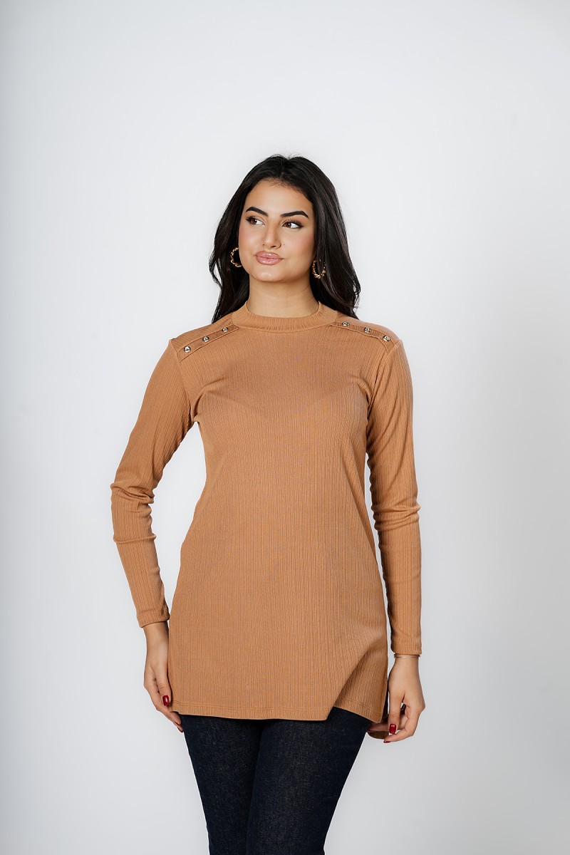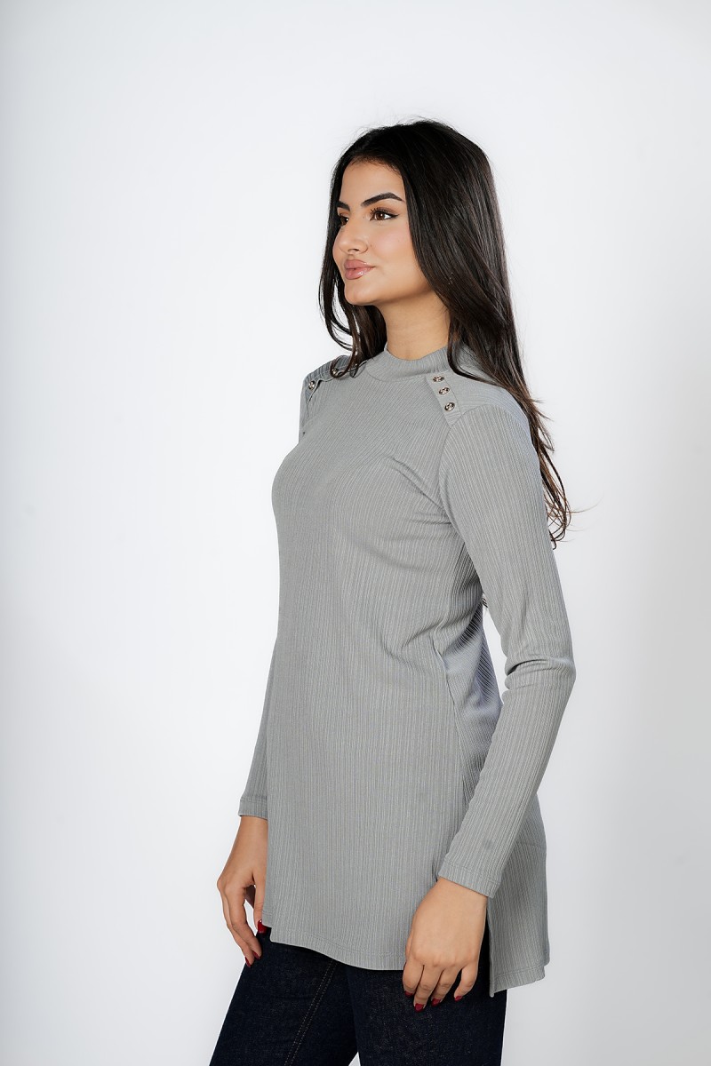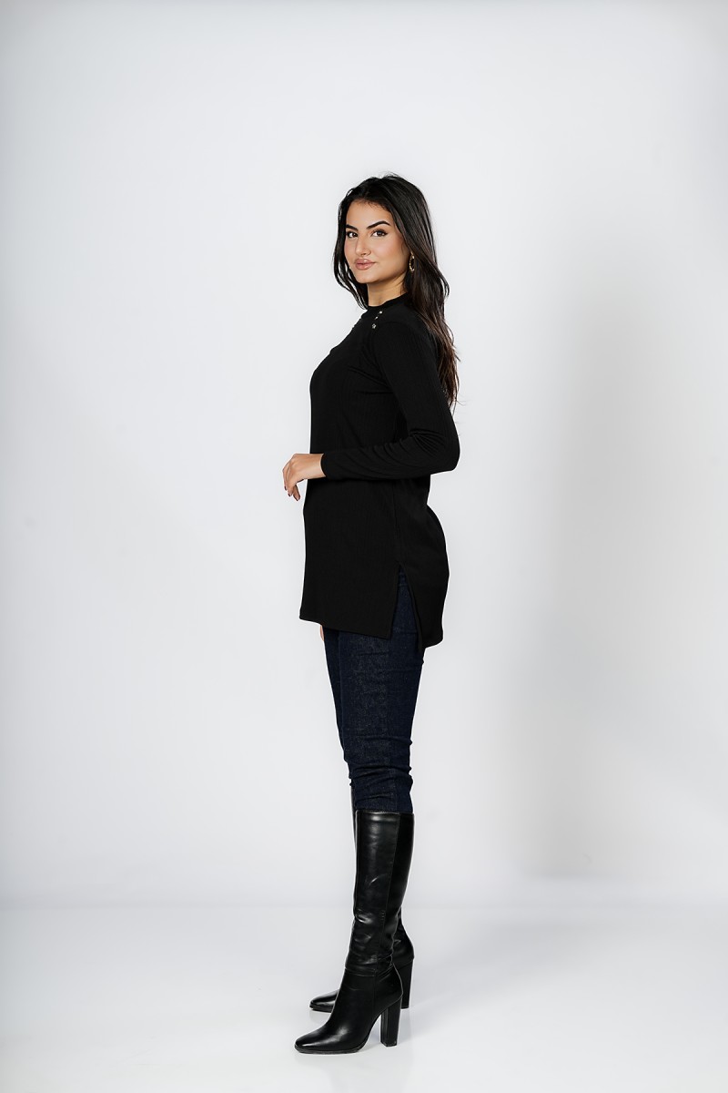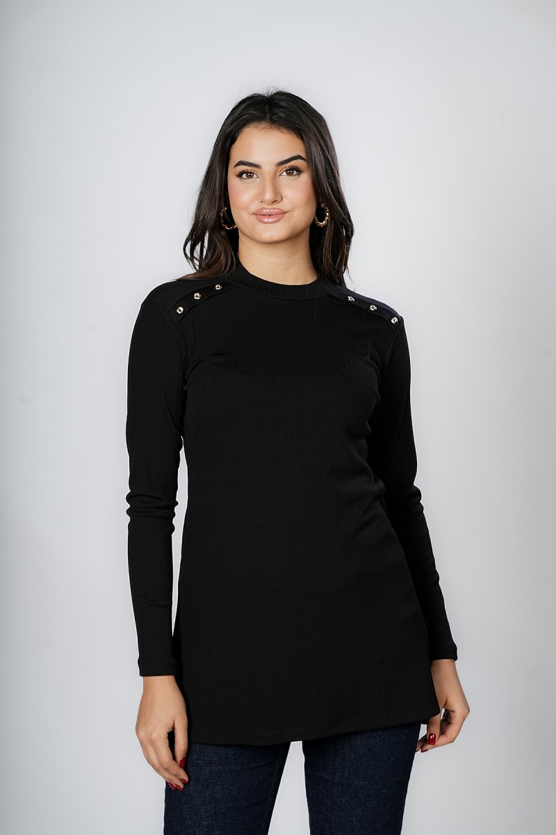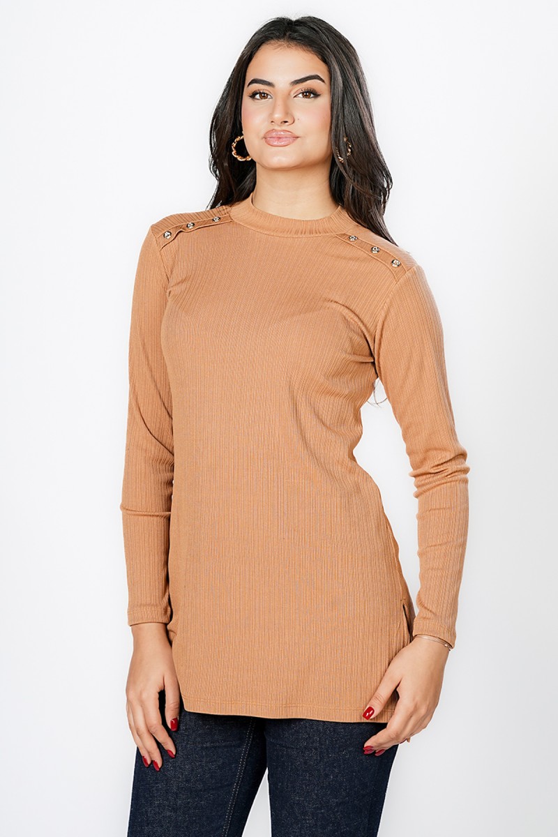 Ceci est un haut tunique côtelé à manches longues avec une coupe ajustée. Il présente un col montant et est orné de boutons-pression métalliques décoratifs sur les épaules. Le vêtement est long et possède des fentes latérales à l'ourlet