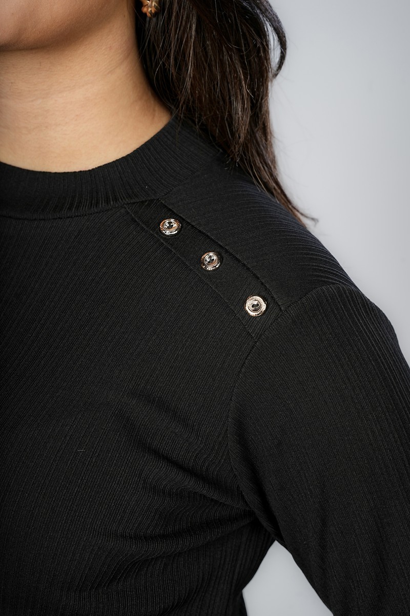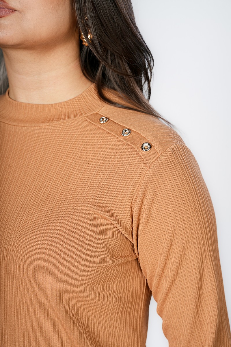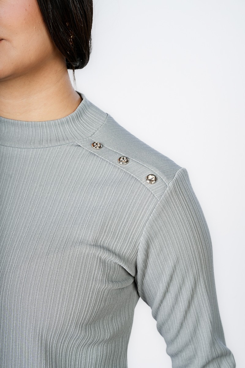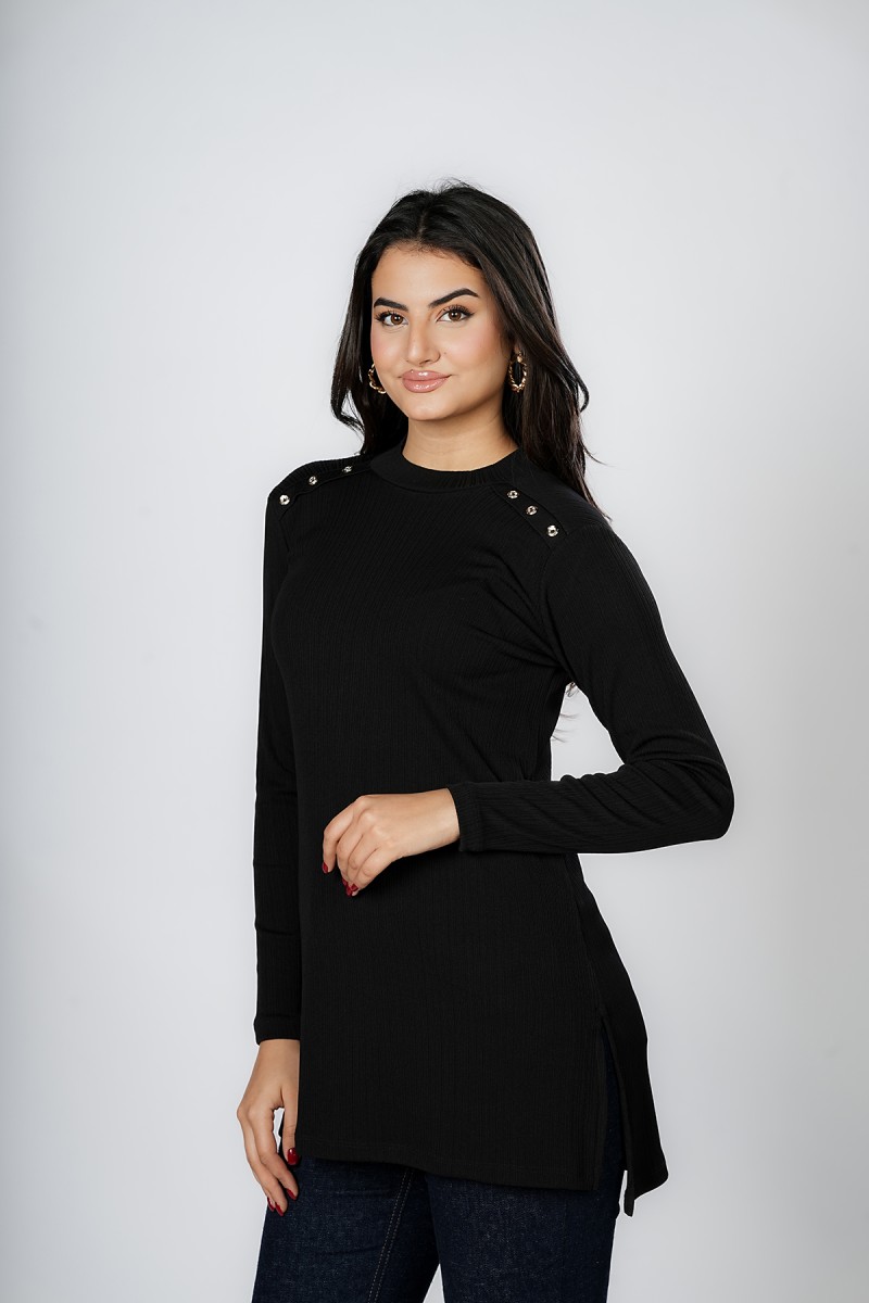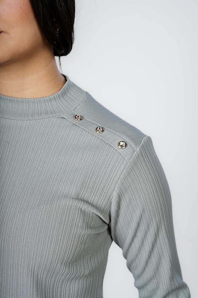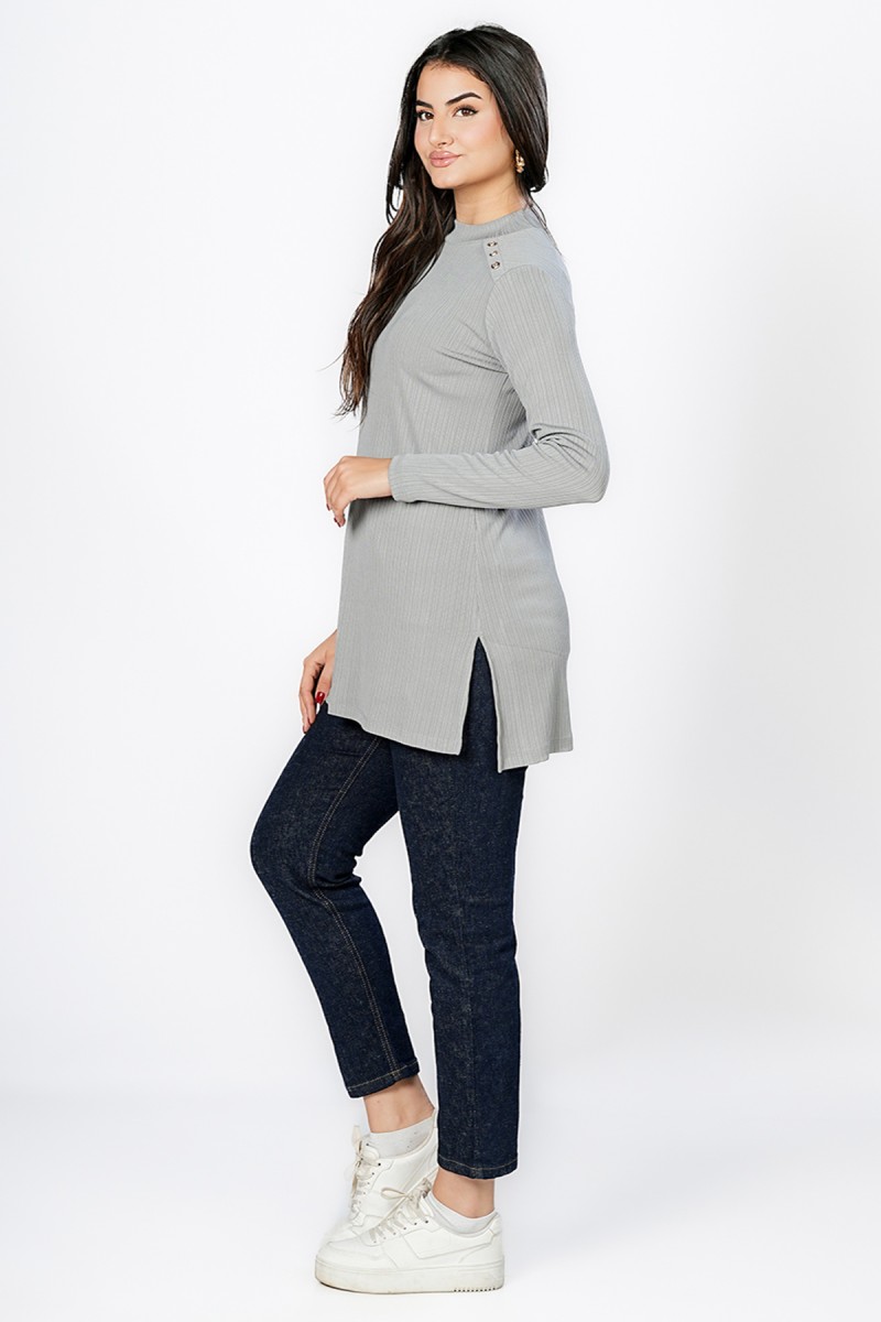 Ceci est un haut tunique côtelé à manches longues avec une coupe ajustée. Il présente un col montant et est orné de boutons-pression métalliques décoratifs sur les épaules. Le vêtement est long et possède des fentes latérales à l'ourlet