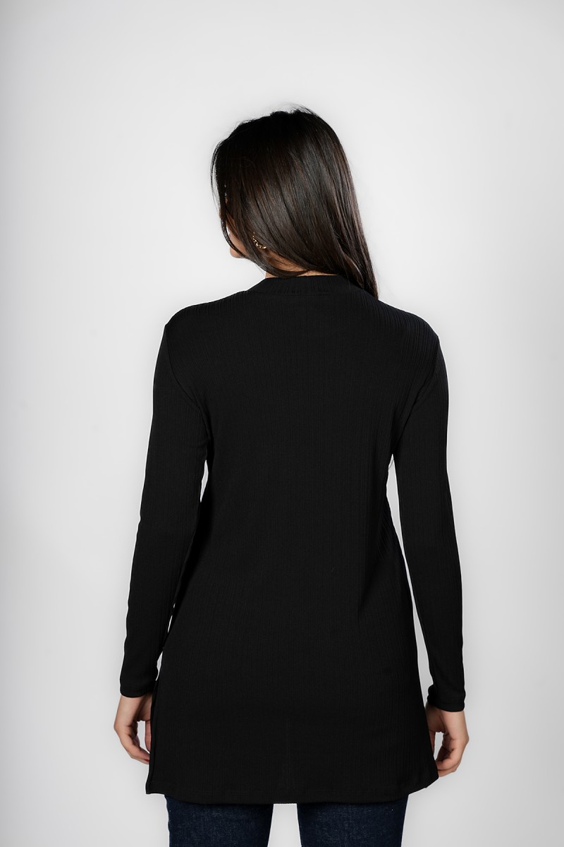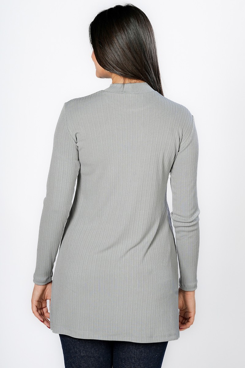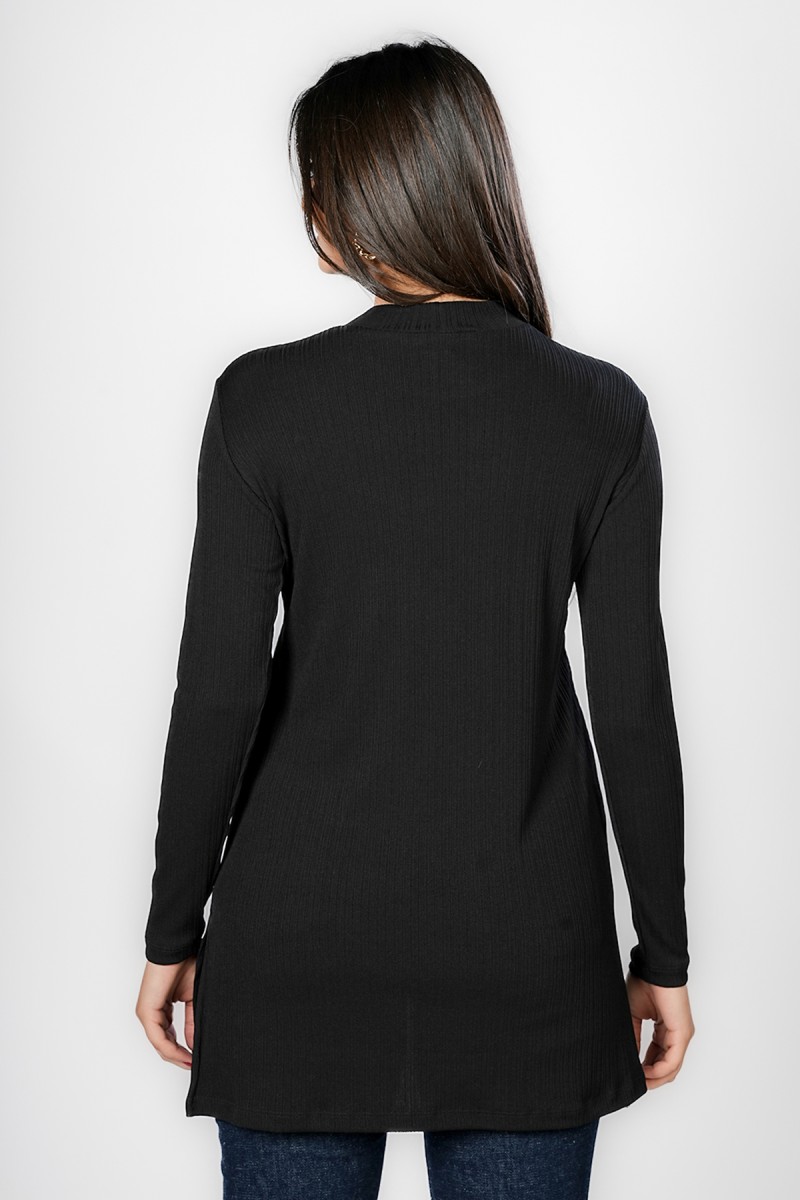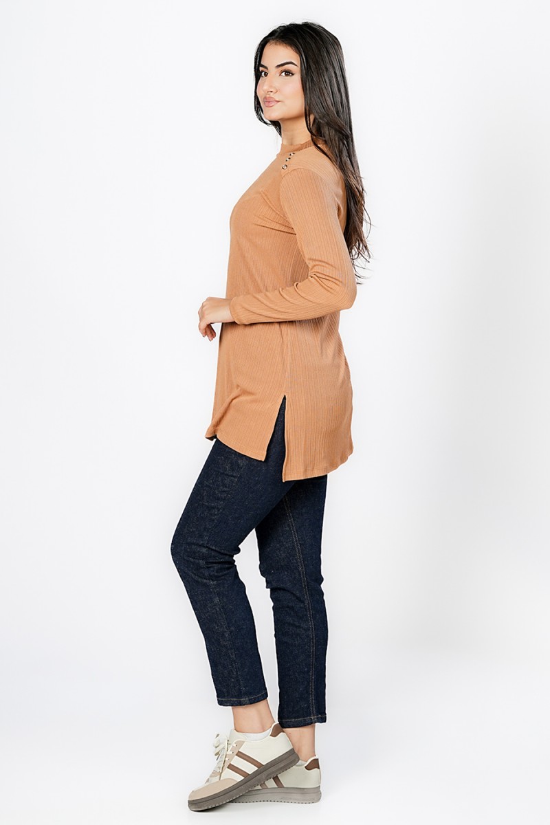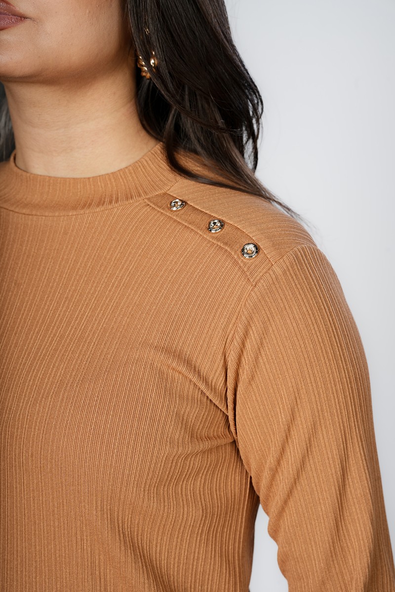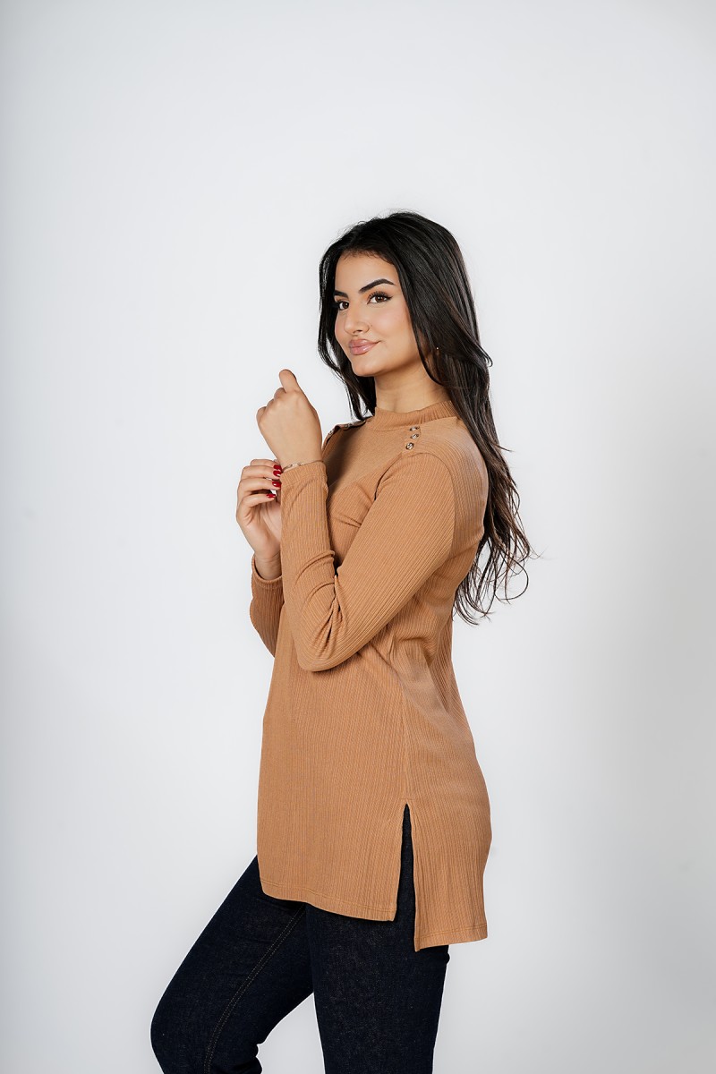 Ceci est un haut tunique côtelé à manches longues avec une coupe ajustée. Il présente un col montant et est orné de boutons-pression métalliques décoratifs sur les épaules. Le vêtement est long et possède des fentes latérales à l'ourlet